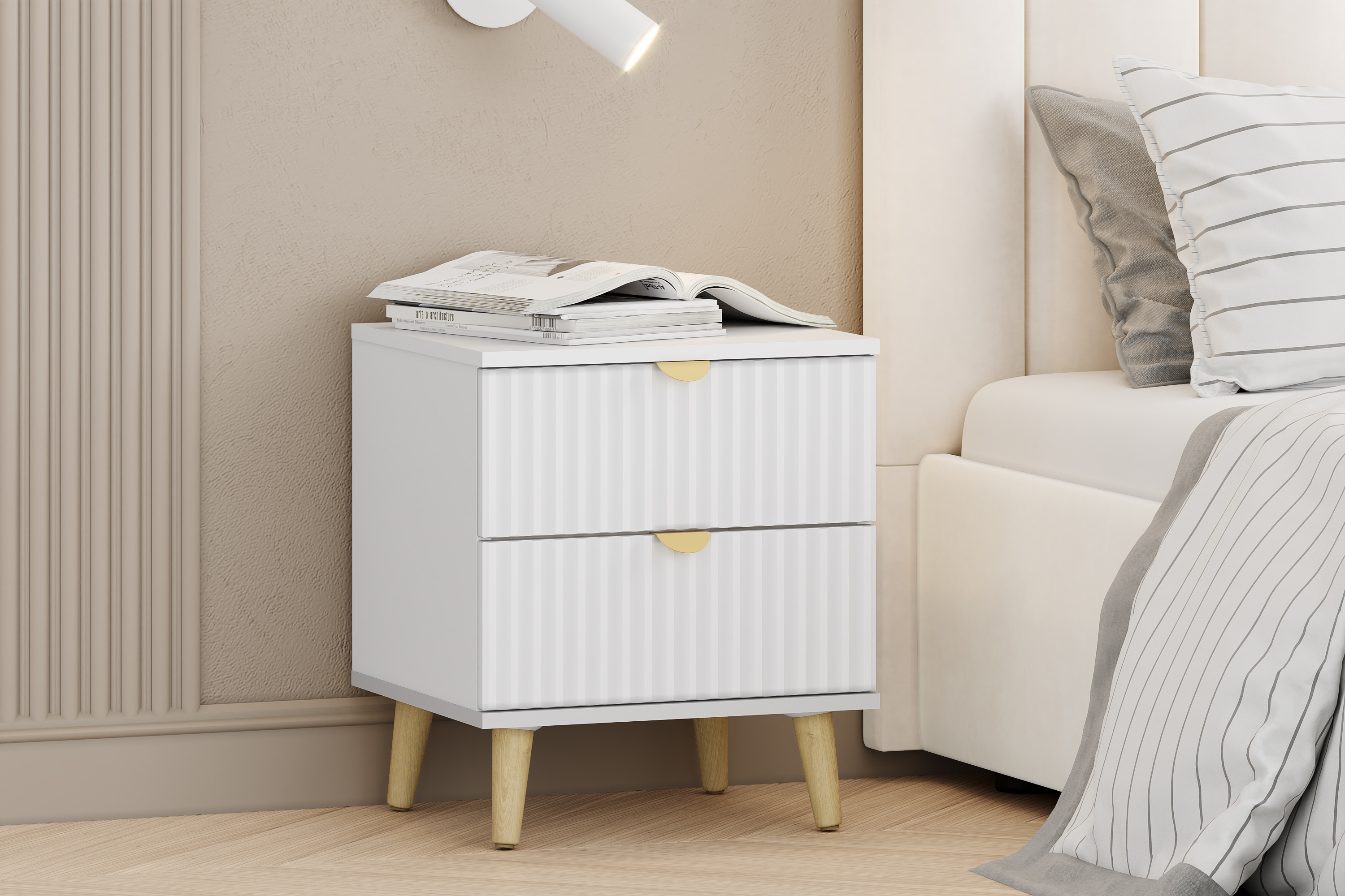 Модульная композиция включает прикроватную тумбу, оснащенную выдвижными ящиками, которые открываются плавно и бесшумно благодаря шариковым направляющим, а в шкафу удобно организовать предметы одежды, при этом высокие опоры облегчают процесс уборки.