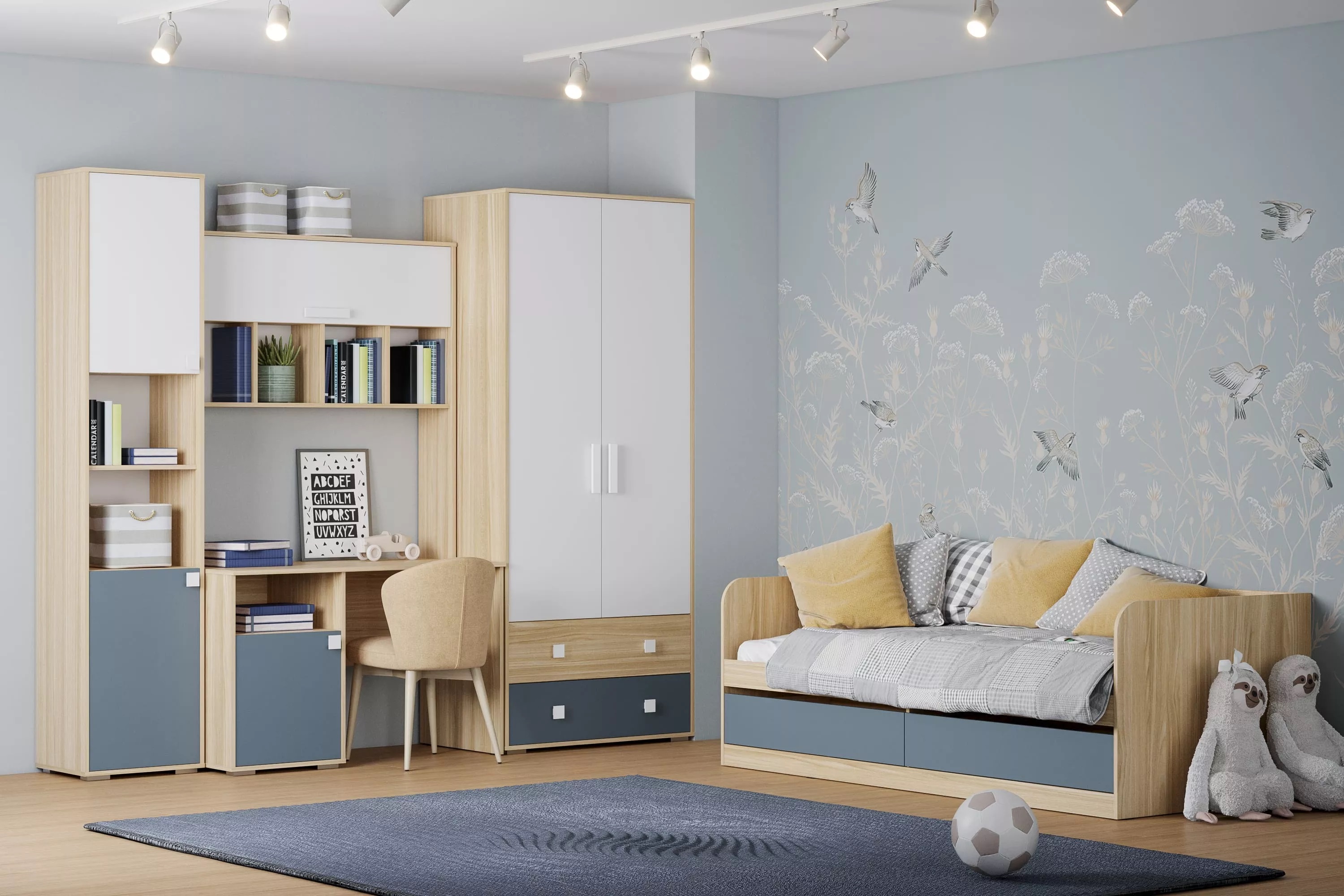 Комплектация №6 включает: кровать с бельевым ящиком, письменный стол с надстройкой, в которой удобно хранить книги и школьные принадлежности, а также два шкафа для оптимизации хранения вещей.