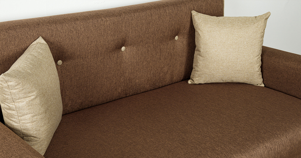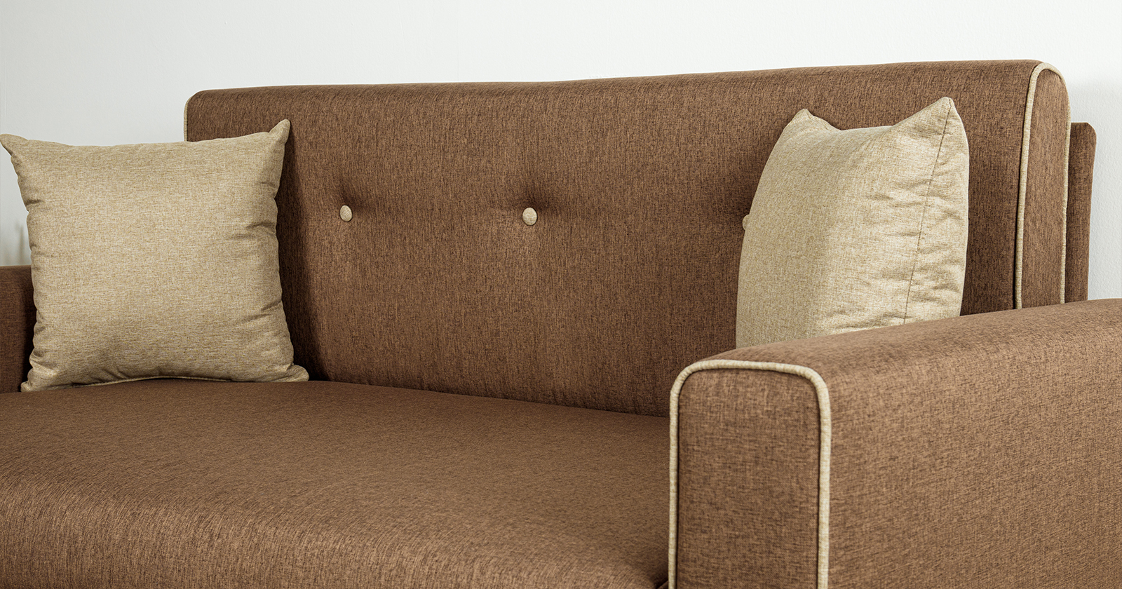 Декоративный контрастный кант по торцу спинки, торцу подлокотника, по верхнему срезу царги. Утяжки с пуговицами на спинке дивана. Две декоративные подушки в контрастной ткани.
