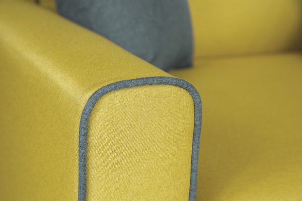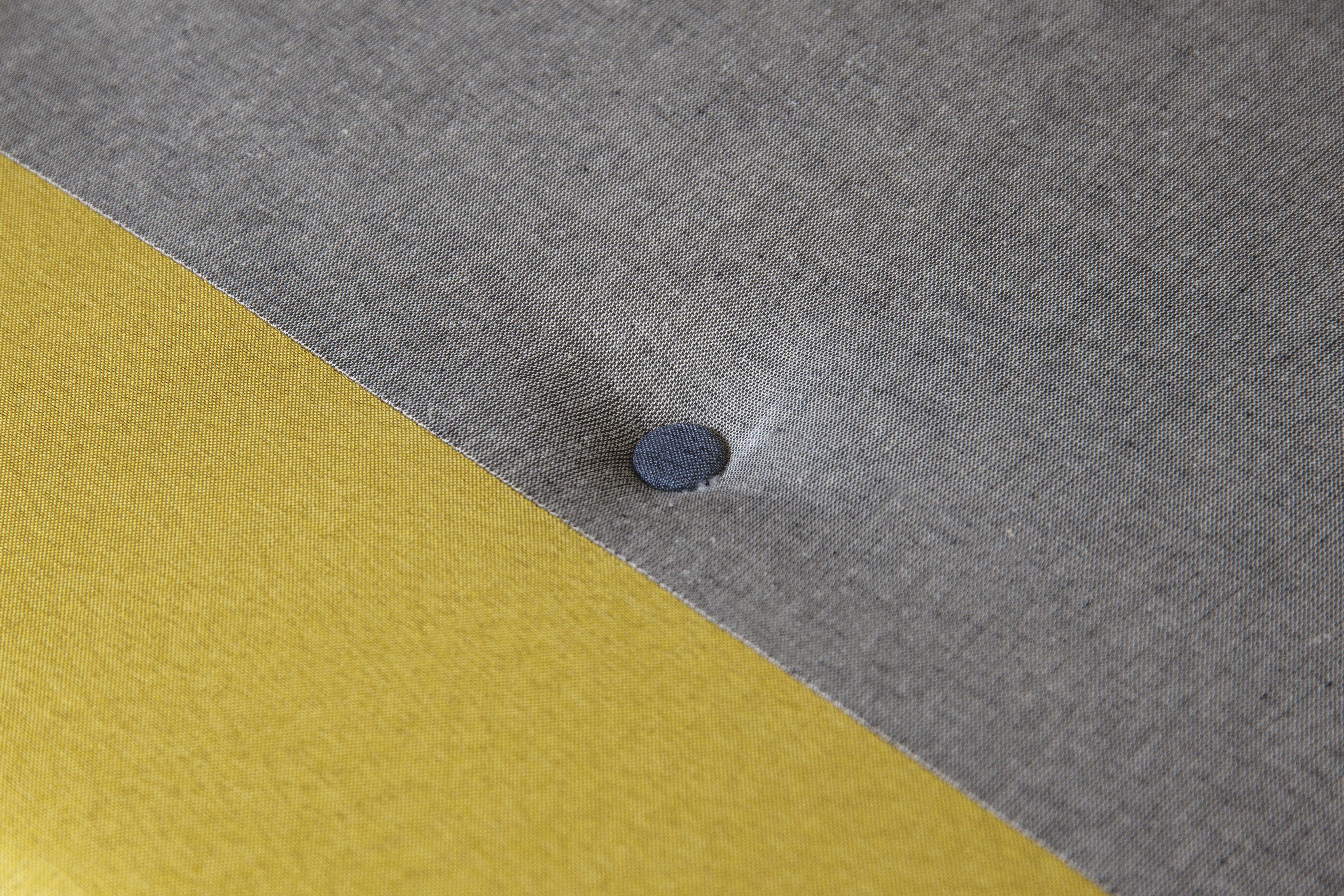 Декоративный контрастный кант по торцу спинки, торцу подлокотника, по верхнему срезу царги. Утяжки с пуговицами на спинке дивана. Две декоративные подушки в контрастной ткани.