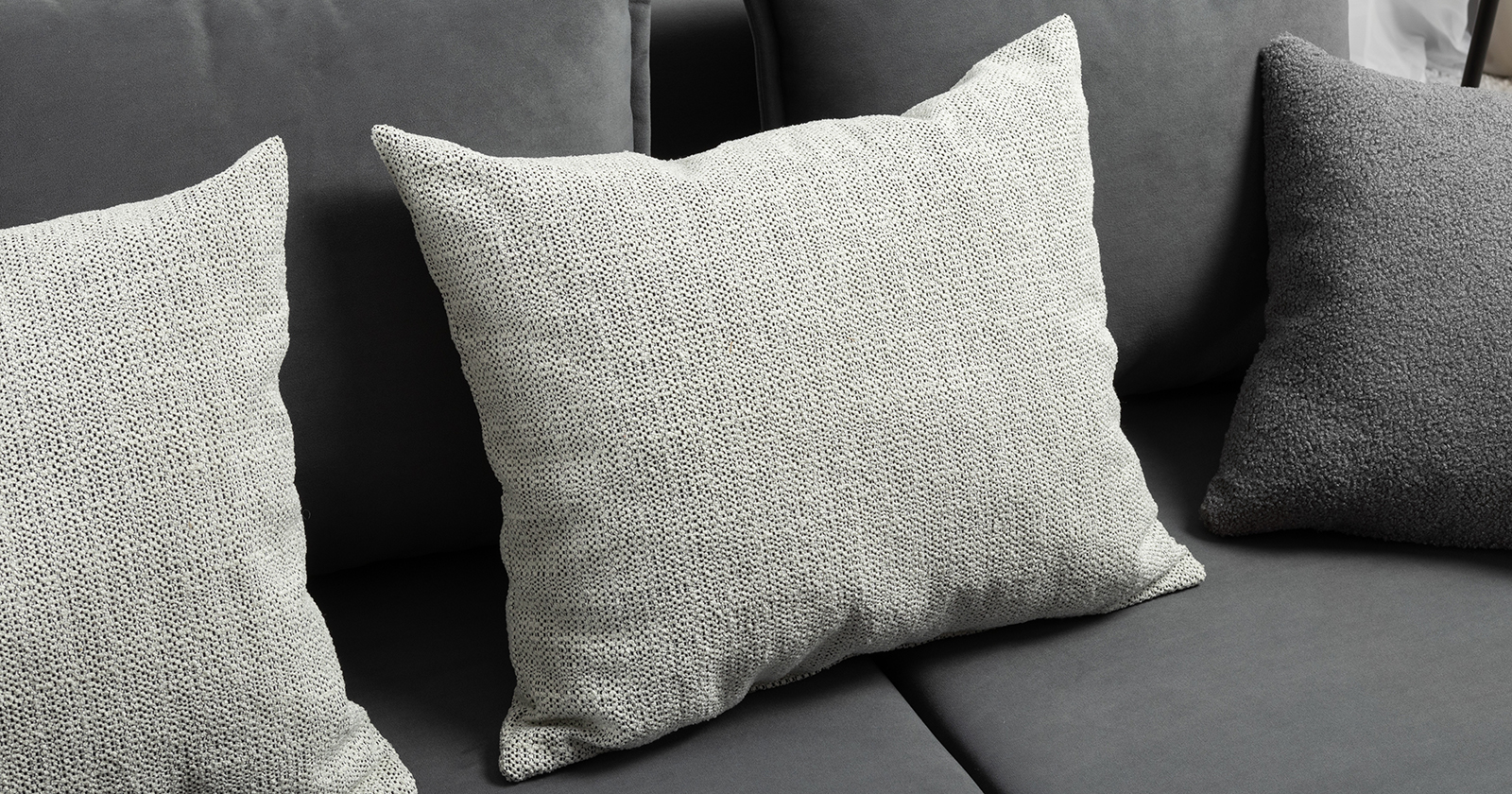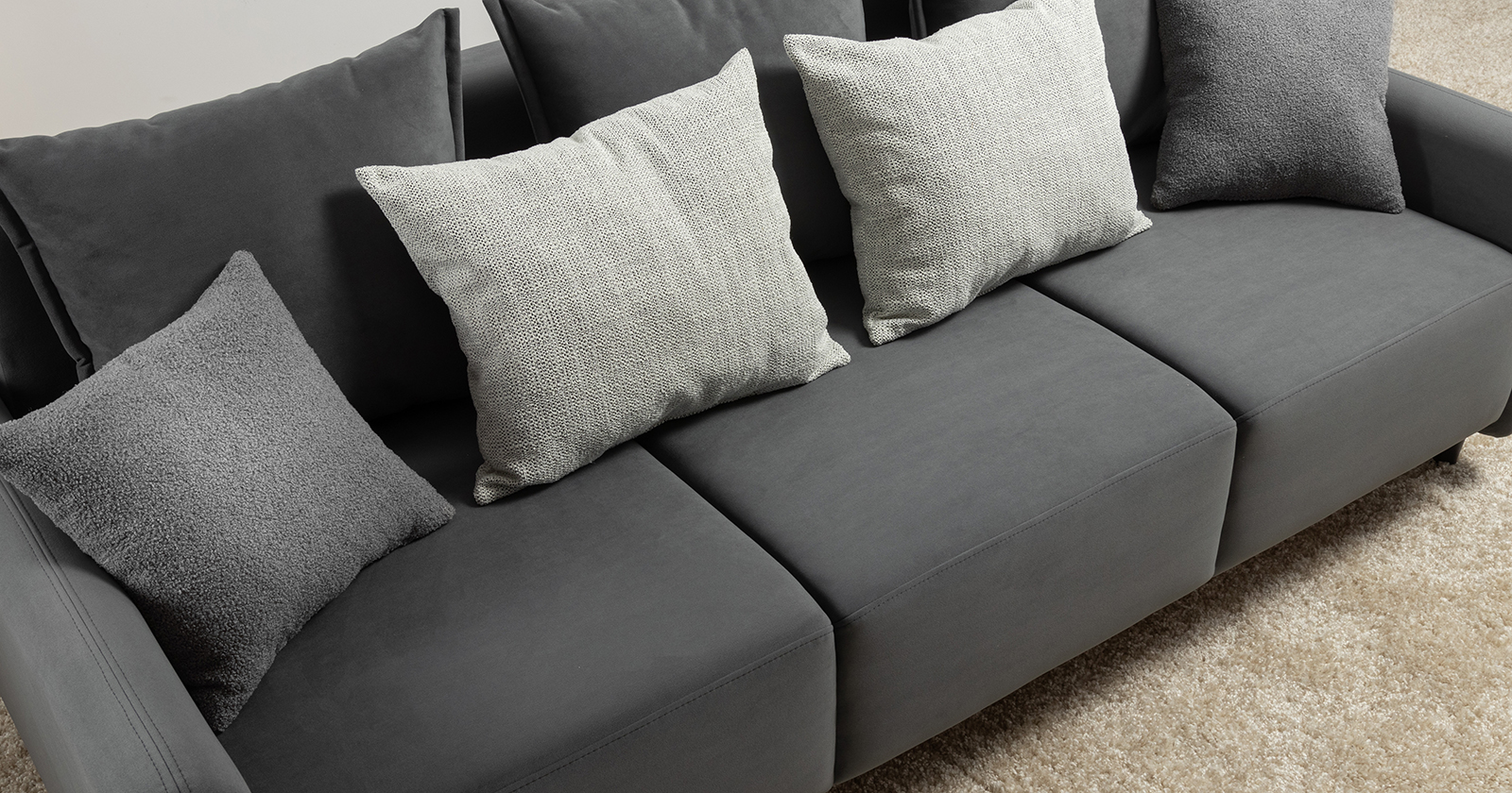 В комплекте 5 двусторонних приспинных подушки и 2 декоративные думки. Задняя спинка в ткани основы. Декоративные отделочные строчки по боковинам и сиденью