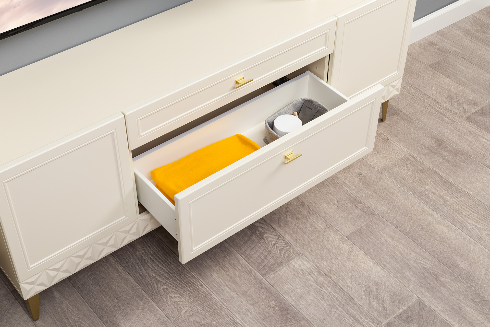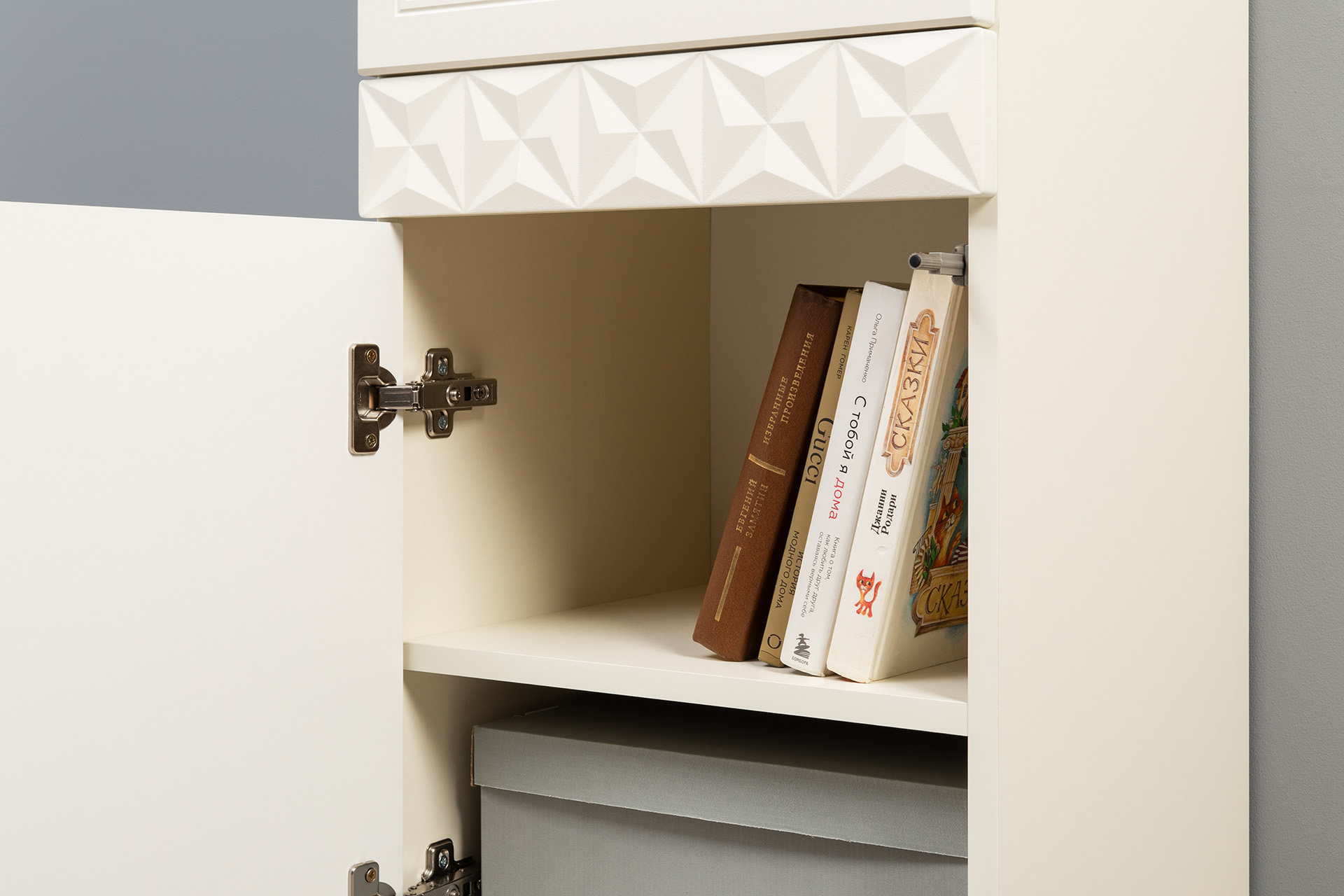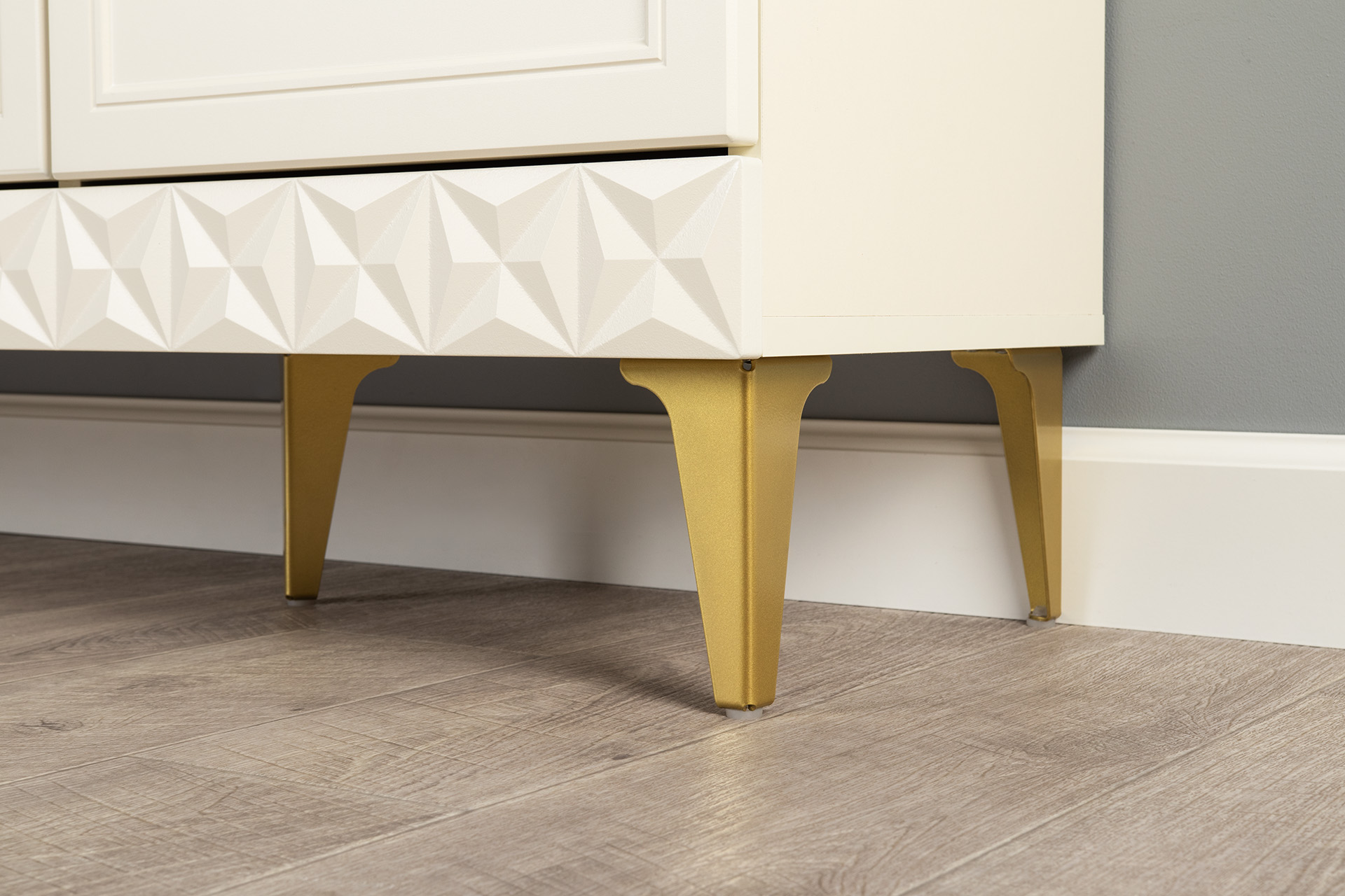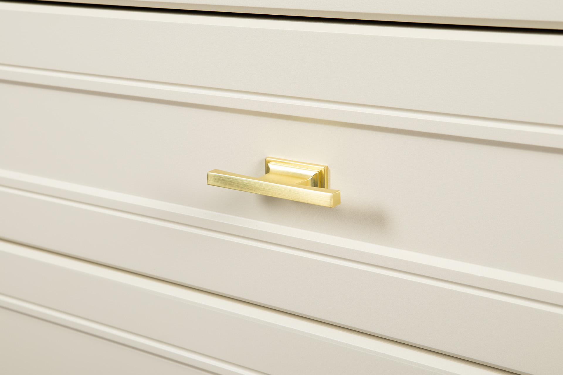 Изящные линии, глубокая фрезеровка фасадов из МДФ и благородные оттенки. Утончённая «Слоновая кость» и изысканная «Олива Шагрень» с глубоким зелёным тоном — создают атмосферу уюта, тепла и благородства. Металлические ручки и опоры золотого цвета придают мебели утончённый блеск, а петли и направляющие с доводчиками обеспечивают плавное и бесшумное закрытие фасадов.
