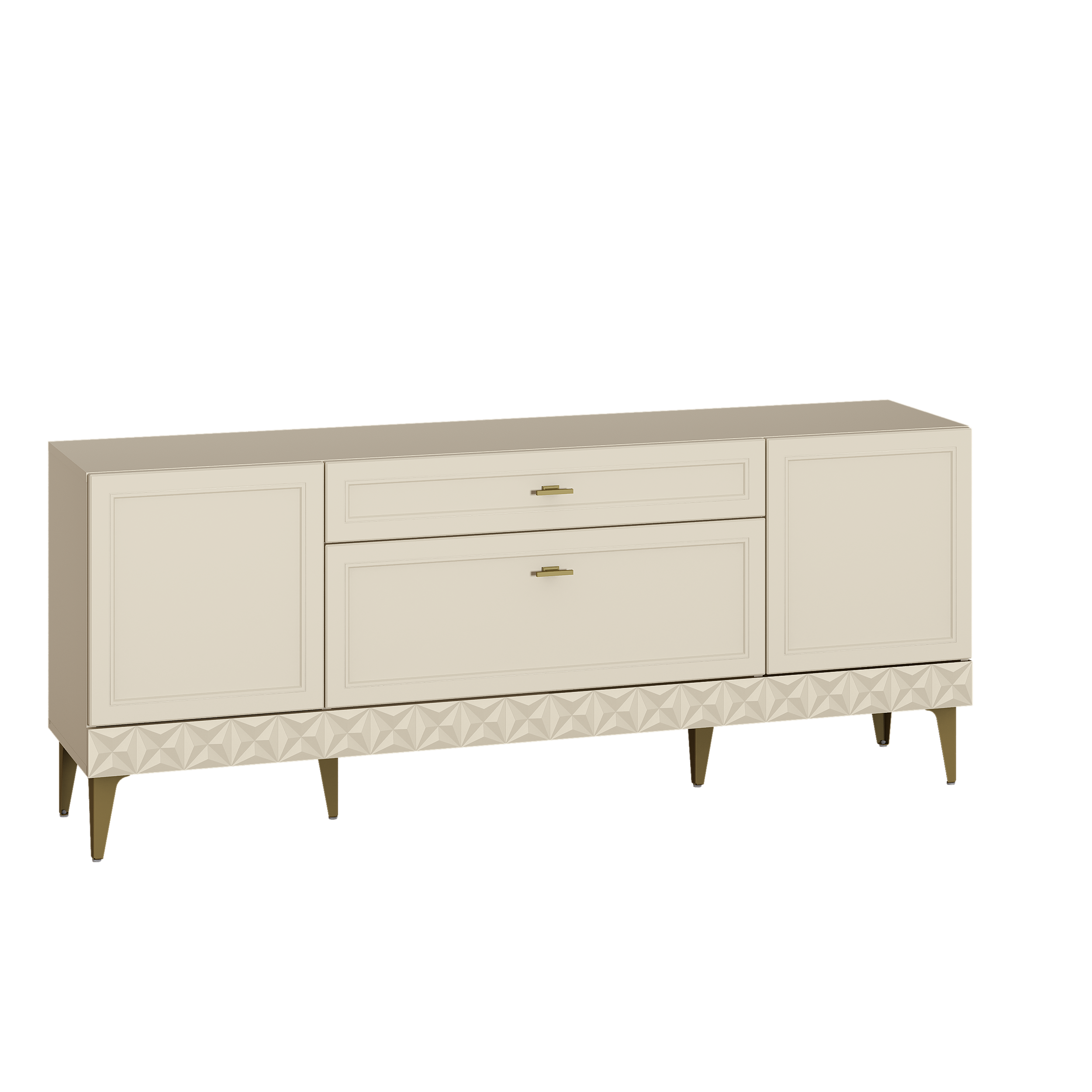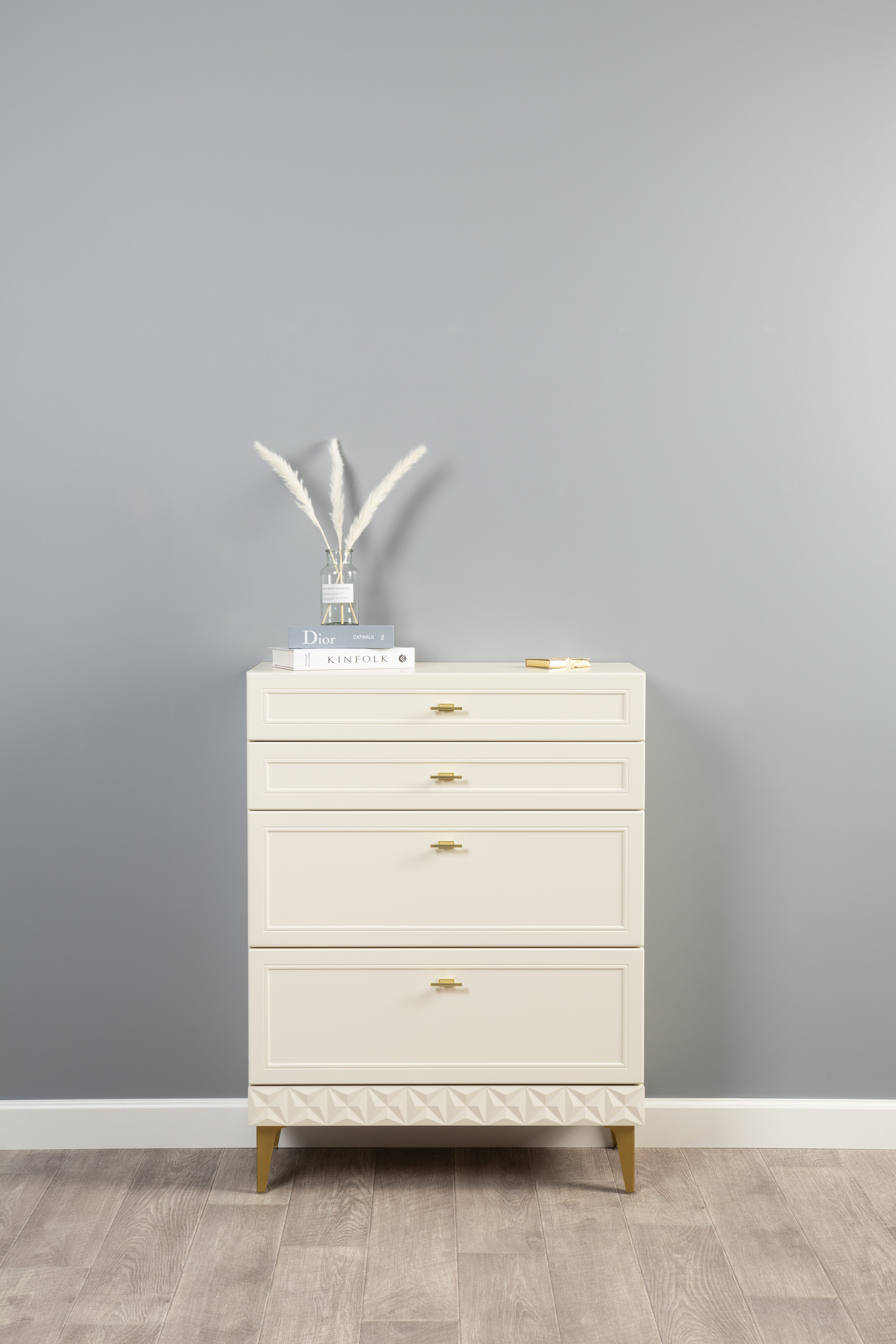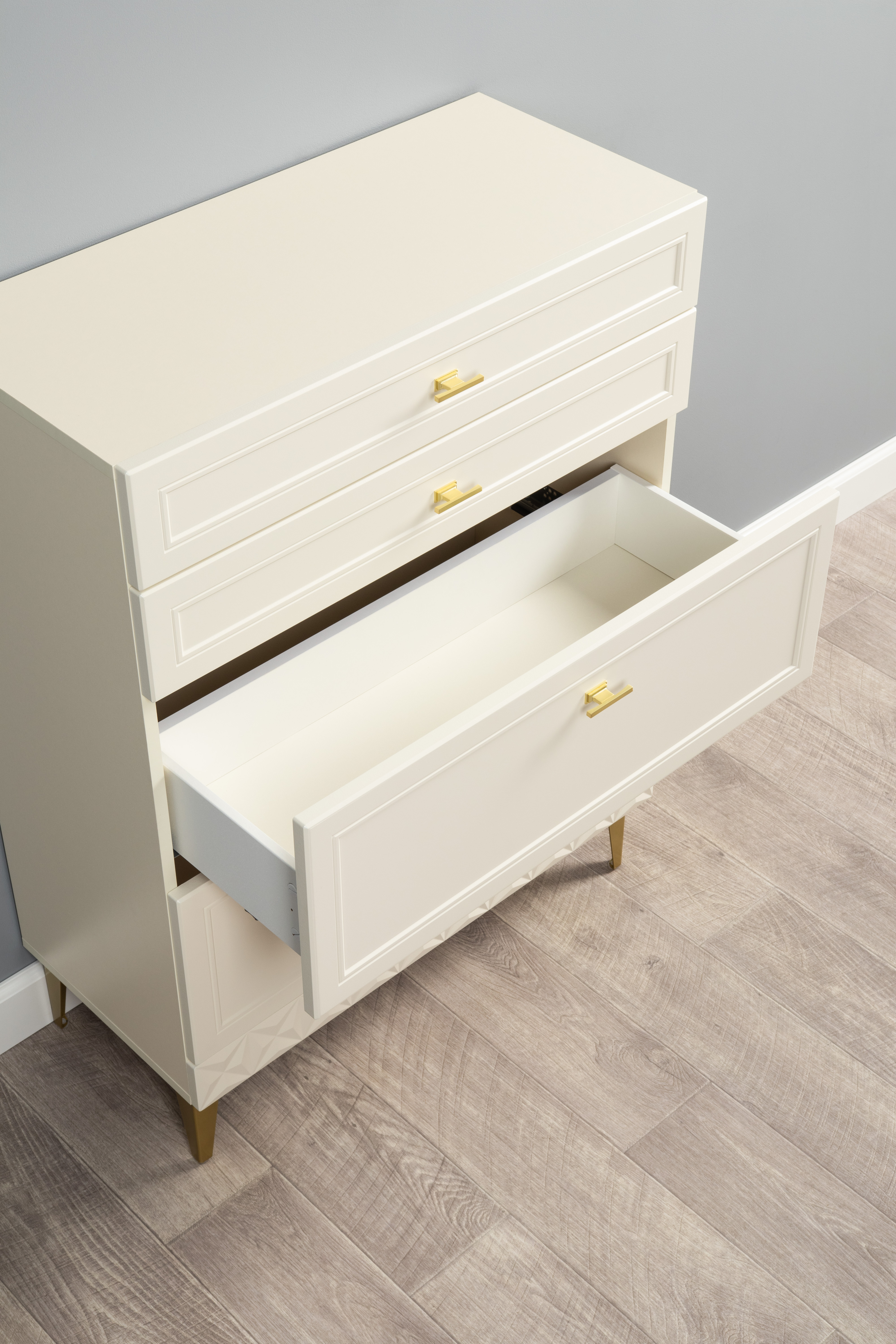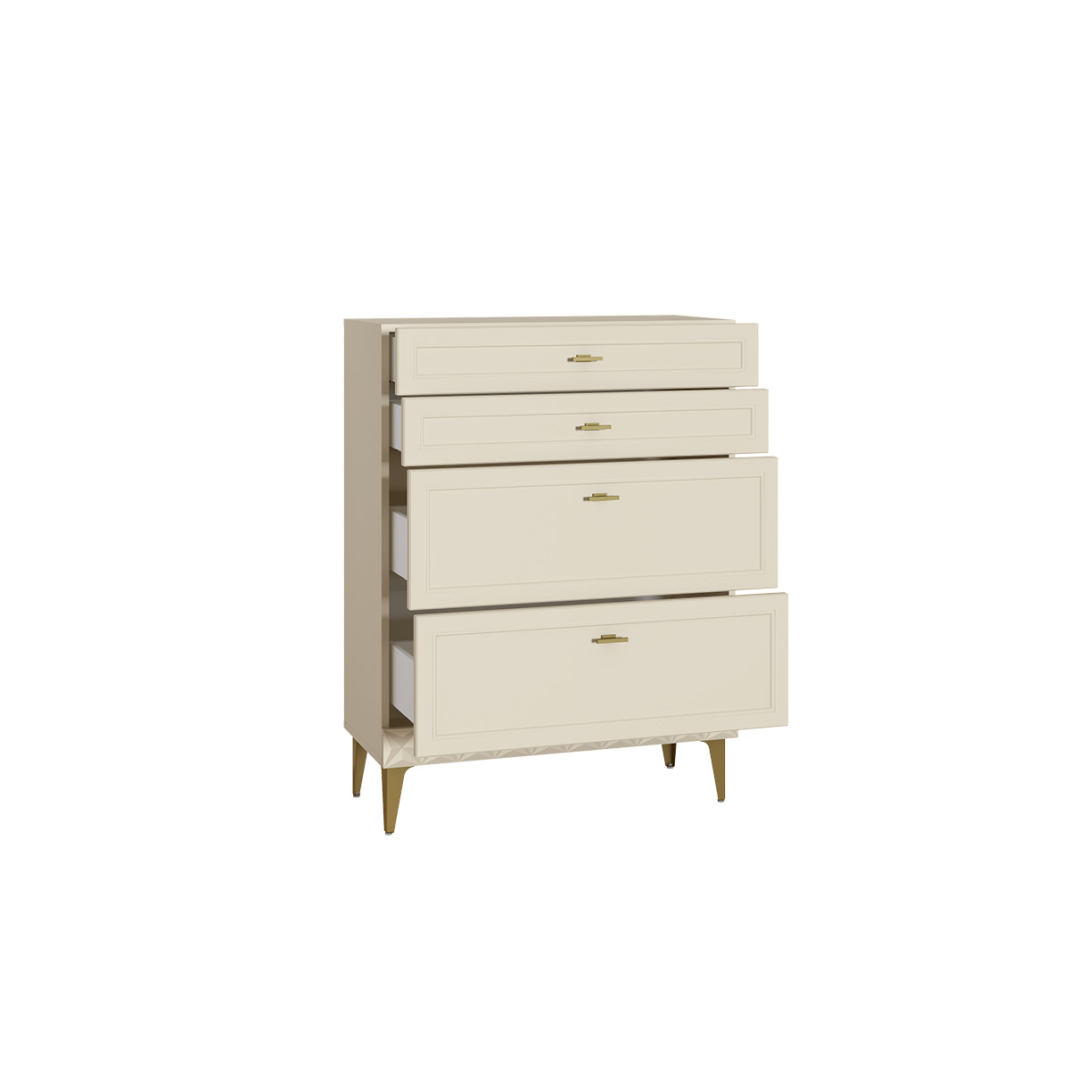 Изящные линии, глубокая фрезеровка фасадов из МДФ и благородные оттенки. Утончённая «Слоновая кость» и изысканная «Олива Шагрень» с глубоким зелёным тоном — создают атмосферу уюта, тепла и благородства. Металлические ручки и опоры золотого цвета придают мебели утончённый блеск, а петли и направляющие с доводчиками обеспечивают плавное и бесшумное закрытие фасадов.