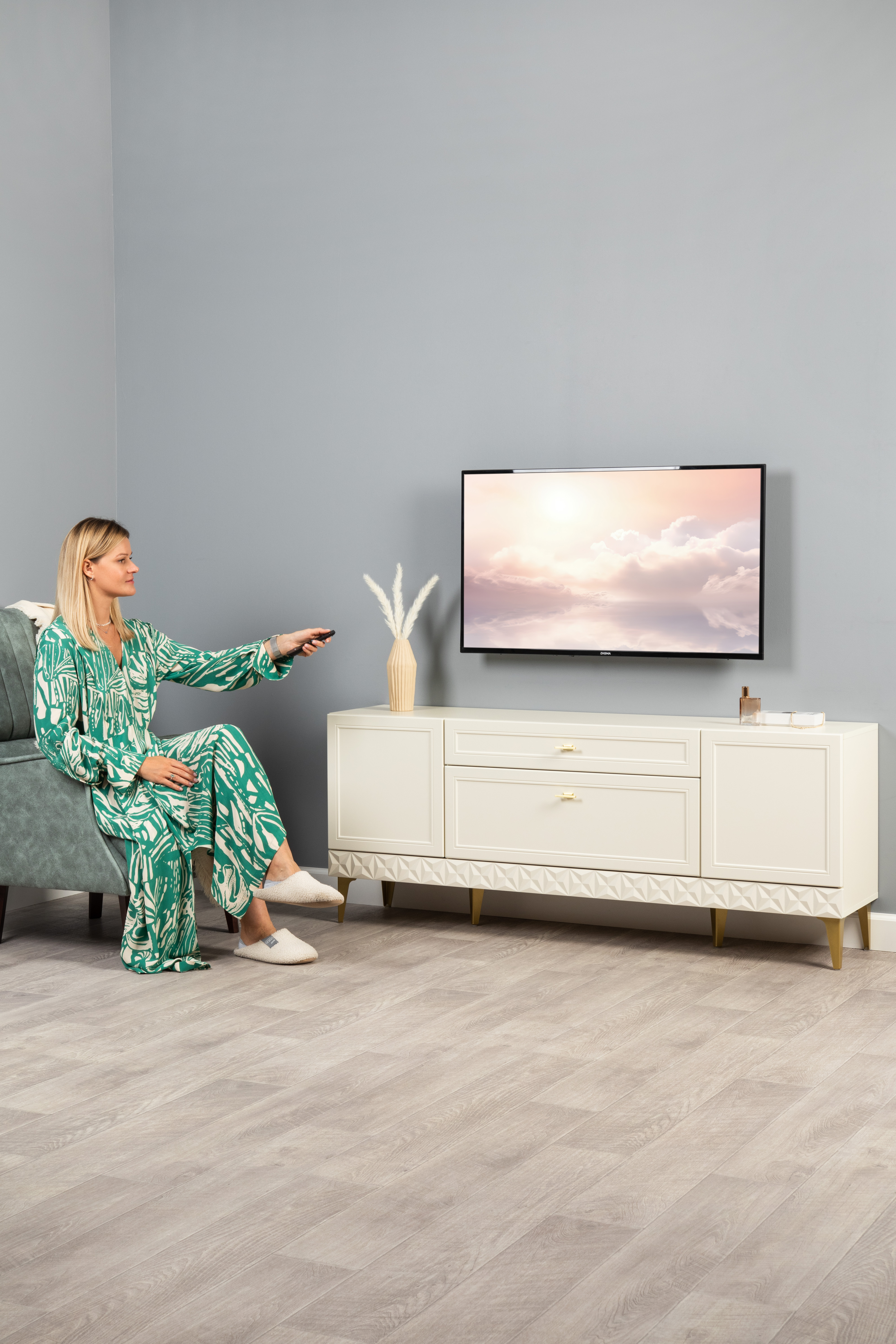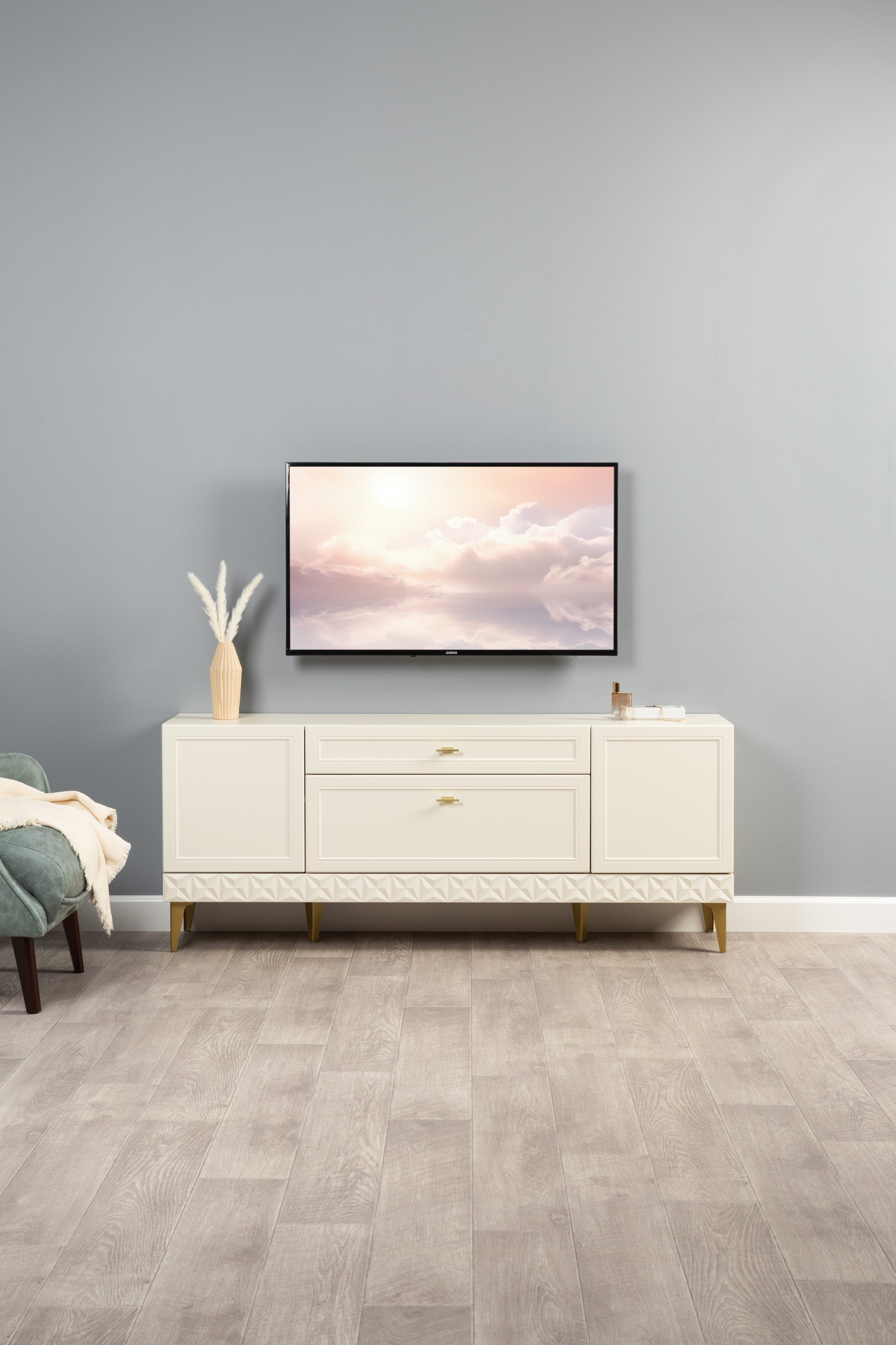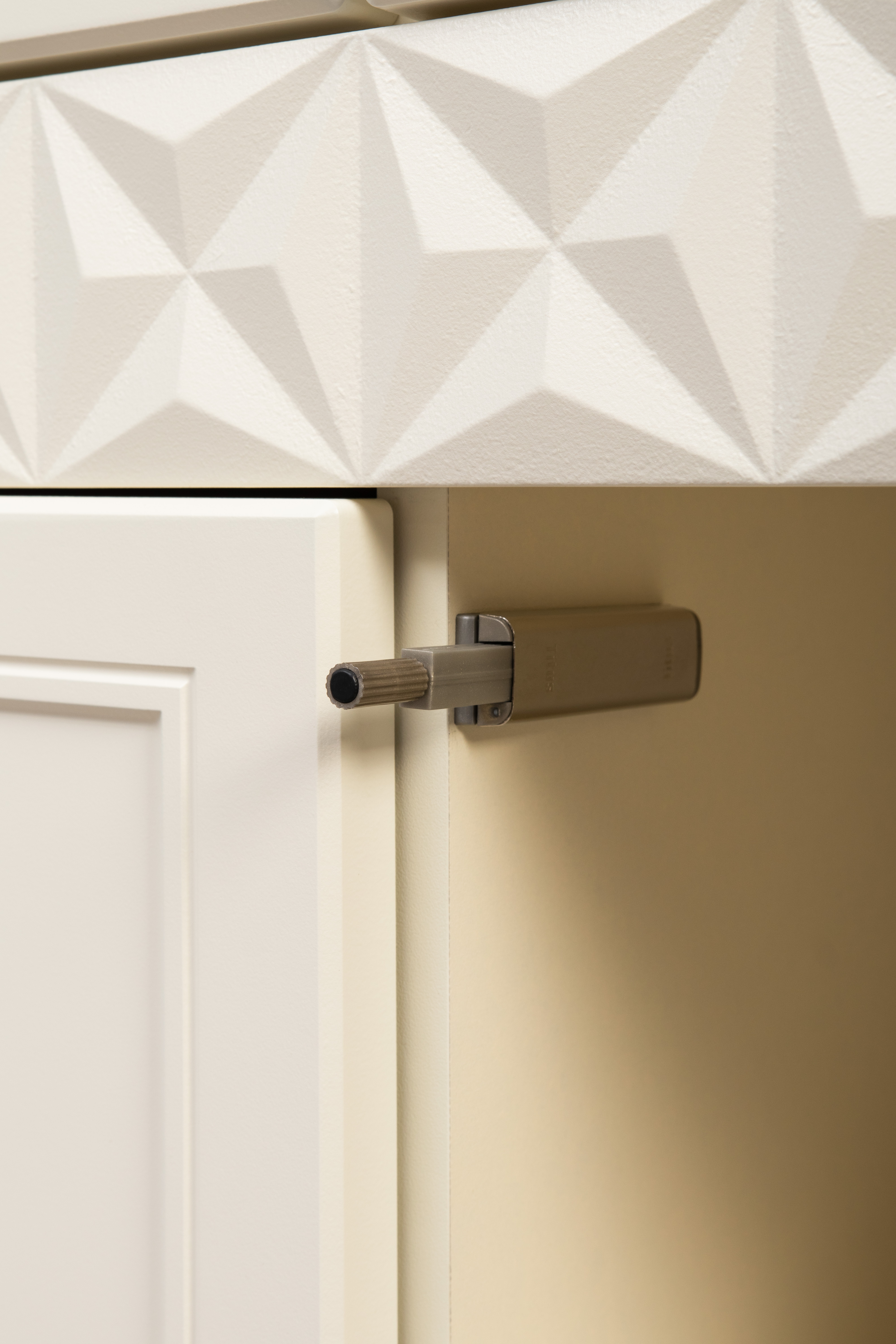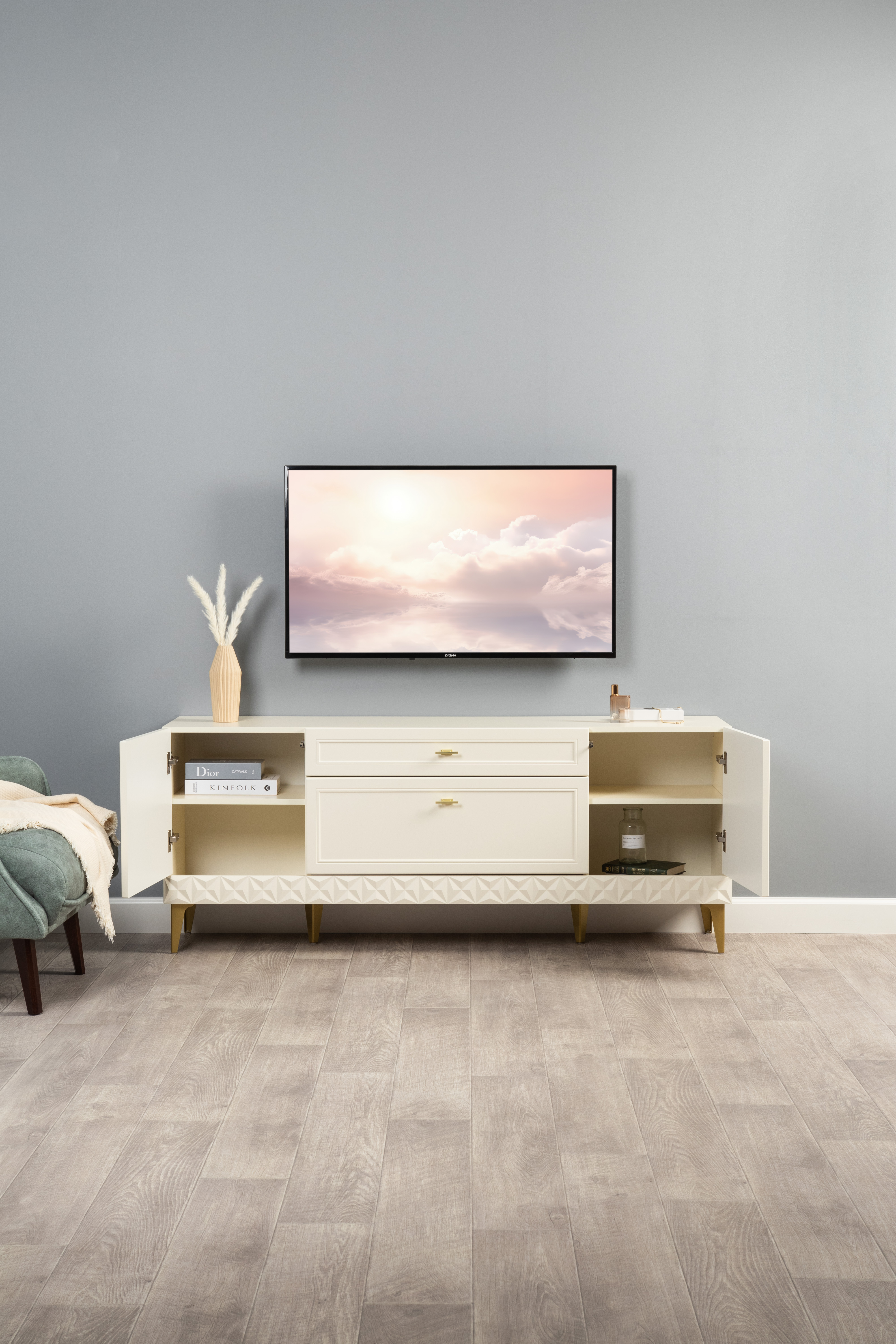 Изящные линии, глубокая фрезеровка фасадов из МДФ и благородные оттенки. Утончённая «Слоновая кость» и изысканная «Олива Шагрень» с глубоким зелёным тоном — создают атмосферу уюта, тепла и благородства. Металлические ручки и опоры золотого цвета придают мебели утончённый блеск, а петли и направляющие с доводчиками обеспечивают плавное и бесшумное закрытие фасадов.