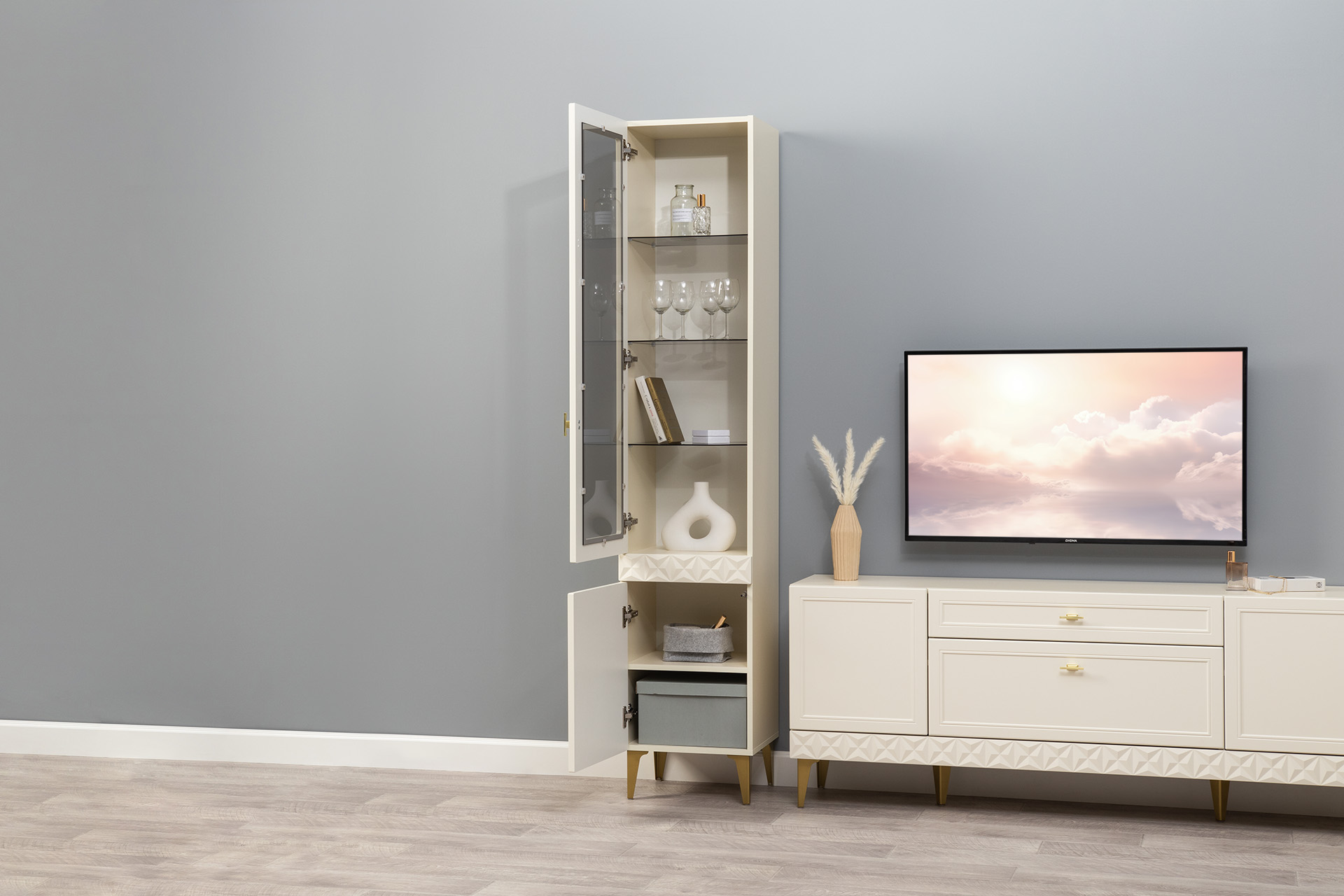 В коллекции представлены три типа витрин с тонированным закалённым стеклом, которые придают пространству лёгкость и свет. «Марион» — идеальное сочетание традиций и актуального дизайна в каждой детали.