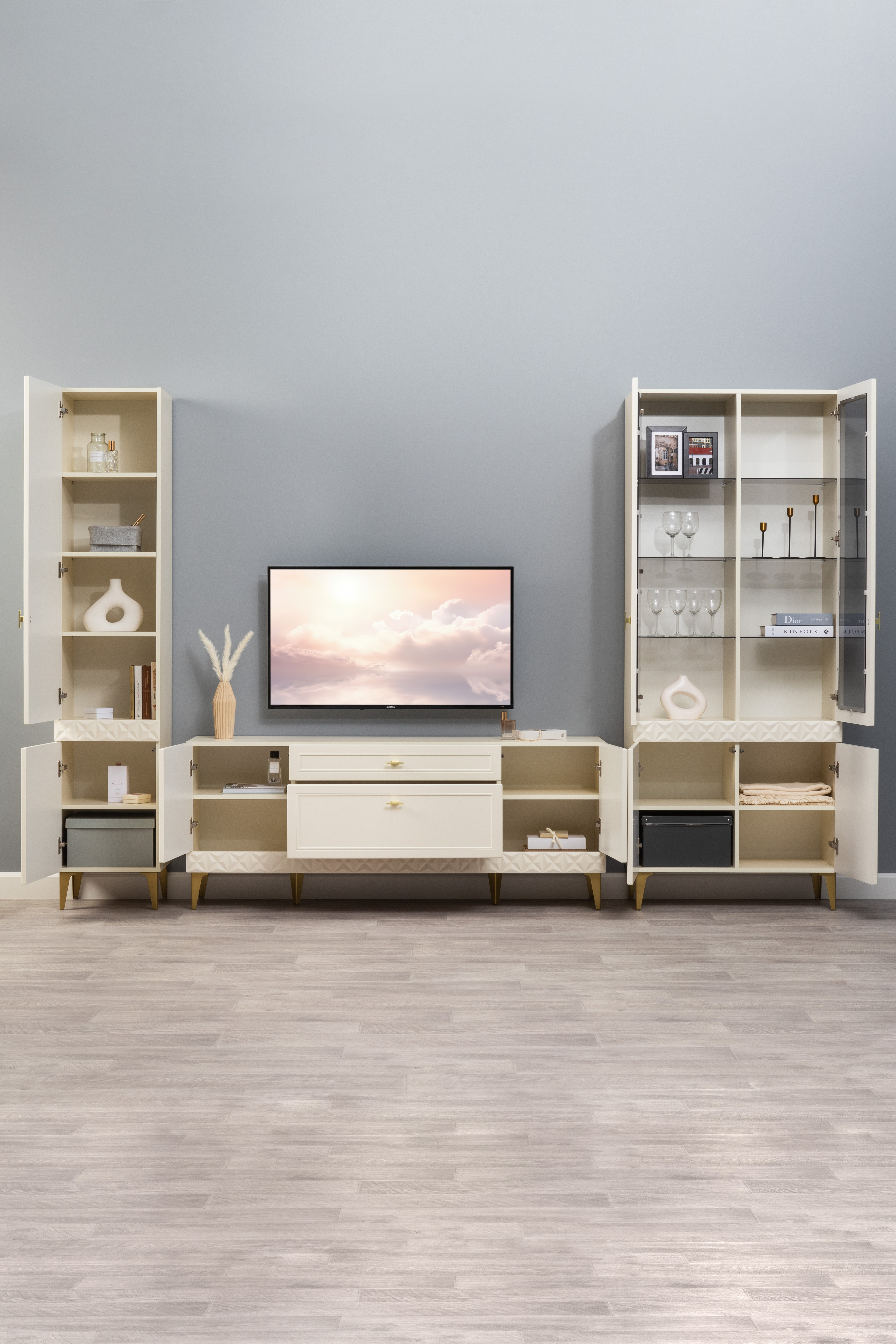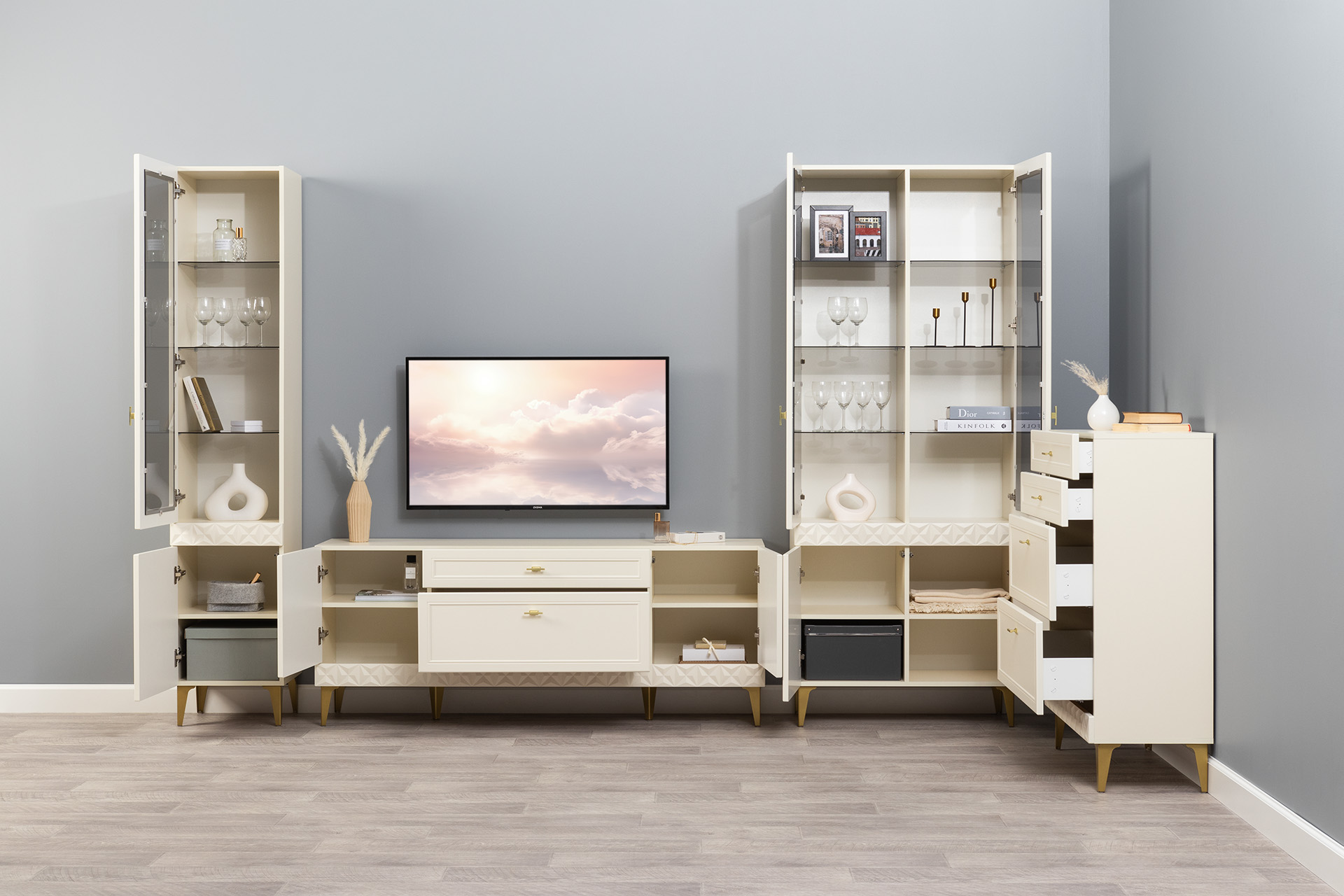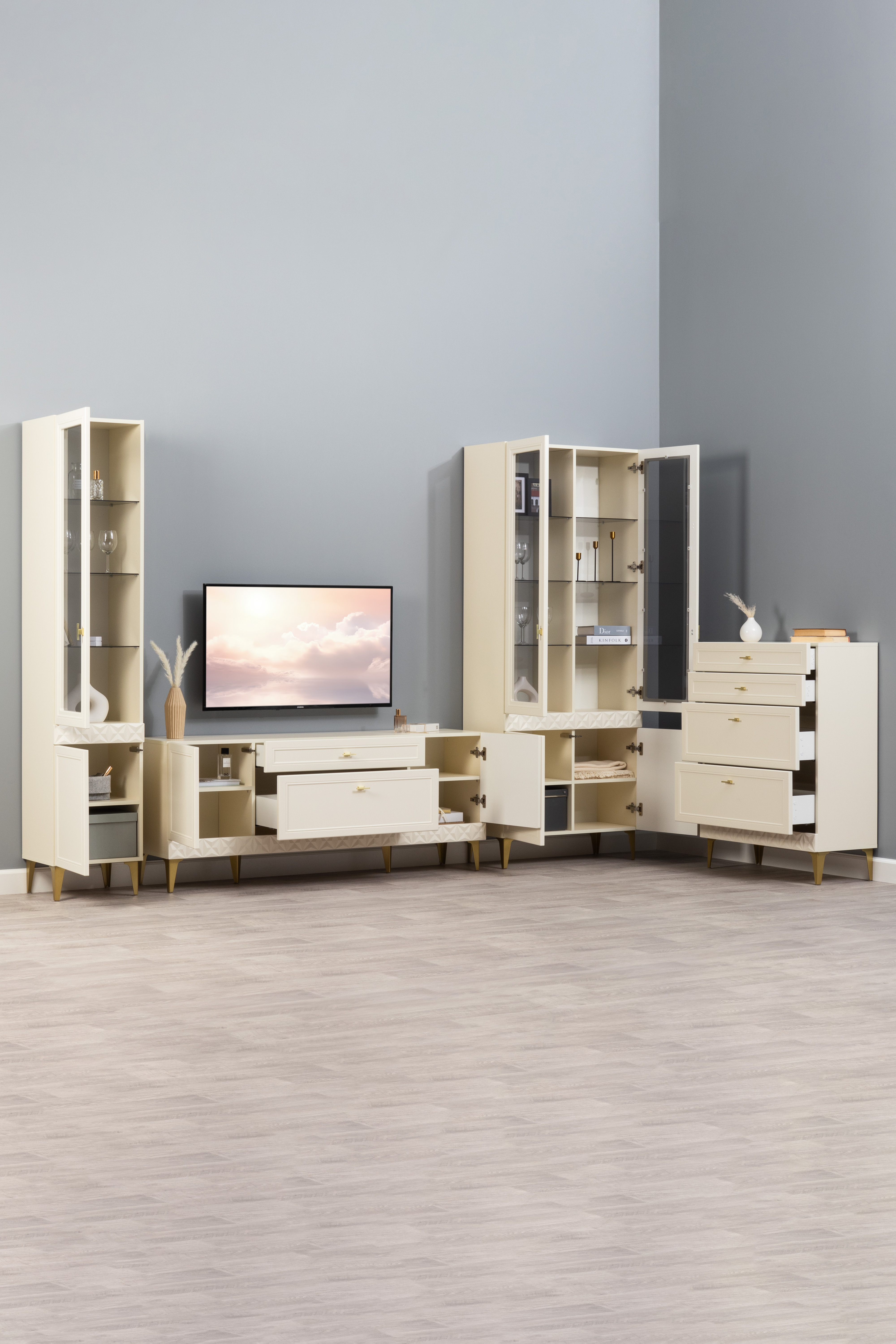 Гостиная Марион композиция 1 слоновая кость С341 PE, слоновая кость 6898 ПВХ, белый PE шагрень (собирается на любую сторону)