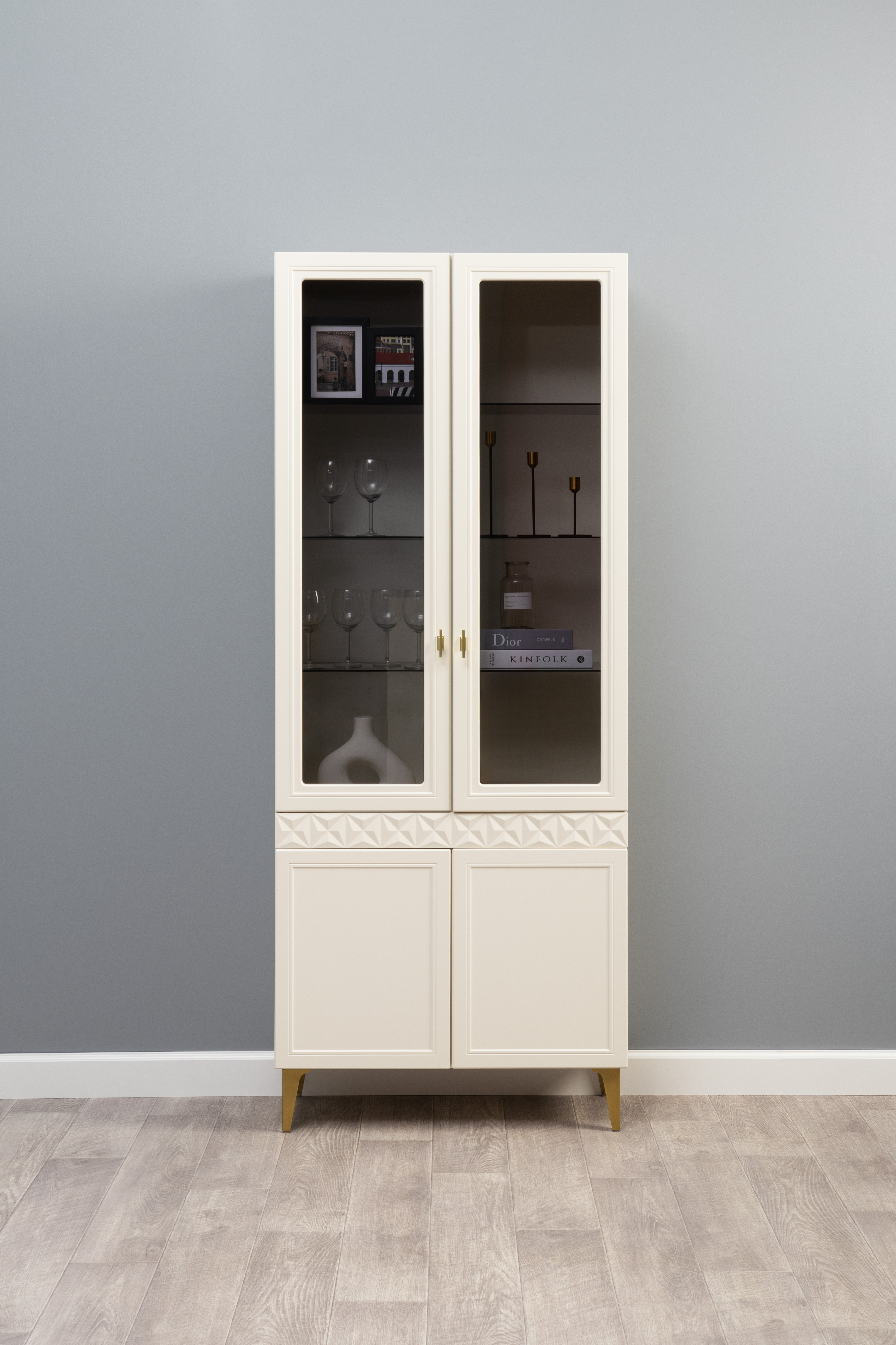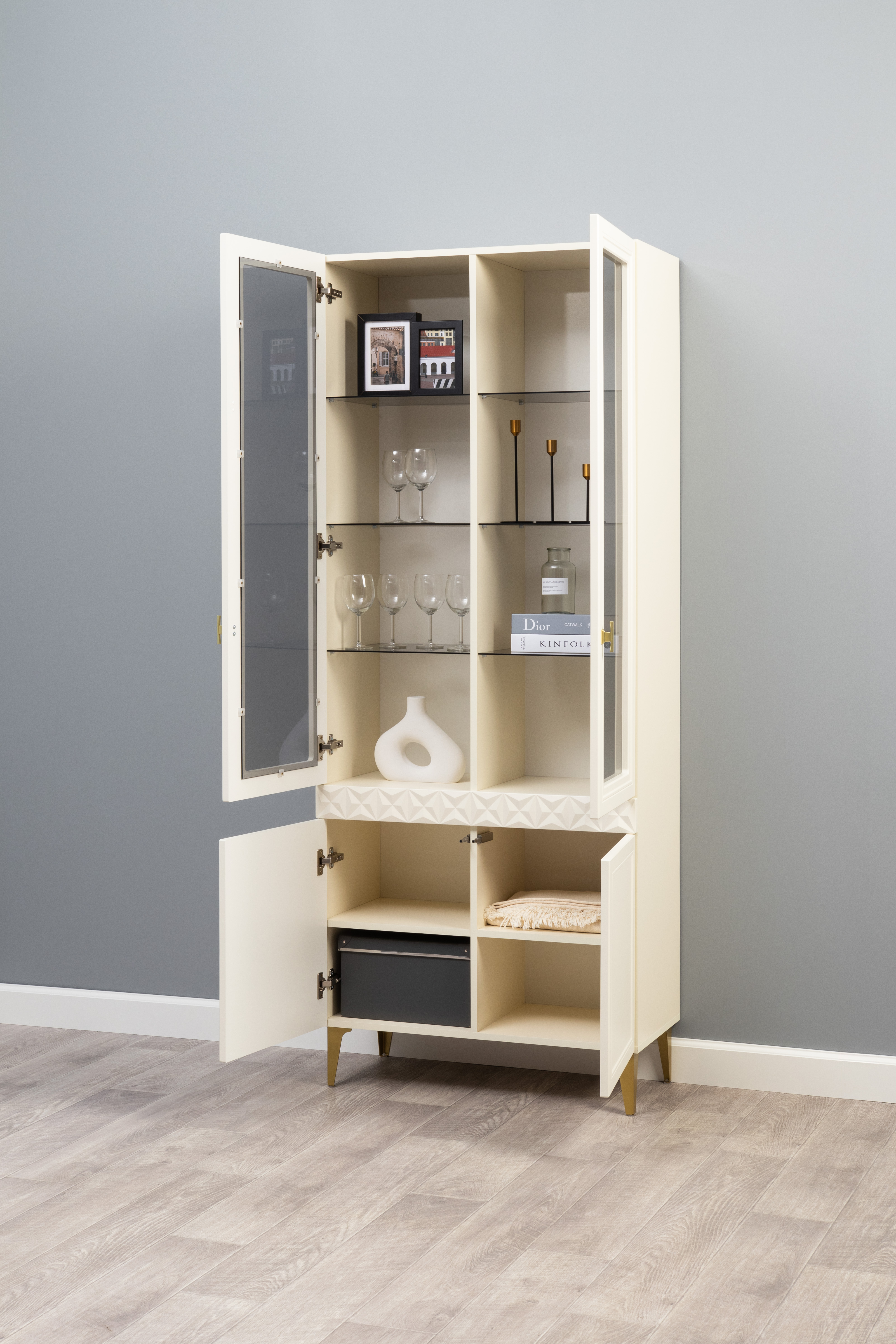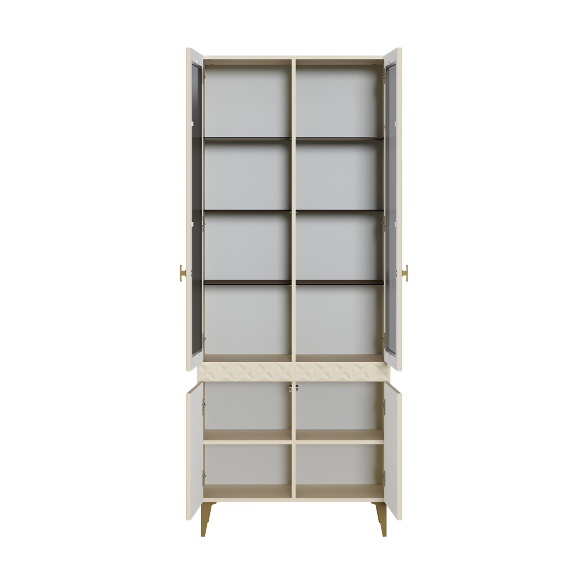 Шкаф-витрина Марион 16.397.01 слоновая кость С341 PE, слоновая кость 6898 ПВХ (собирается на любую сторону)