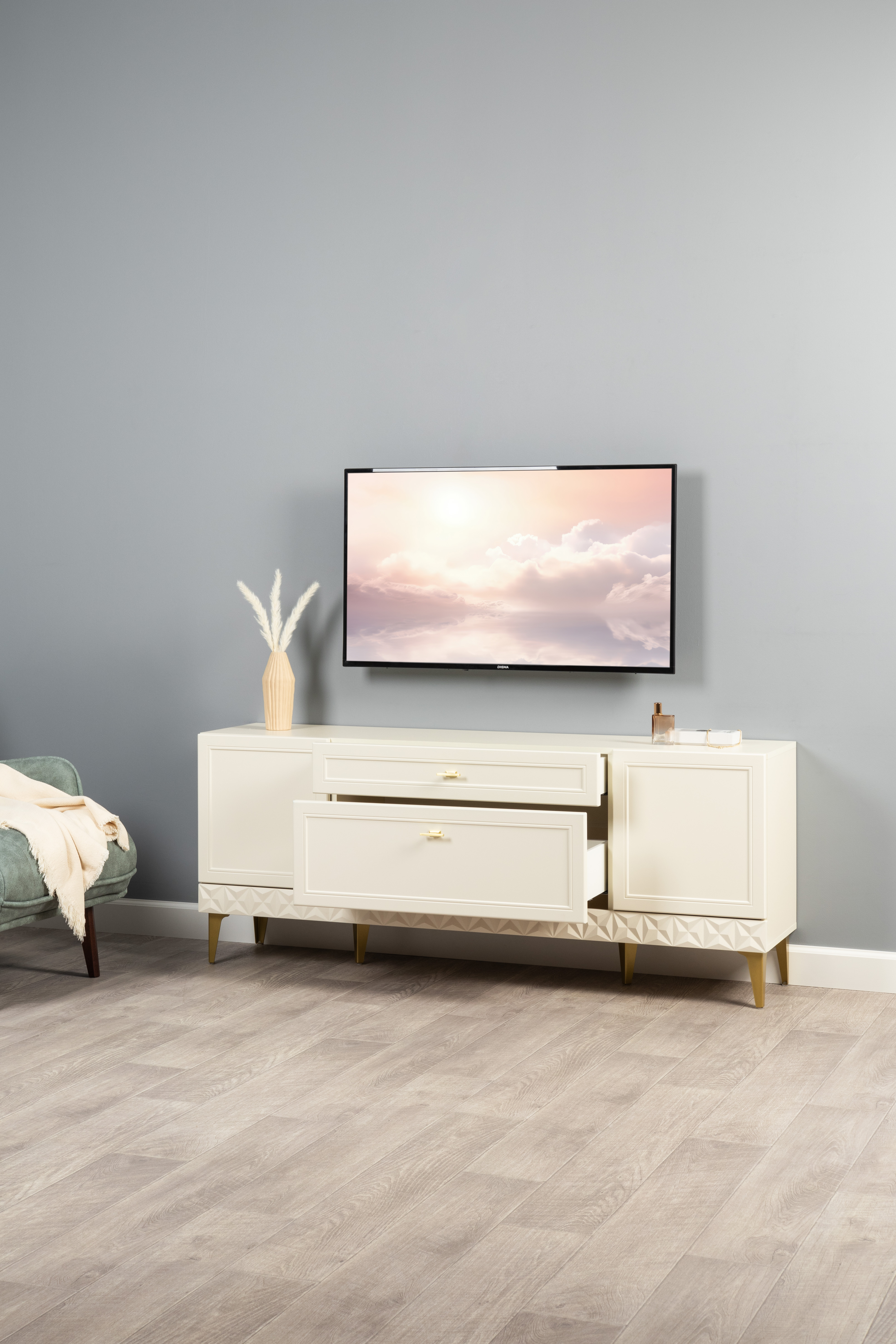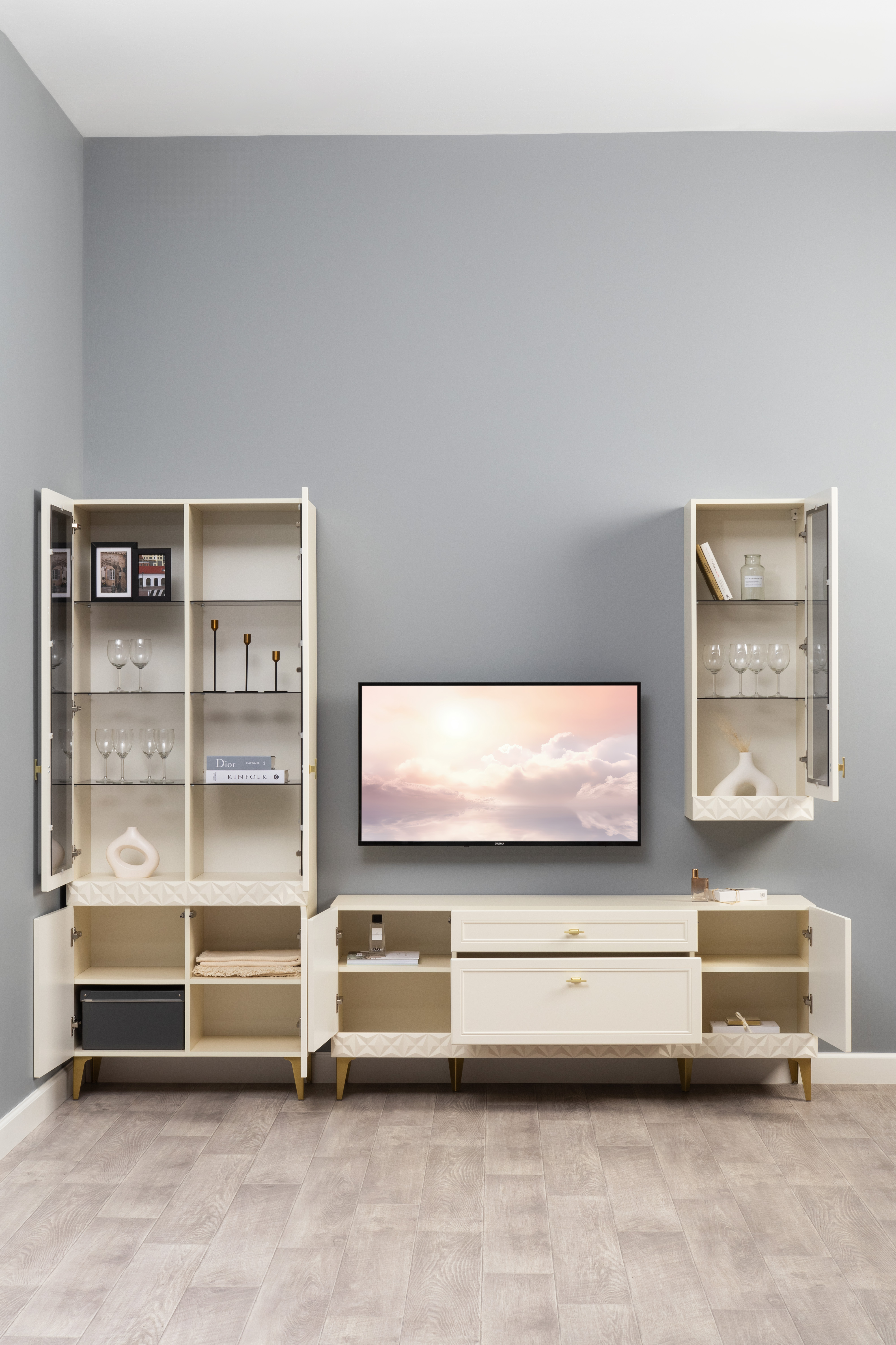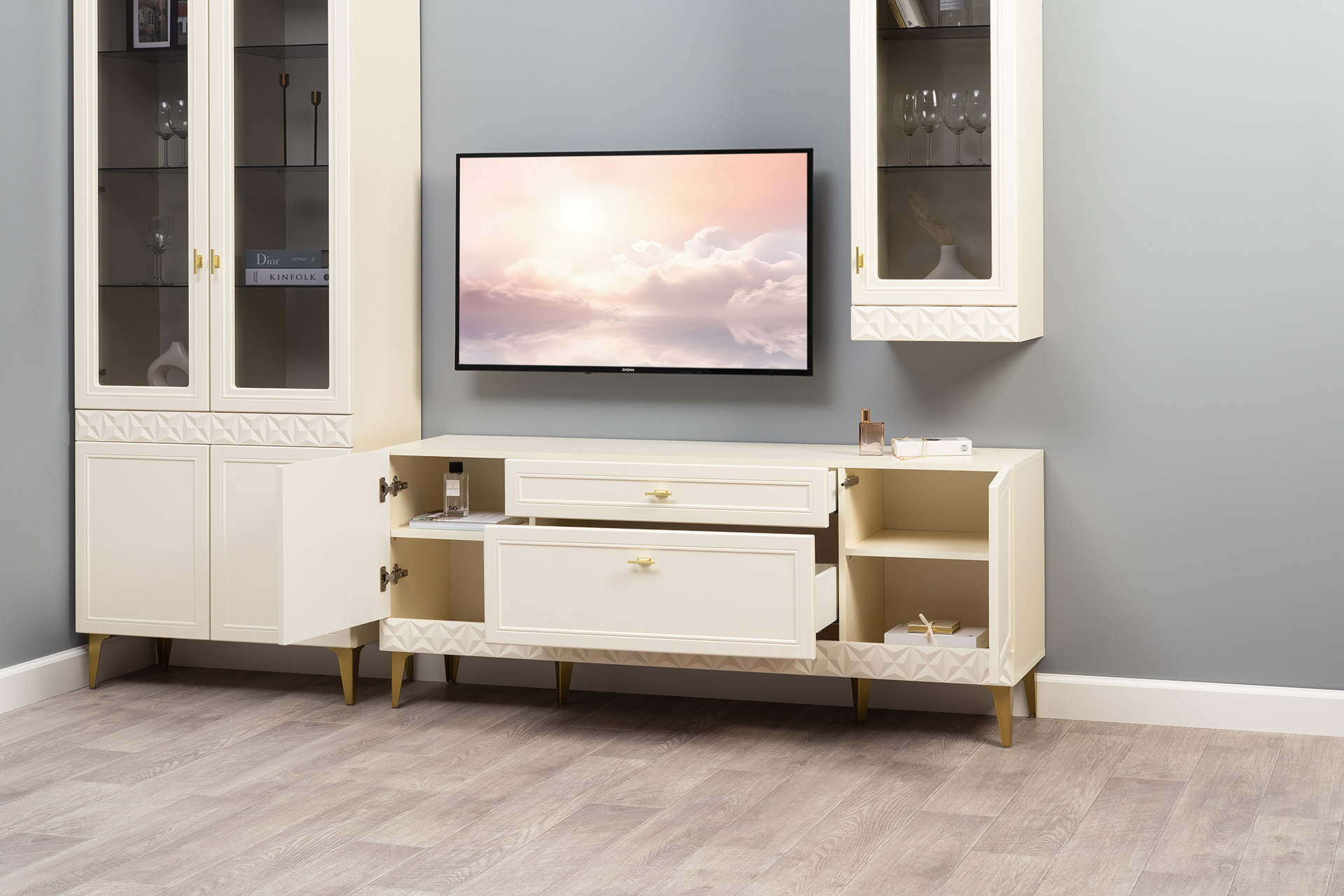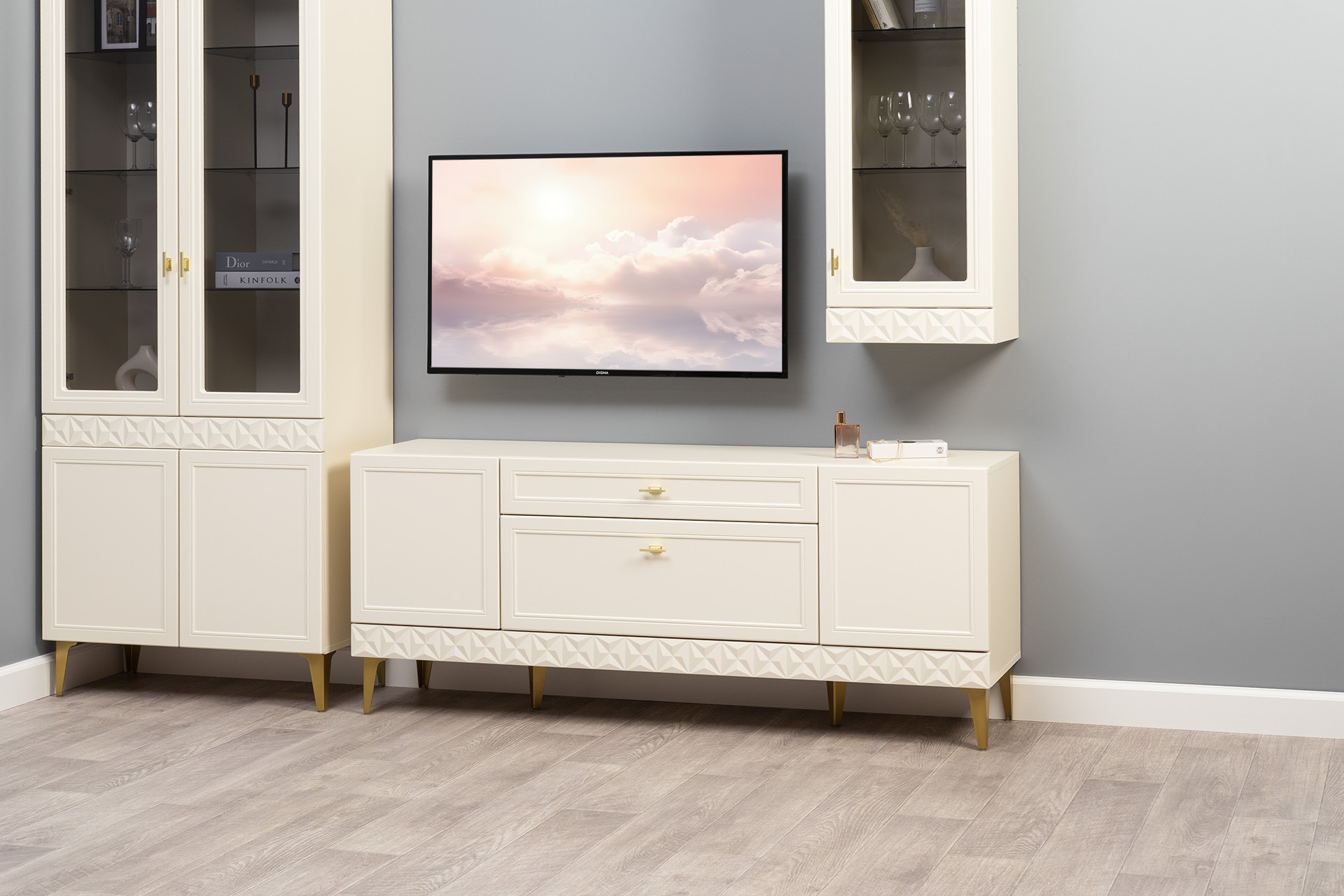 Гостиная Марион композиция 2 слоновая кость С341 PE, слоновая кость 6898 ПВХ, белый PE шагрень (собирается на любую сторону)