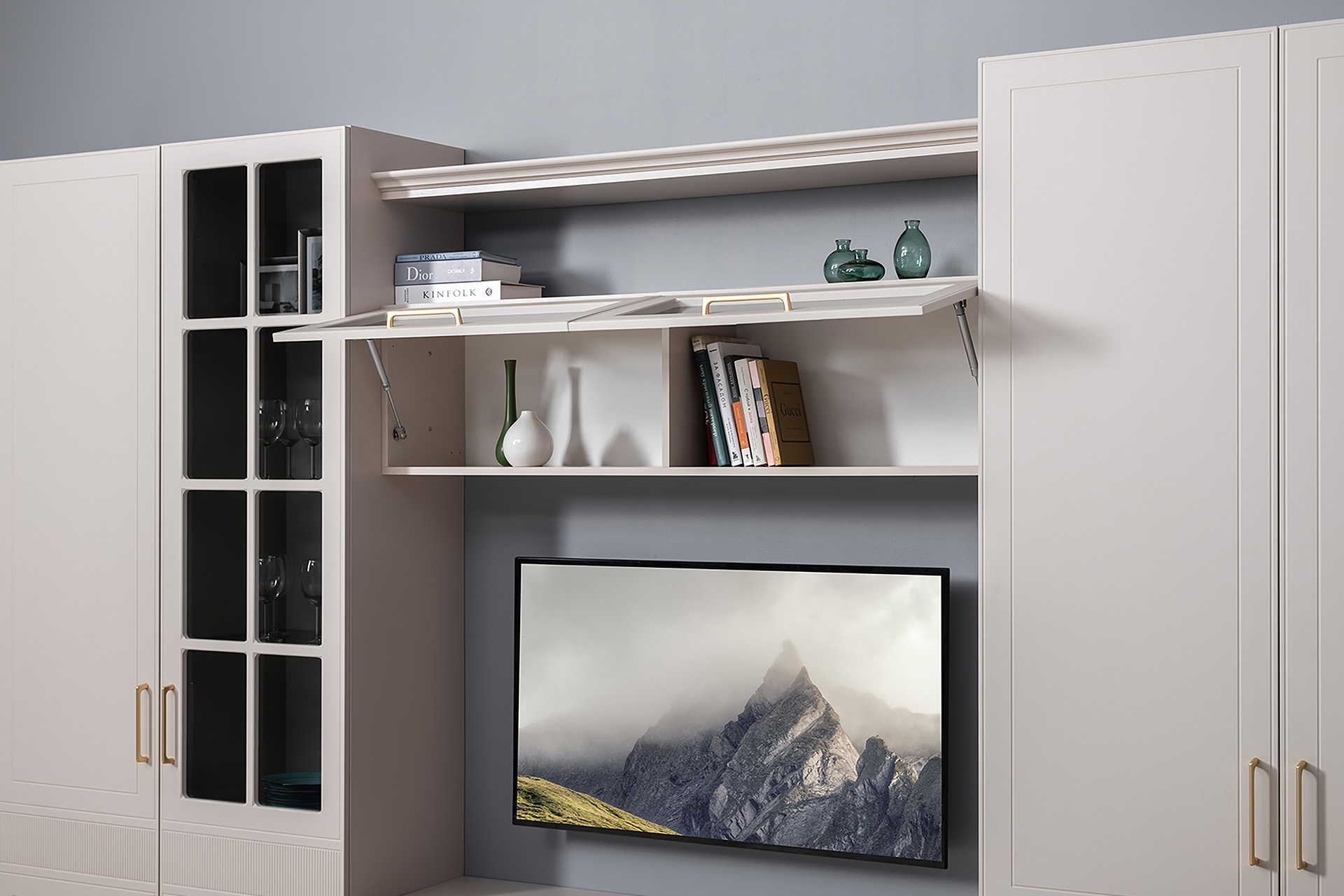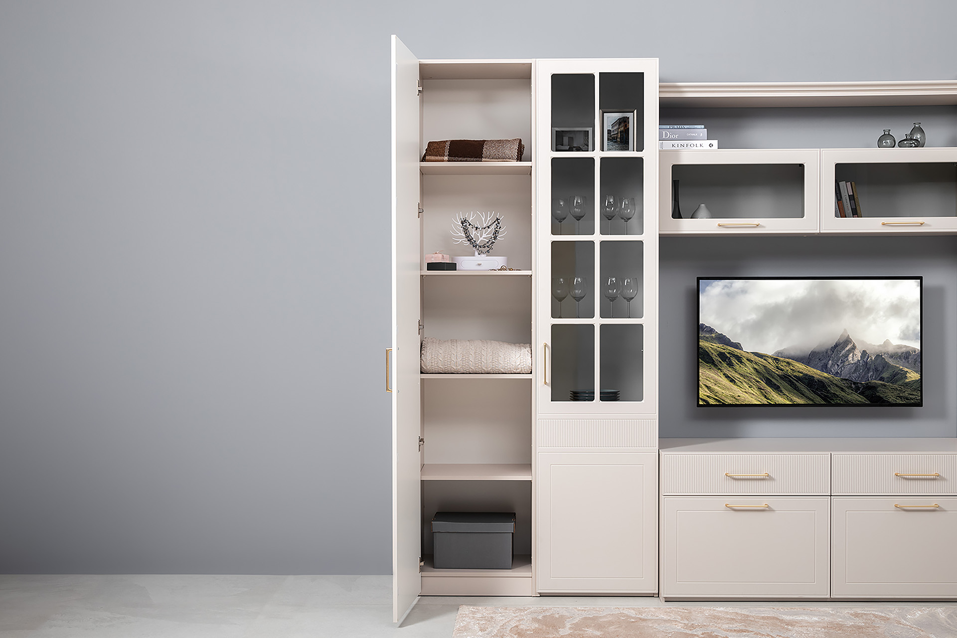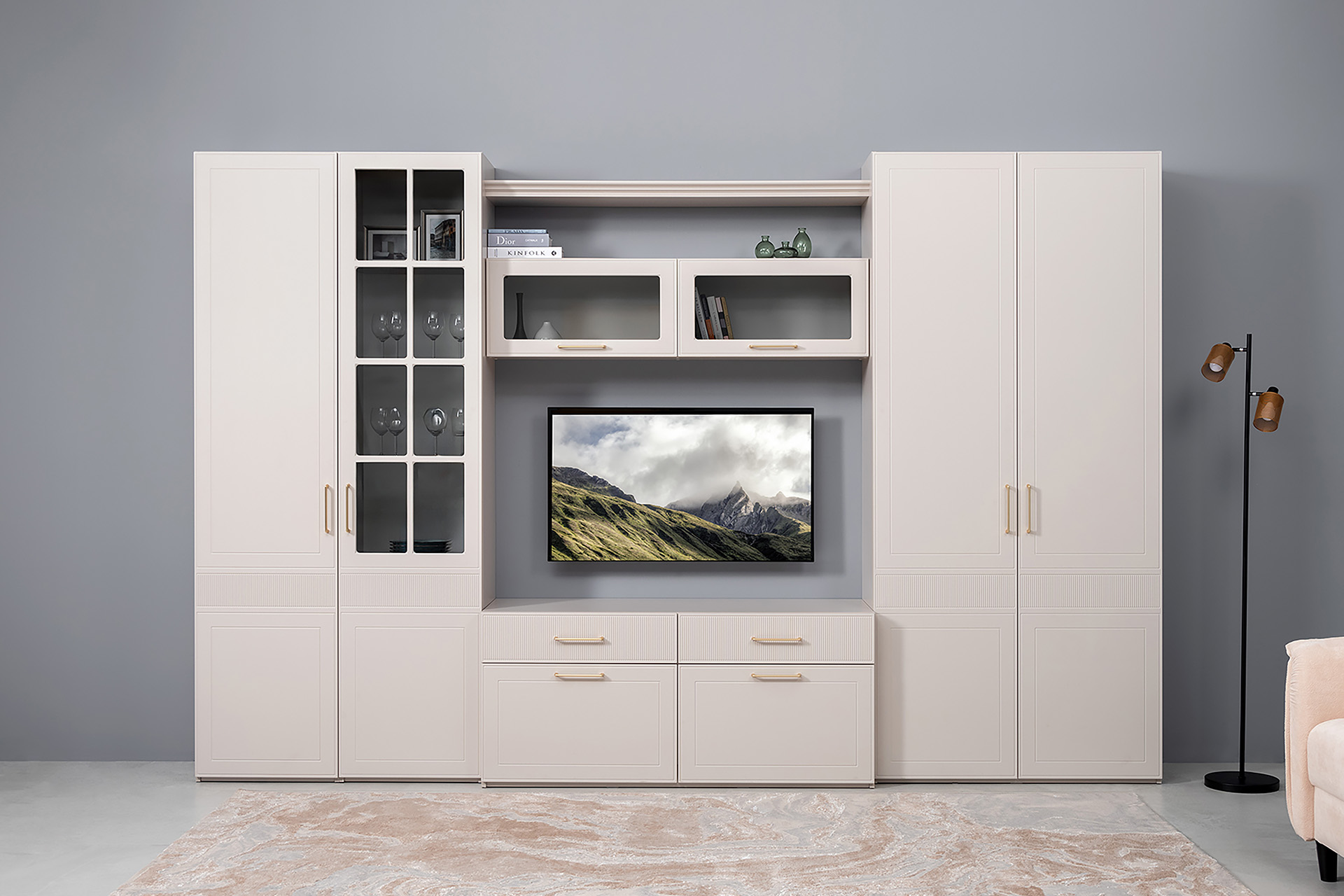 Гостиная Ричфорд композиция 1 с карнизами, кашемир 5981 BS, моно керамика D166-2 ПВХ, белый PE шагрень (собирается на любую сторону)