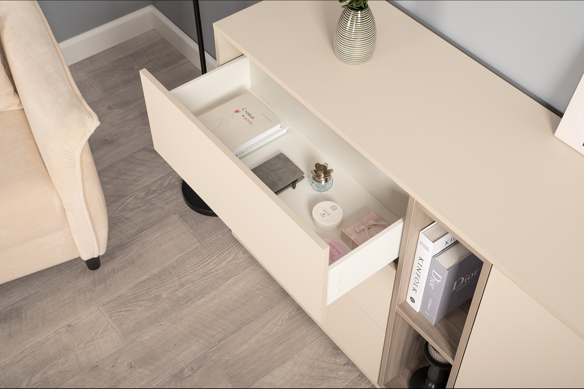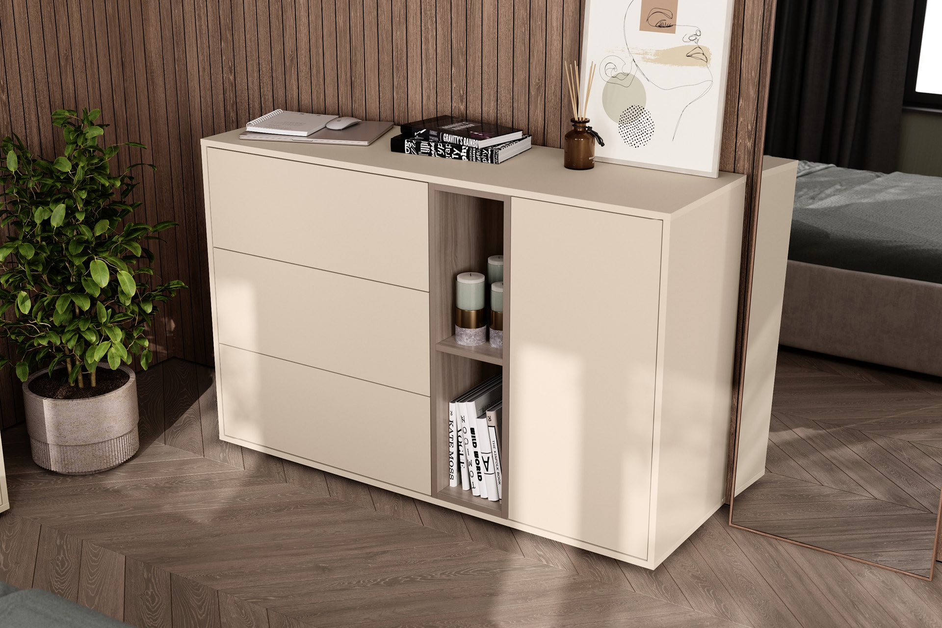 Комод Тайл 16.236 сатин 7045 SU, эмили блаш U9135, белый PE шагрень, собирается на любую сторону
