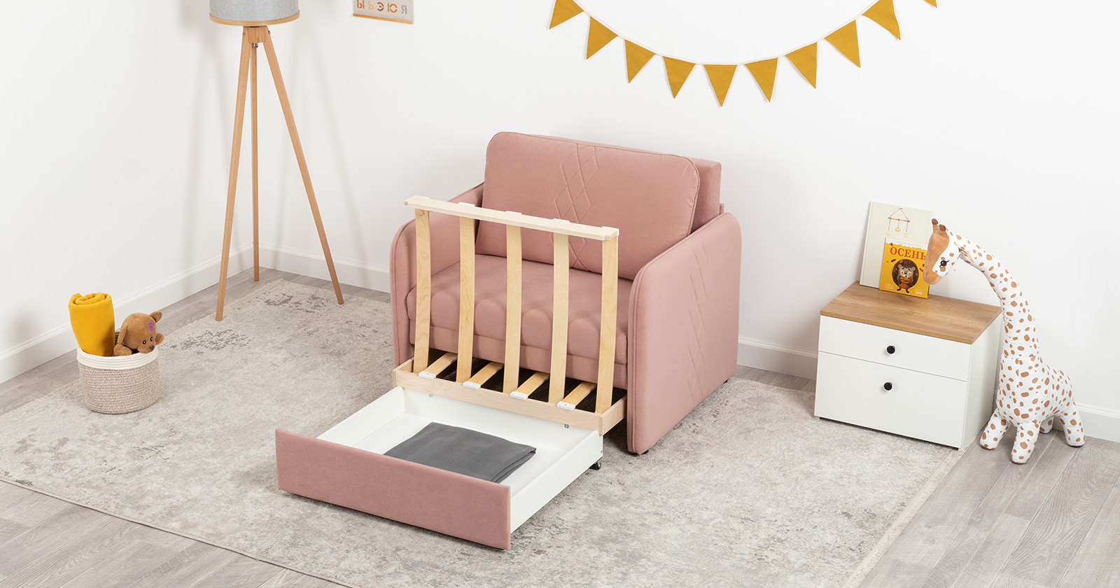 Стильный компактный диван для детской и гостиной. При своих скромных размерах он трансформируется в полноценное спальное место для детей и подростков. Лаконичный дизайн в виде декоративной стежки подчеркивает фактуру велюра, а небольшие размеры позволят разместить его в любом пространстве.