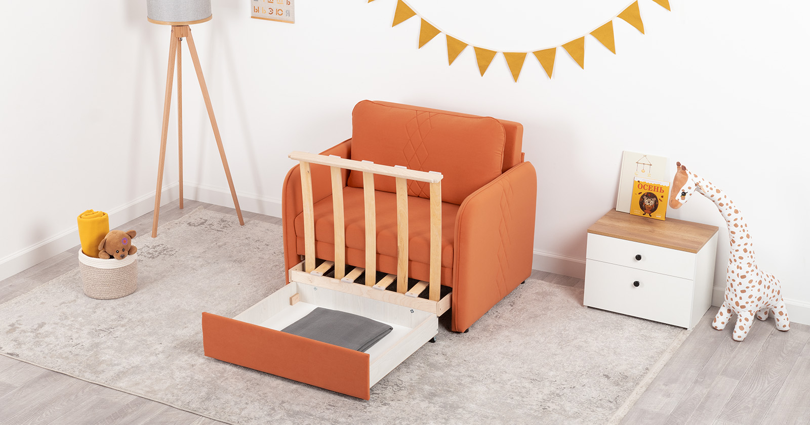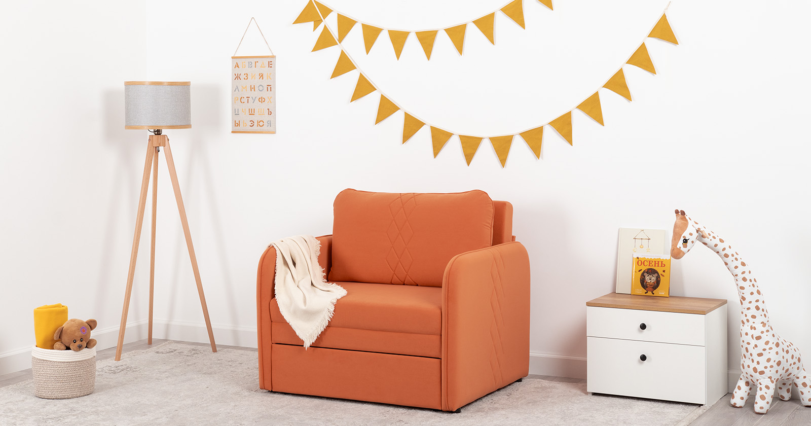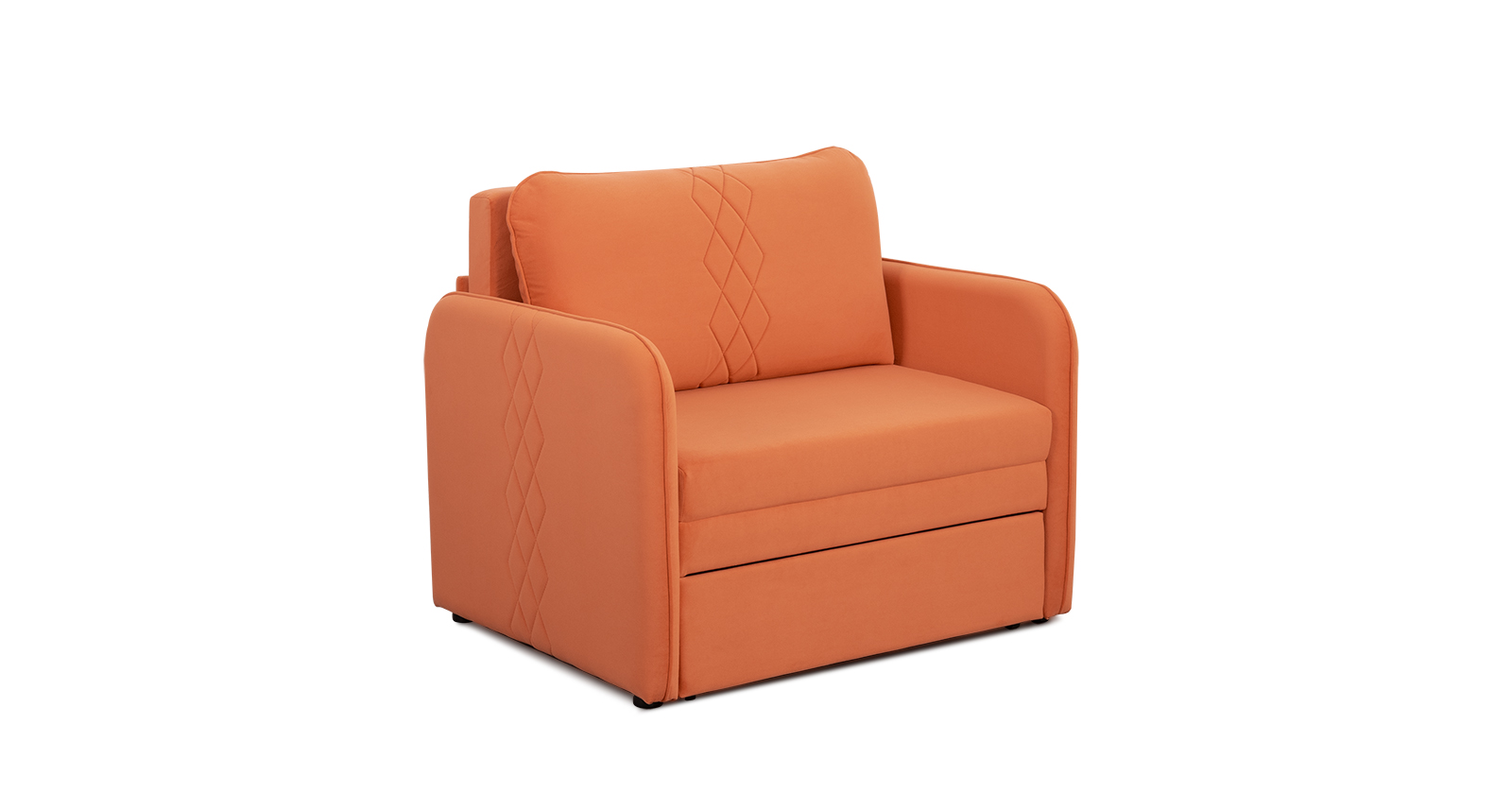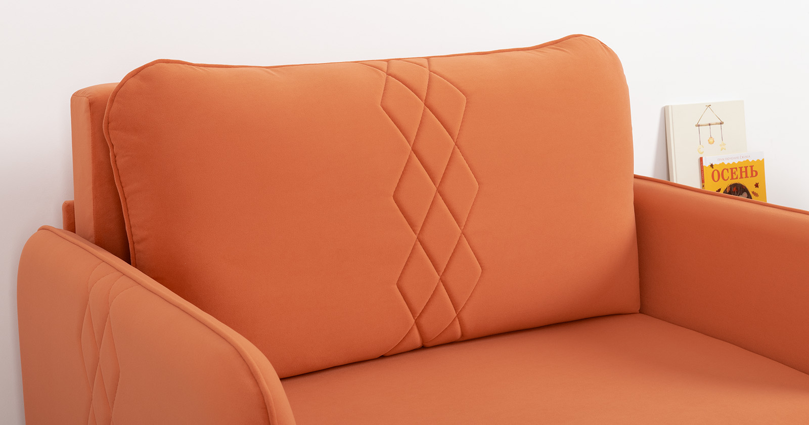 Стильный компактный диван для детской и гостиной. При своих скромных размерах он трансформируется в полноценное спальное место для детей и подростков. Лаконичный дизайн в виде декоративной стежки подчеркивает фактуру велюра, а небольшие размеры позволят разместить его в любом пространстве.