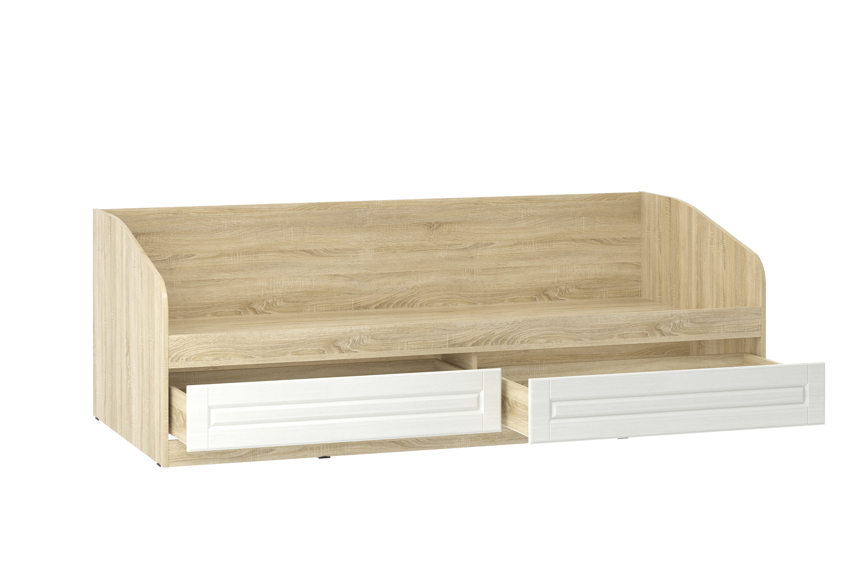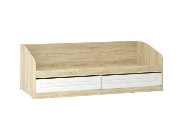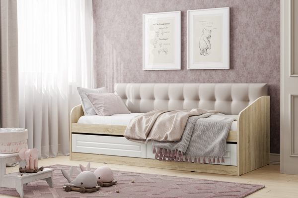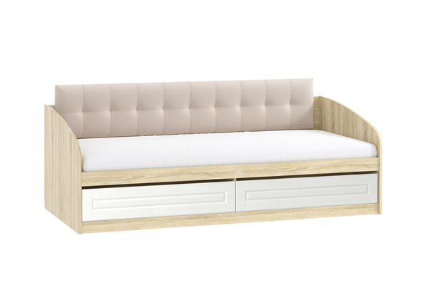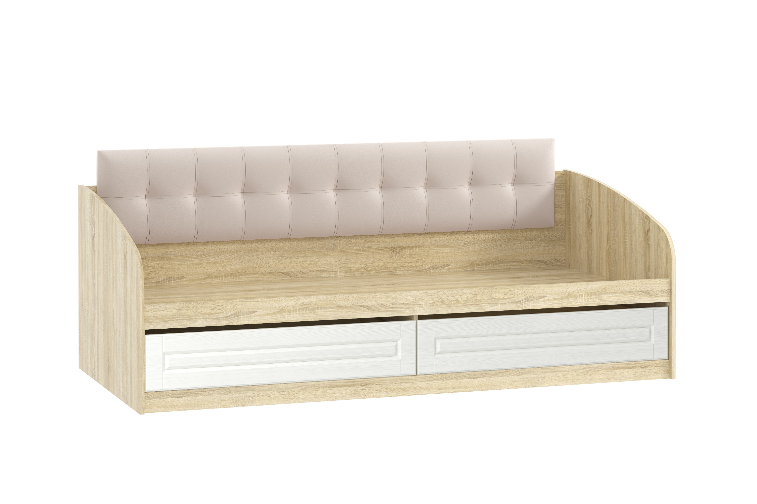 Кровать детская Оливия НМ 041.50 дуб сонома, белое дерево с мягкой спинкой Дабл велутто 16 велюр бежевый