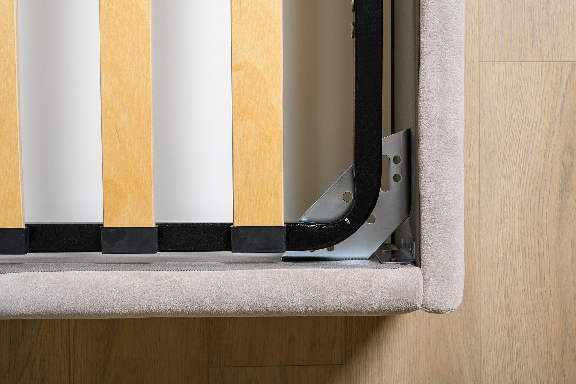 Основание кровати укомплектовано матрасодержателями. Жесткое кроватное дно из ЛДСП 16 мм на опорах 25 мм.