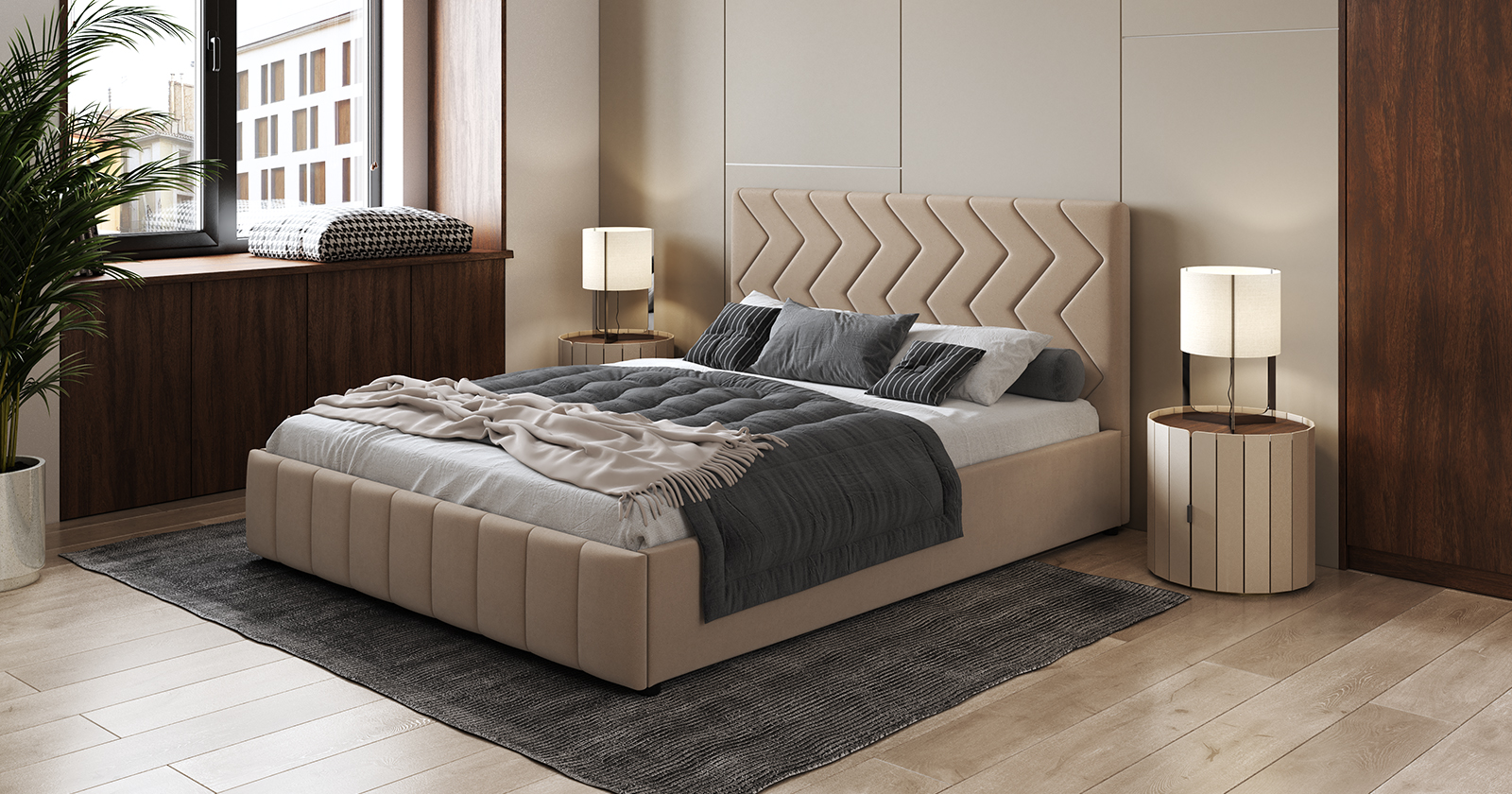 Кровать Милана 180 велюр бежевый кофейный с ортопедическим основанием и подъемным механизмом