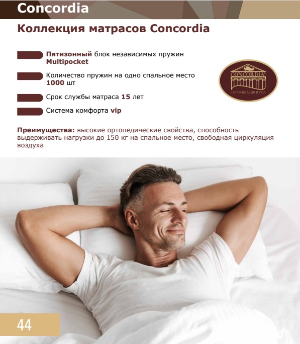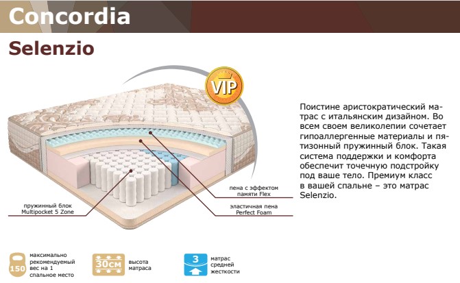Поистине аристократический матрас с итальянским дизайном. Во всем своем великолепии сочетает гипоаллергенные материалы и пятизонный пружинный блок. Такая система поддержки и комфорта обеспечит точеченую подстройку под ваше тело. Премиум класс в вашей спальне - это матрас Selenzio. Матрас объединяет в себе все лучшие свойства материалов, специально созданных для достижения максимального комфорта и уюта. Надежная внутренняя конструкция матраса обеспечивает отличную поддержку позвоночника. А высокоэластичная суперпена с эффектом памяти создает непревзойденное ощущение невесомости и легкости. Особенную прохладу, свежесть и мягкость придает матрасу Concordia Celenzio чехол, выполненный из трикотажа с волокнами вискозы и пропитанный ионами серебра. Погружаясь в сказочный волшебный сон, Вы будете чувствовать лишь нежность, легкость и беззаботность.