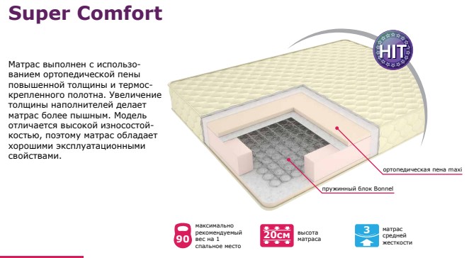 Модель матраса “Super Comfort” выполнена с использованием пенополиуретана повышенной толщины и плотного термовойлока. Увеличение плотности наполнителей делает матрас более пышным, его высота составляет 20 см. Матрас по периметру имеет систему усиления поролоном плотностью 55 кг/куб.м.