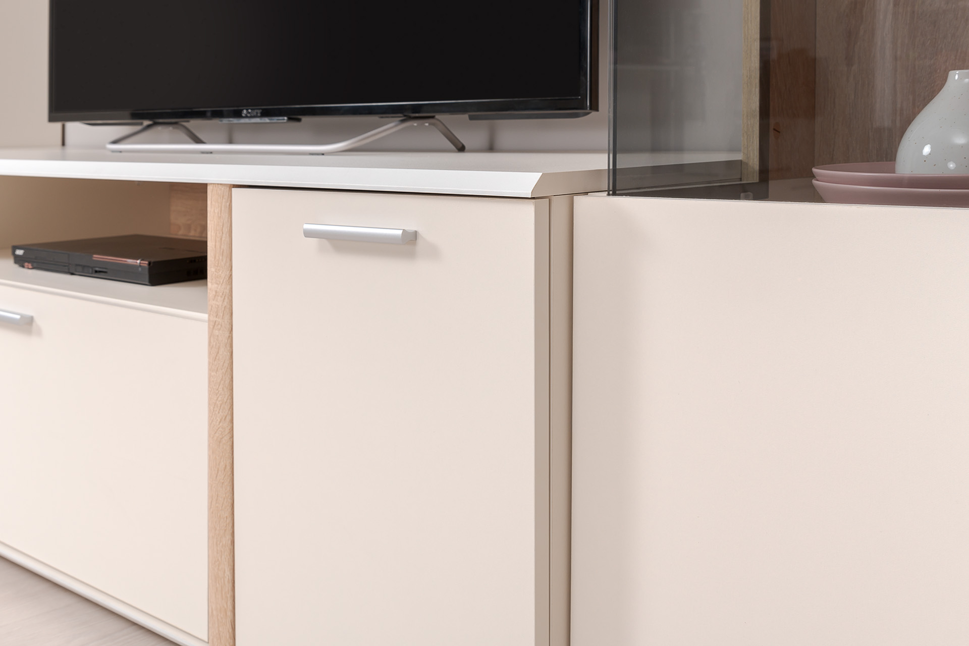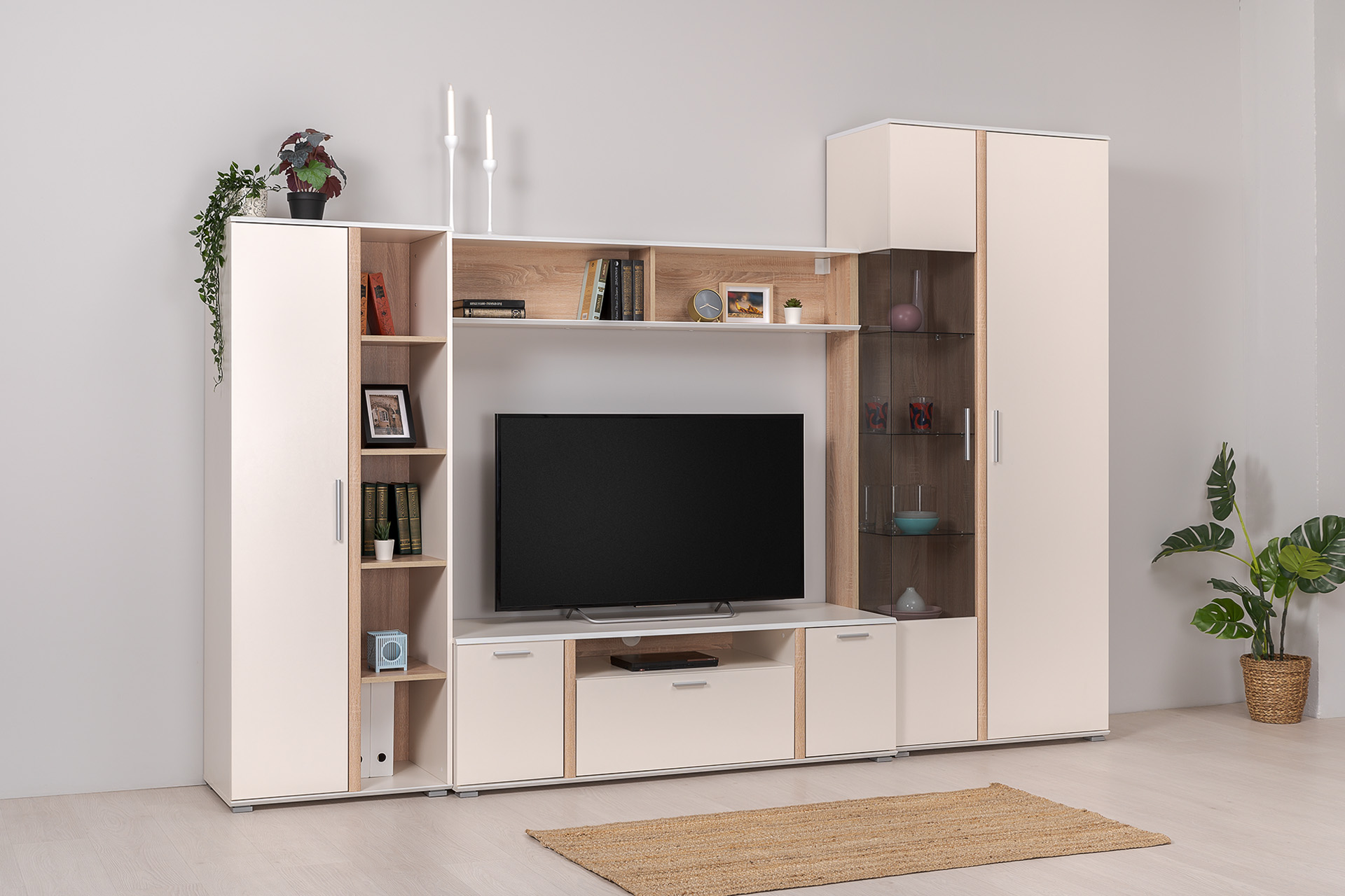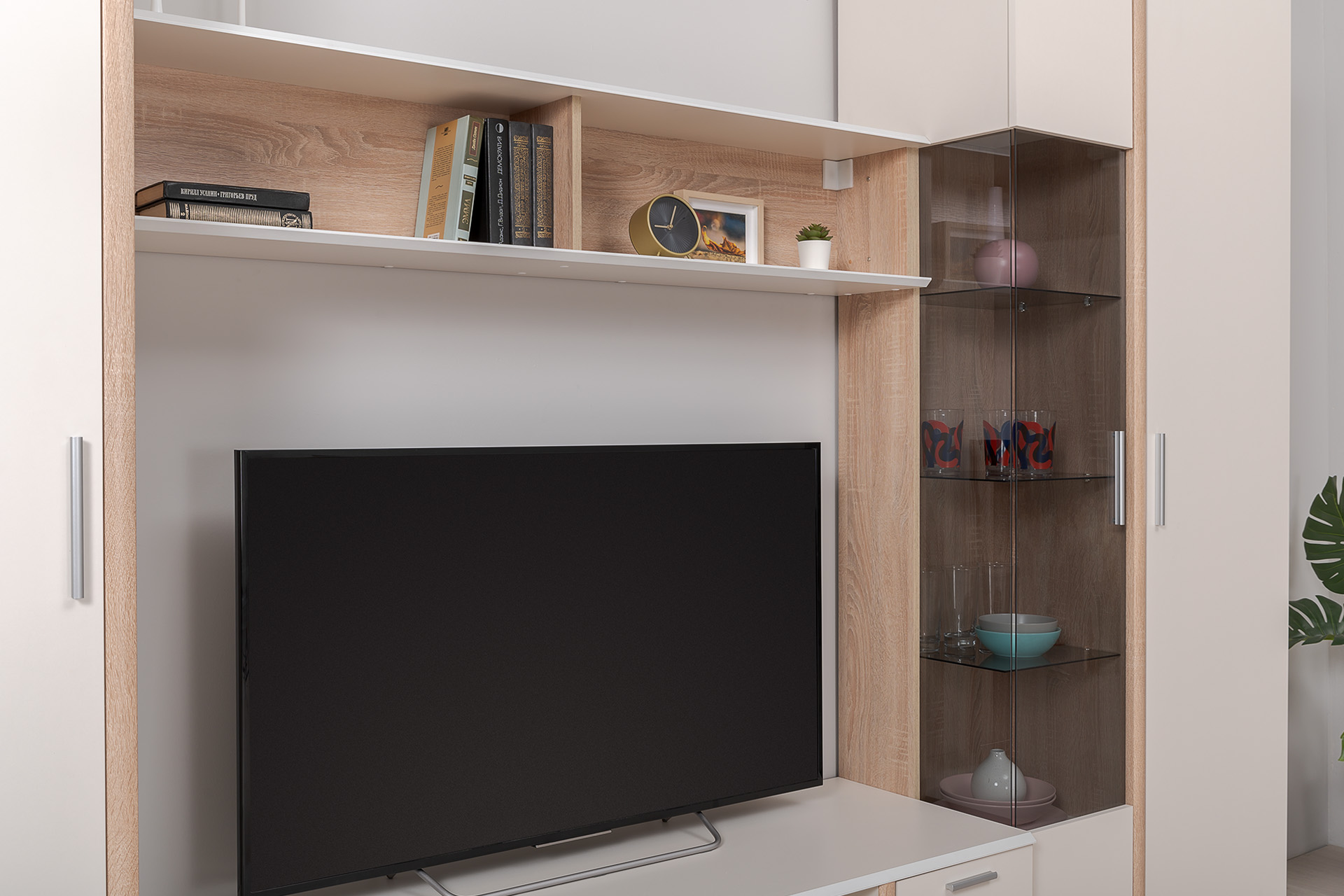Тёплая и приятная цветовая гамма располагает к уюту и комфорту. Акцентом к основному однотонному цвету выступает популярный декор Дуб Сонома.