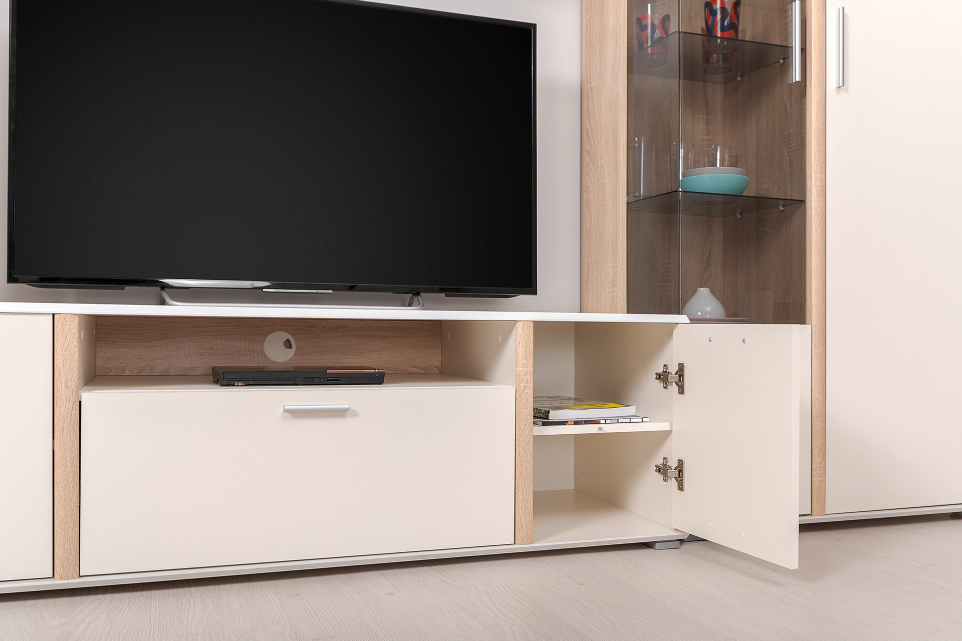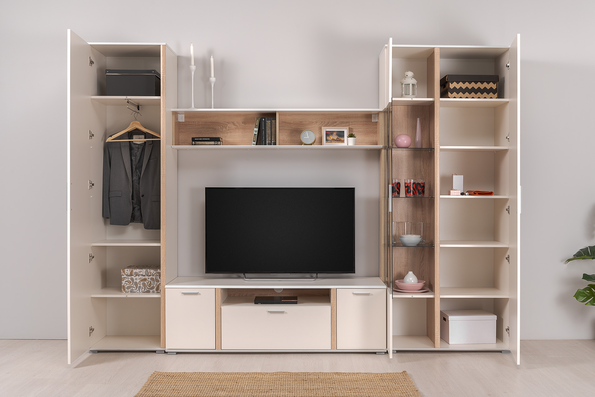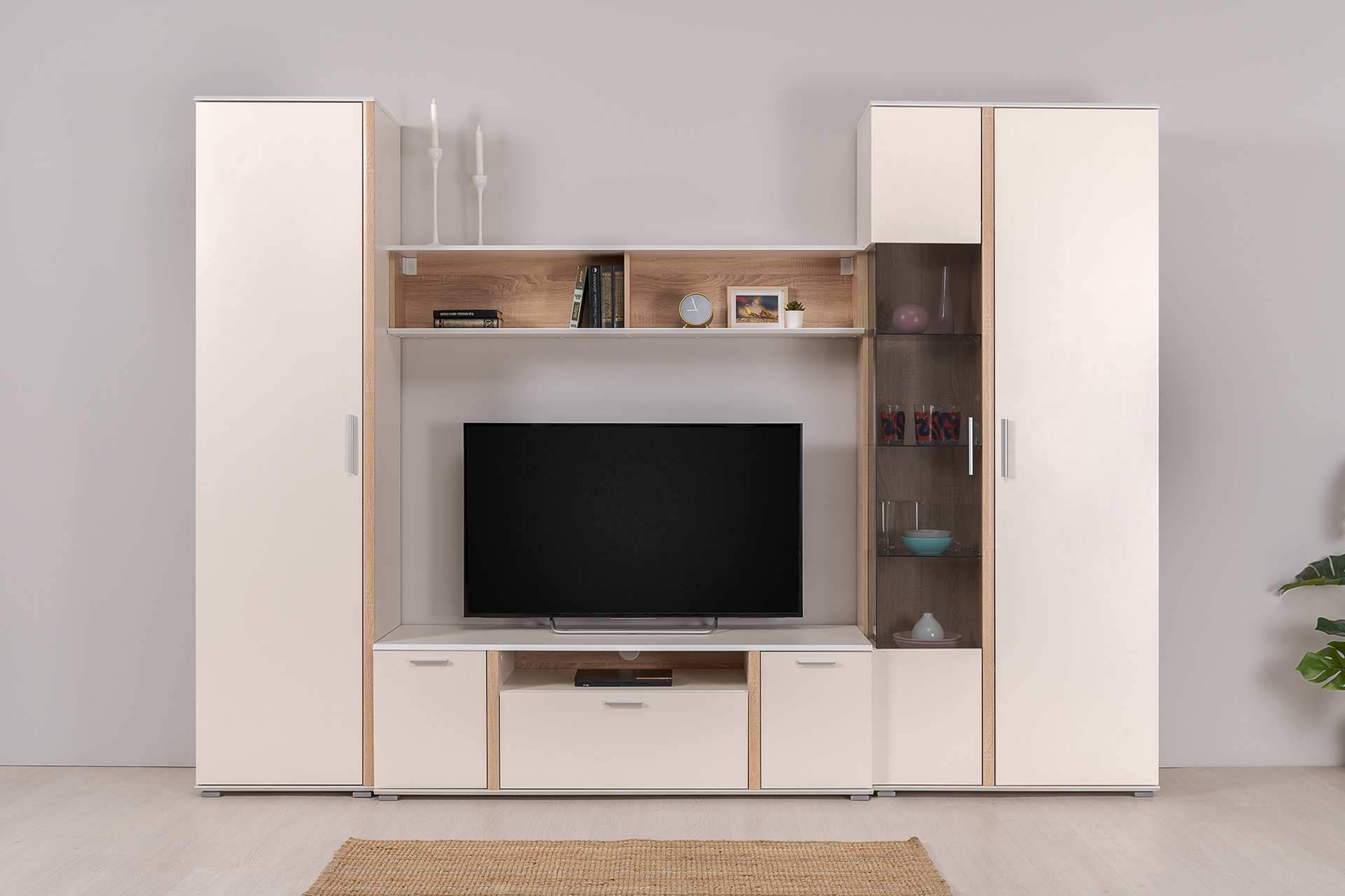 Тёплая и приятная цветовая гамма располагает к уюту и комфорту. Акцентом к основному однотонному цвету выступает популярный декор Дуб Сонома.
