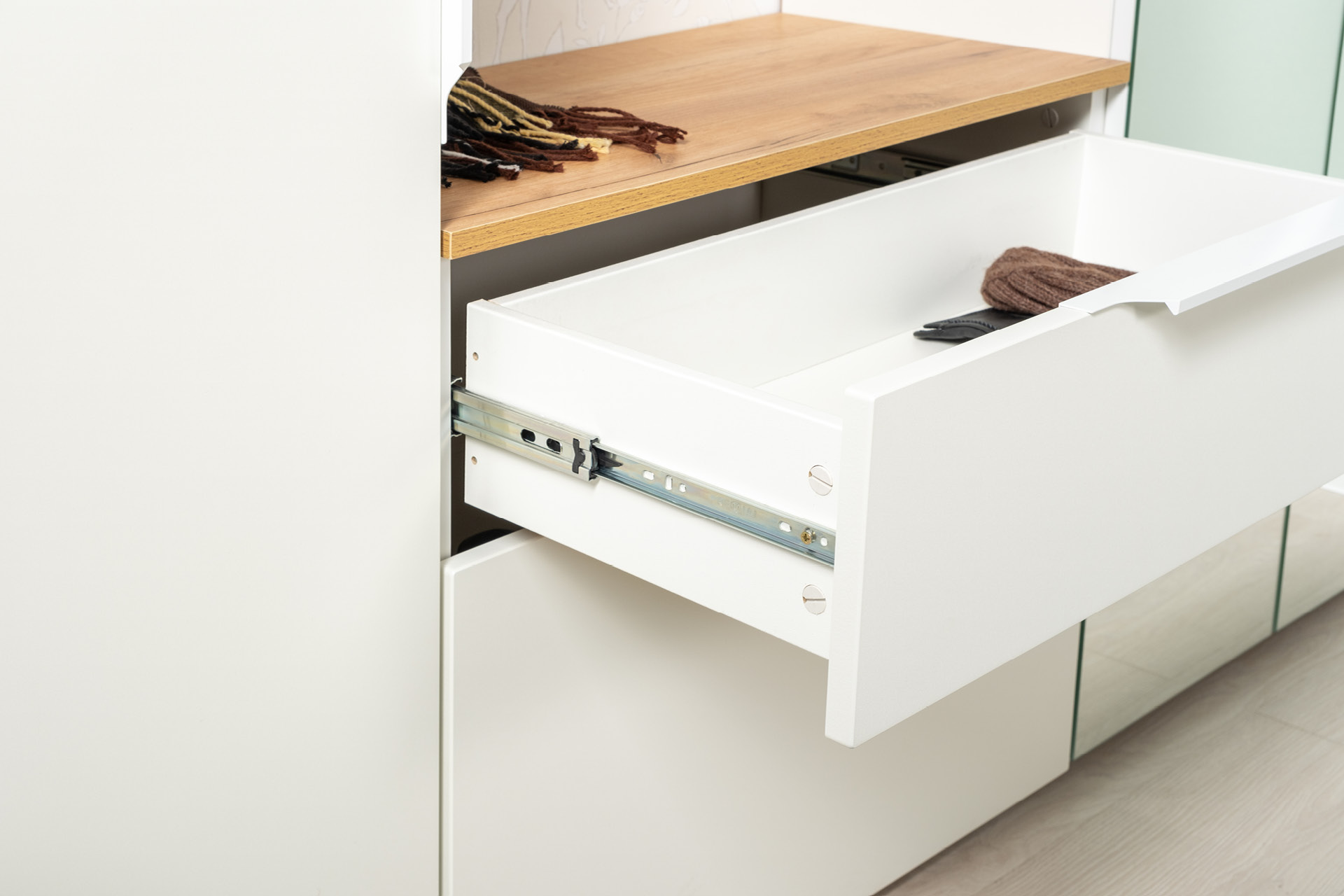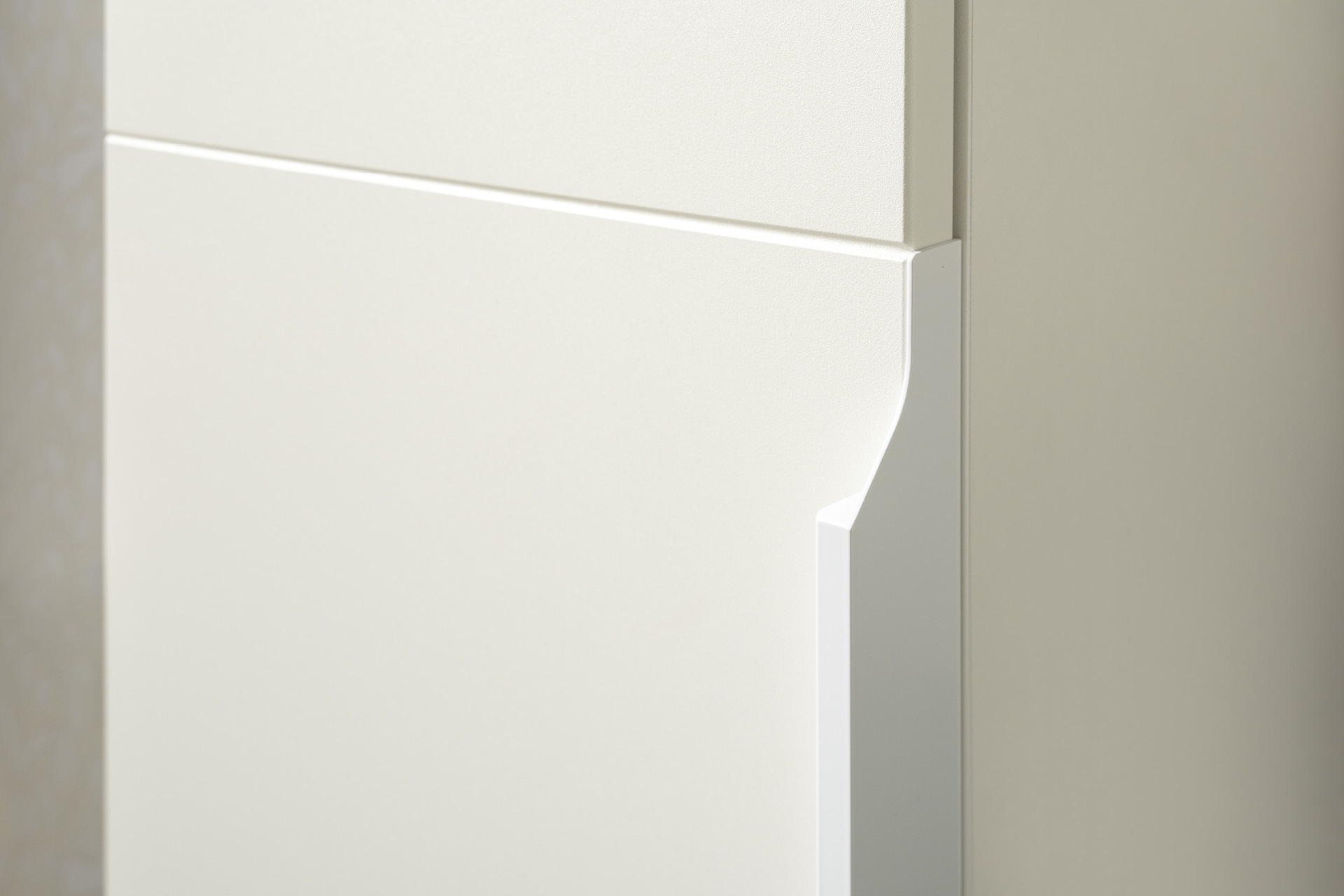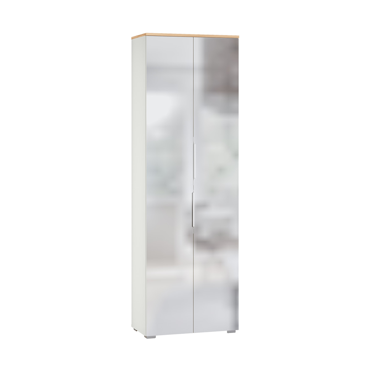 Зеркальные створки шкафа визуально расширяют пространство, а минималистичные алюминиевые ручки подчеркивают легкость и простоту линий.