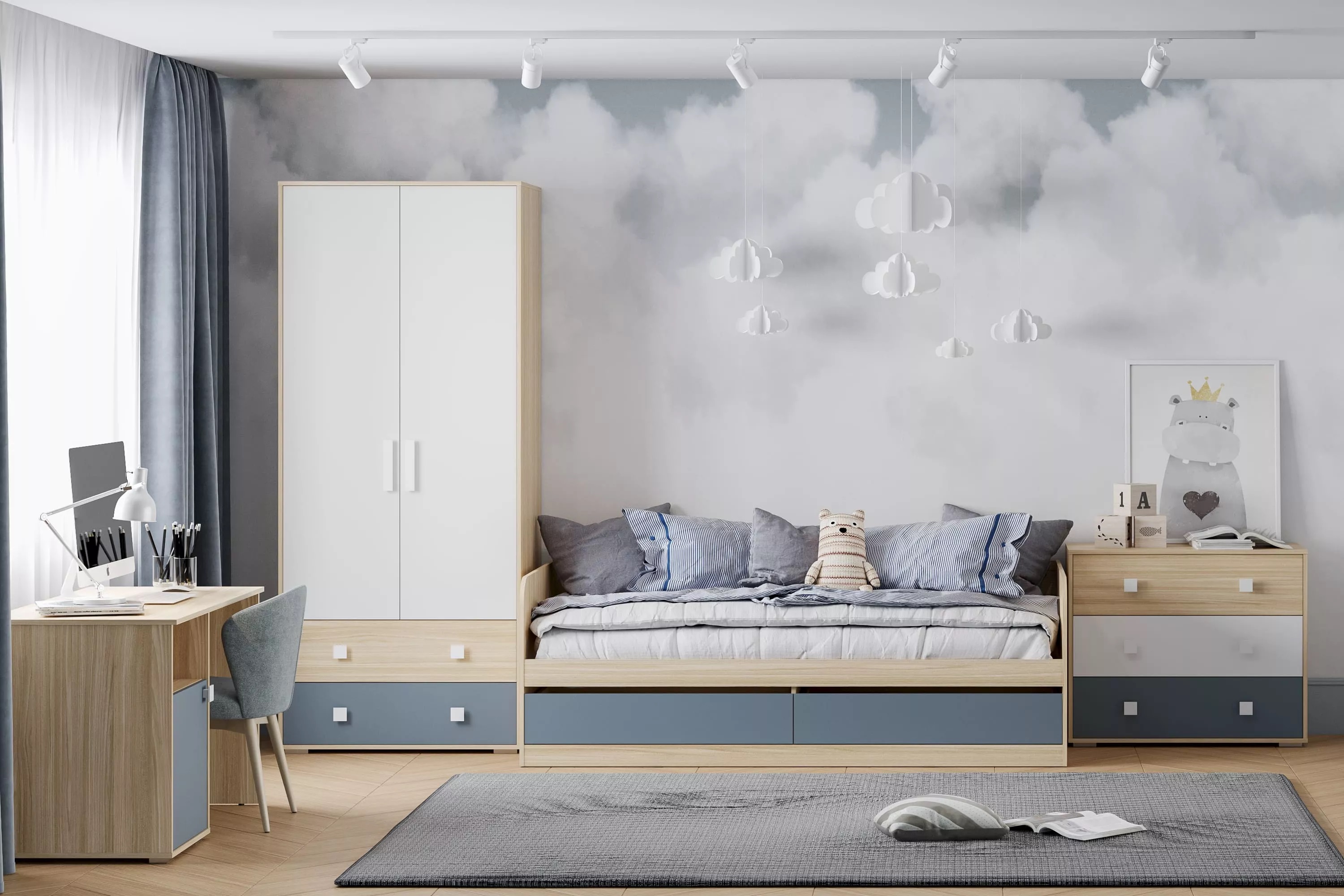 Шкаф для одежды из новой коллекции детской мебели Элиот выполнен в нейтральных оттенках песочного, белого и контрастного маренго – цвета темной морской волны, которые отлично подойдут в комнату как девочки, так и мальчика, сделав ее стильной и современной.