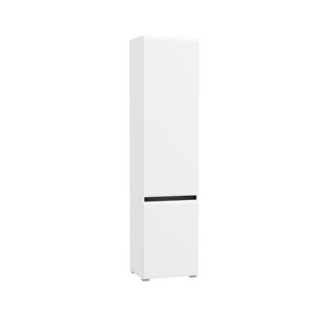 Корпус шкафа выполнен из белой плиты, фасады графично разделены горизонтальной черной полосой из алюминиевого профиля, Распашные двери на четырехшарнирных петлях с доводчиками, открываются за край фасада или нажатием на фасад с помощью механизма push-to-openФрезеровка на фасадах, Светло-серые пластиковые опоры, Универсальная сборка на любую сторону, Корпус: ЛДСП 16 мм, Фасады: МДФ 16 мм.