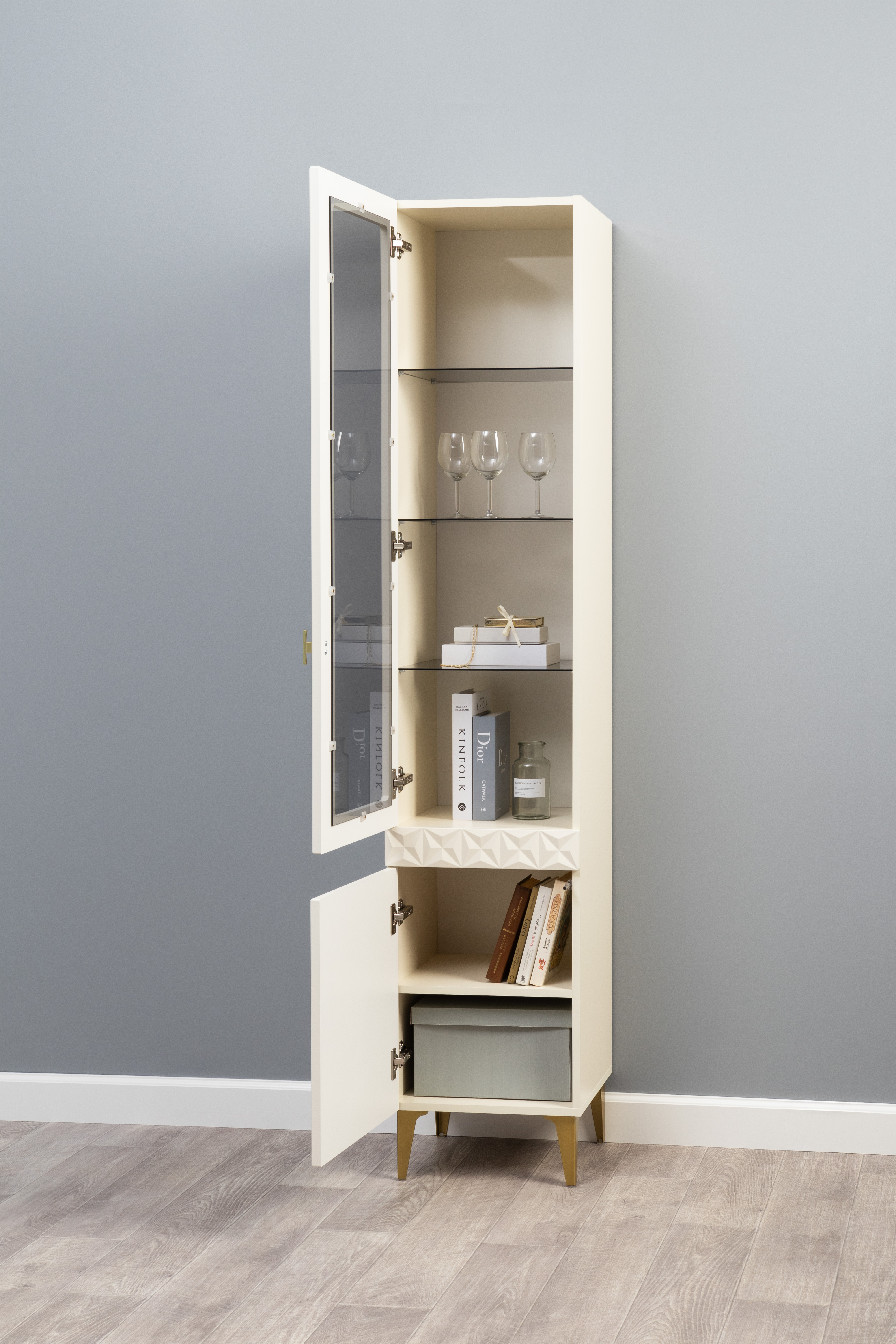 В коллекции представлены три типа витрин с тонированным закалённым стеклом, которые придают пространству лёгкость и свет. «Марион» — идеальное сочетание традиций и актуального дизайна в каждой детали.