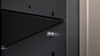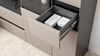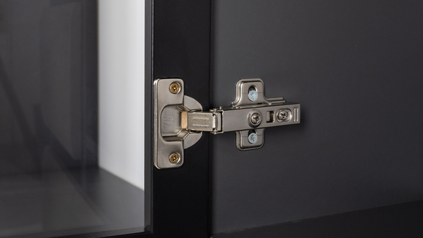 Фасады открываются за край либо нажатием (механизм push-to-open). Распашные фасады оснащены доводчиками. Полка крепится к боковинам соседних модулей.