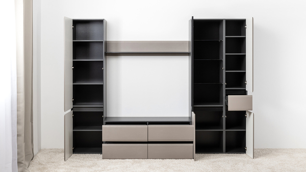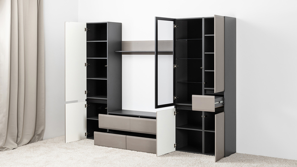 Акцентом выступают чёрные горизонтальные вставки и тонированное стекло витрины. Чёрная задняя стенка эффектно подчеркивает наполнение шкафов.