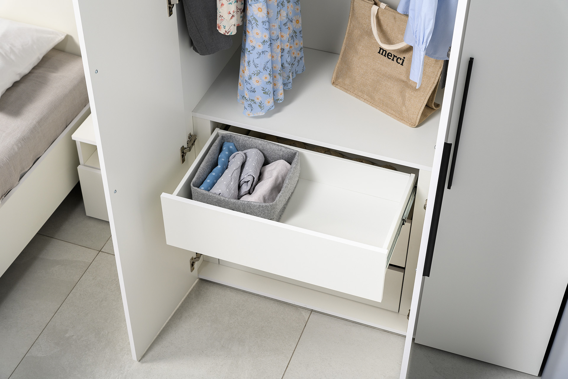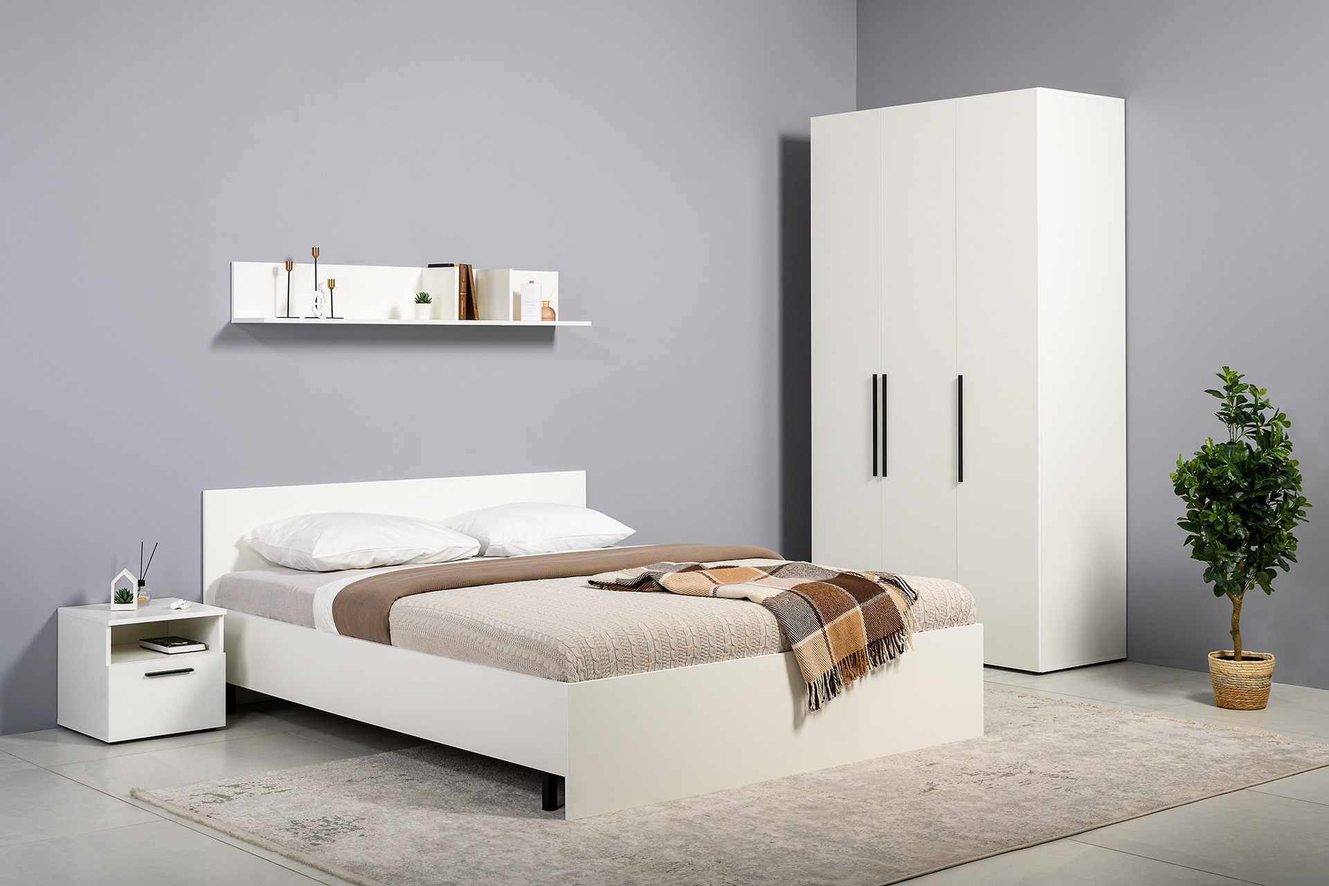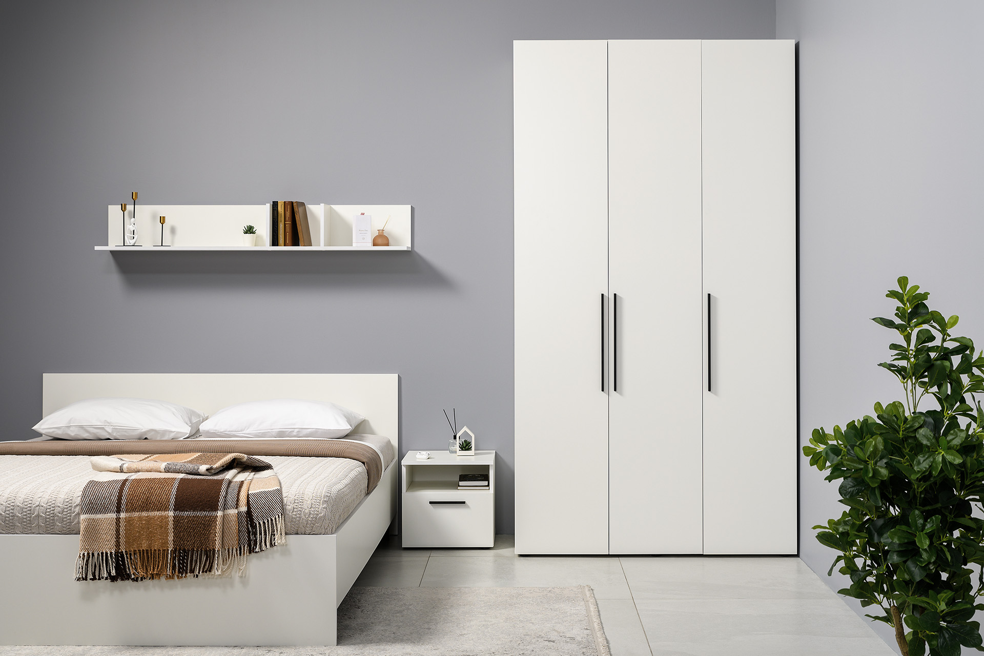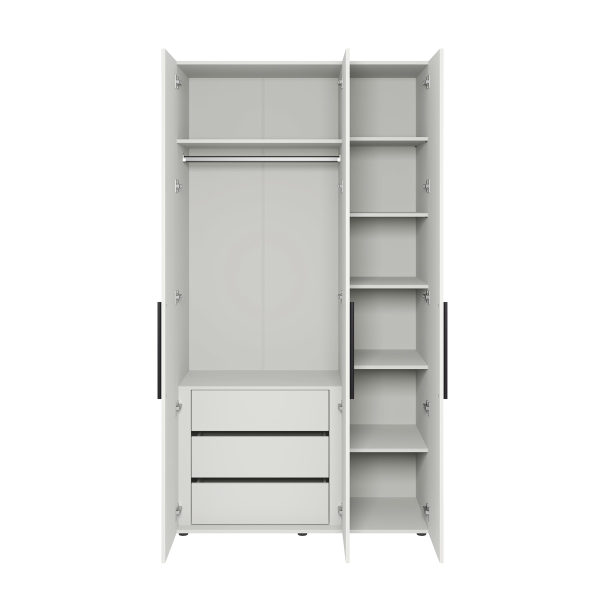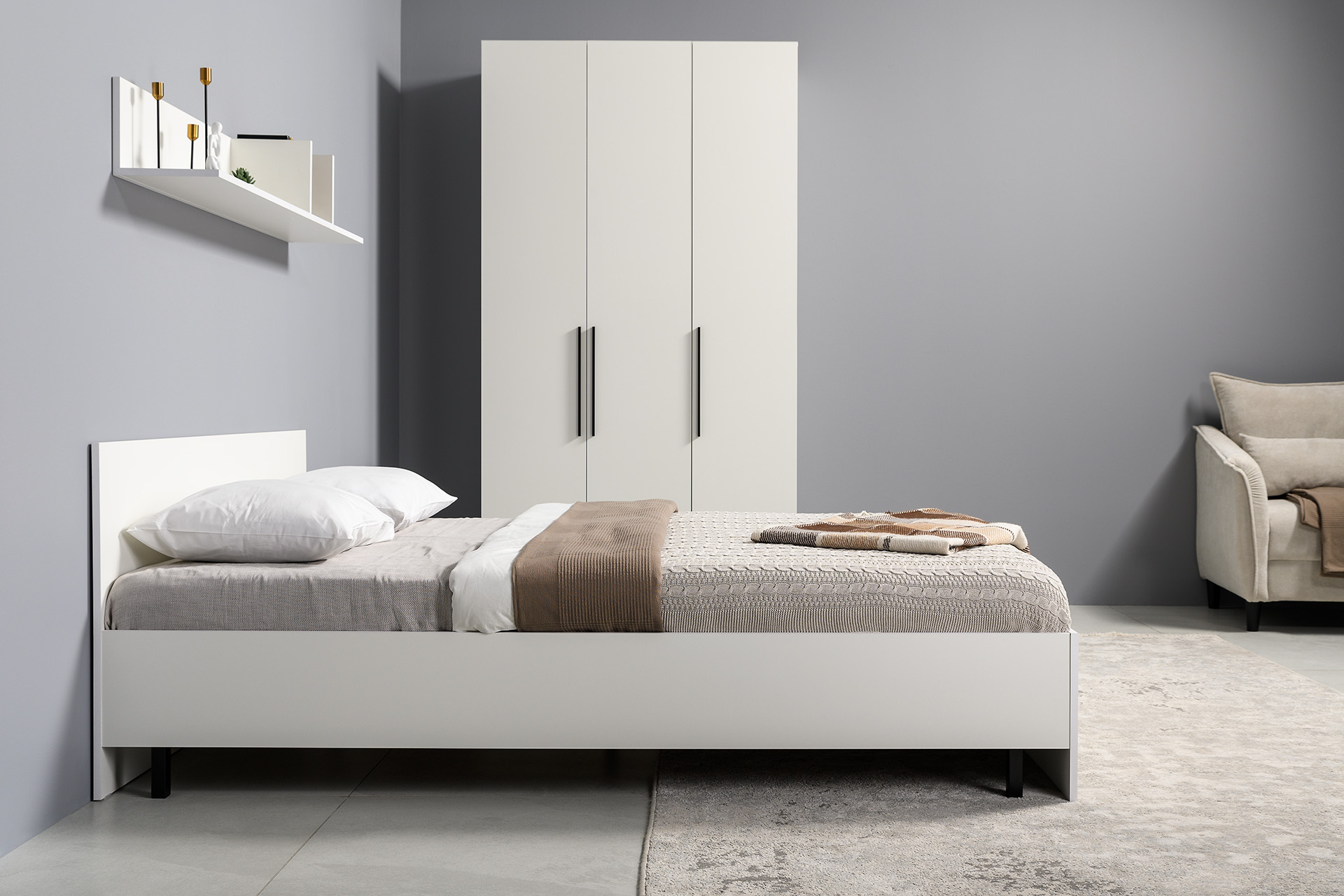 Два варианта кровати: ширина спального места 1200 и 1600 мм. Вместительный трёхстворчатый шкаф полноценной глубины с выдвижными ящиками и съемными полками. Ящики оснащены направляющими полного выдвижения.
