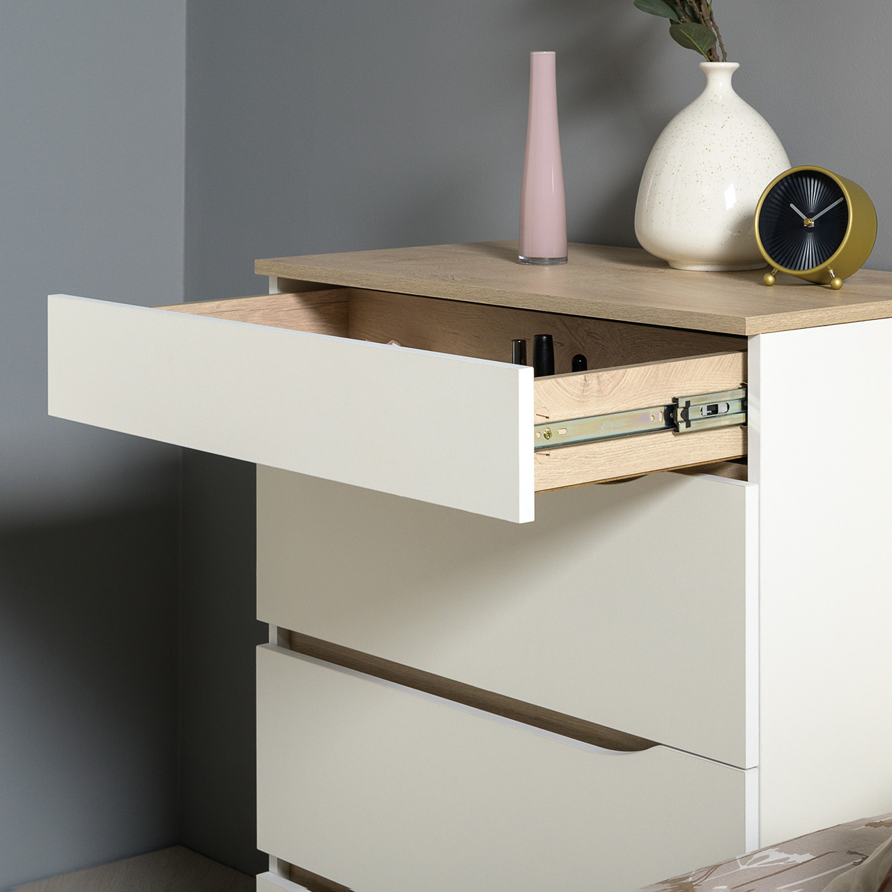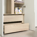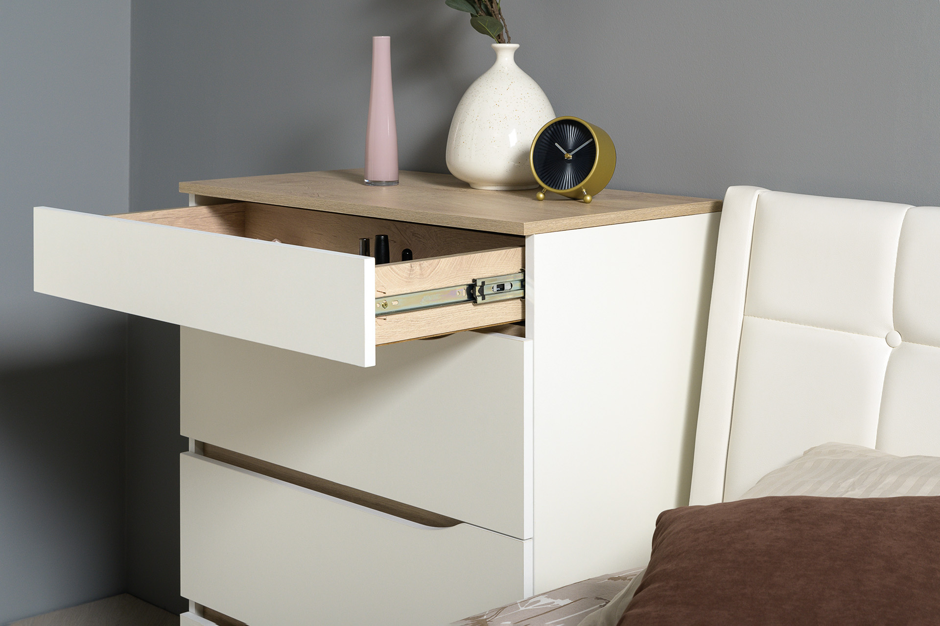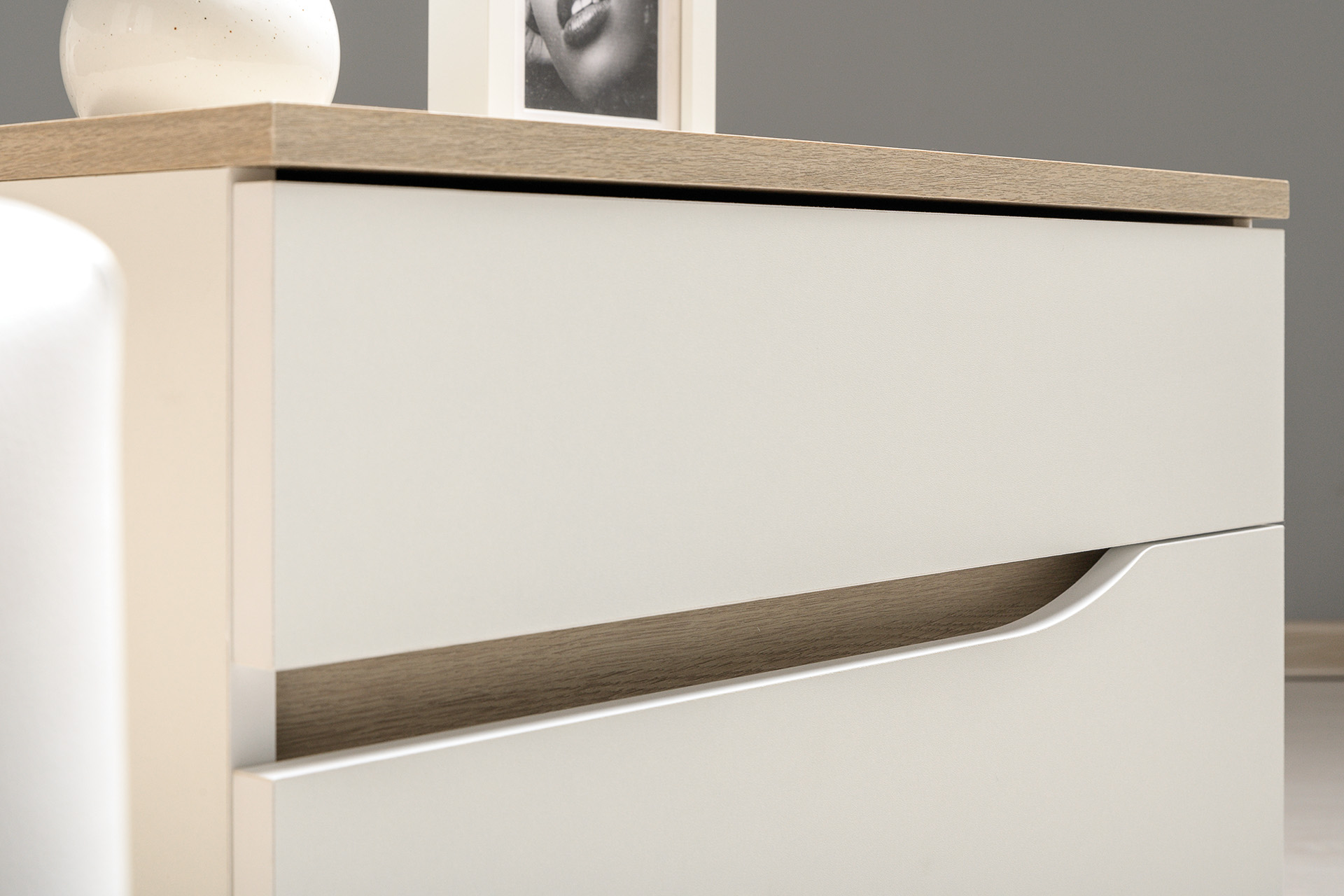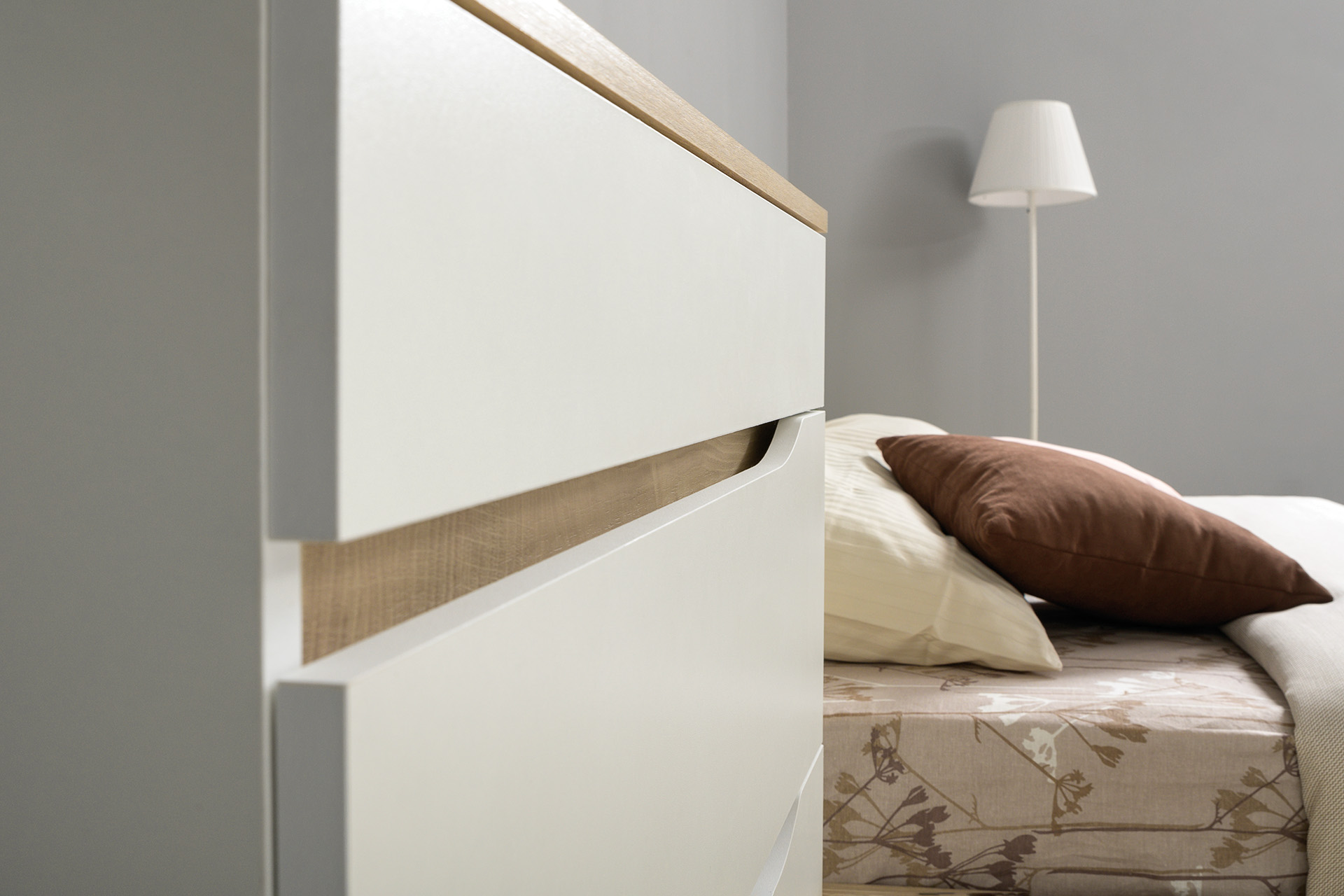 Лицевую фурнитуру заменяет стильный вырез, за которым видно древесный декор корпуса. Вырезы делают внешний вид изделий асимметричным, что делает композицию современной и динамичной.