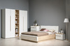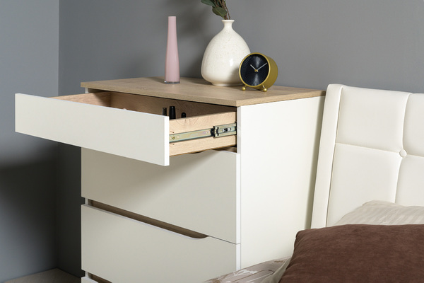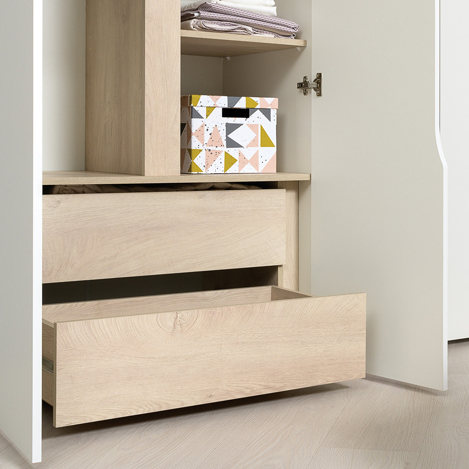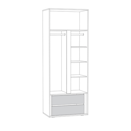 Наполнение шкафа может собрано на любую сторону, два выдвижных ящика скрыты за распашными фасадами, на обратной стороне которых размещается зеркало.