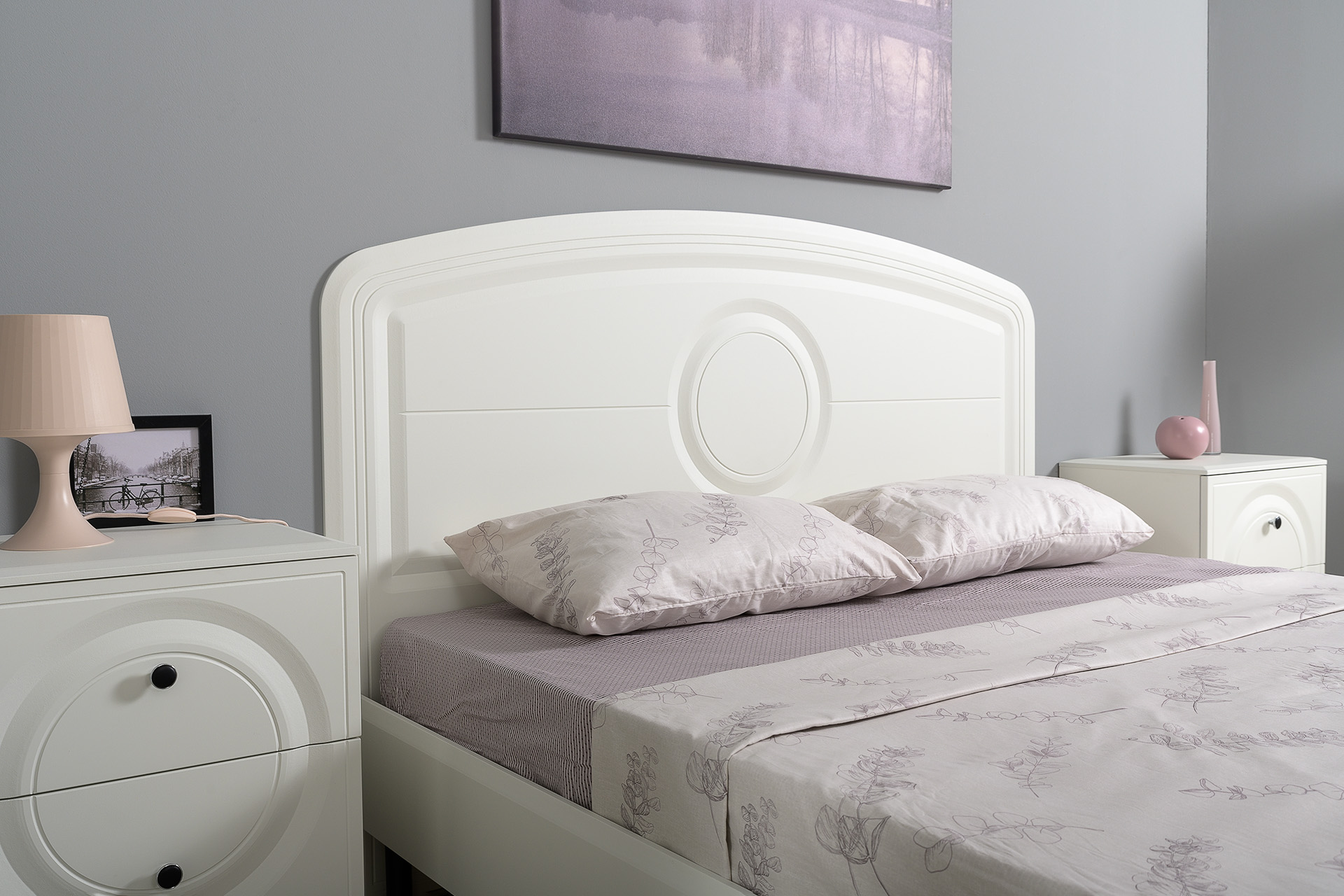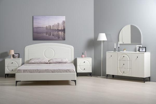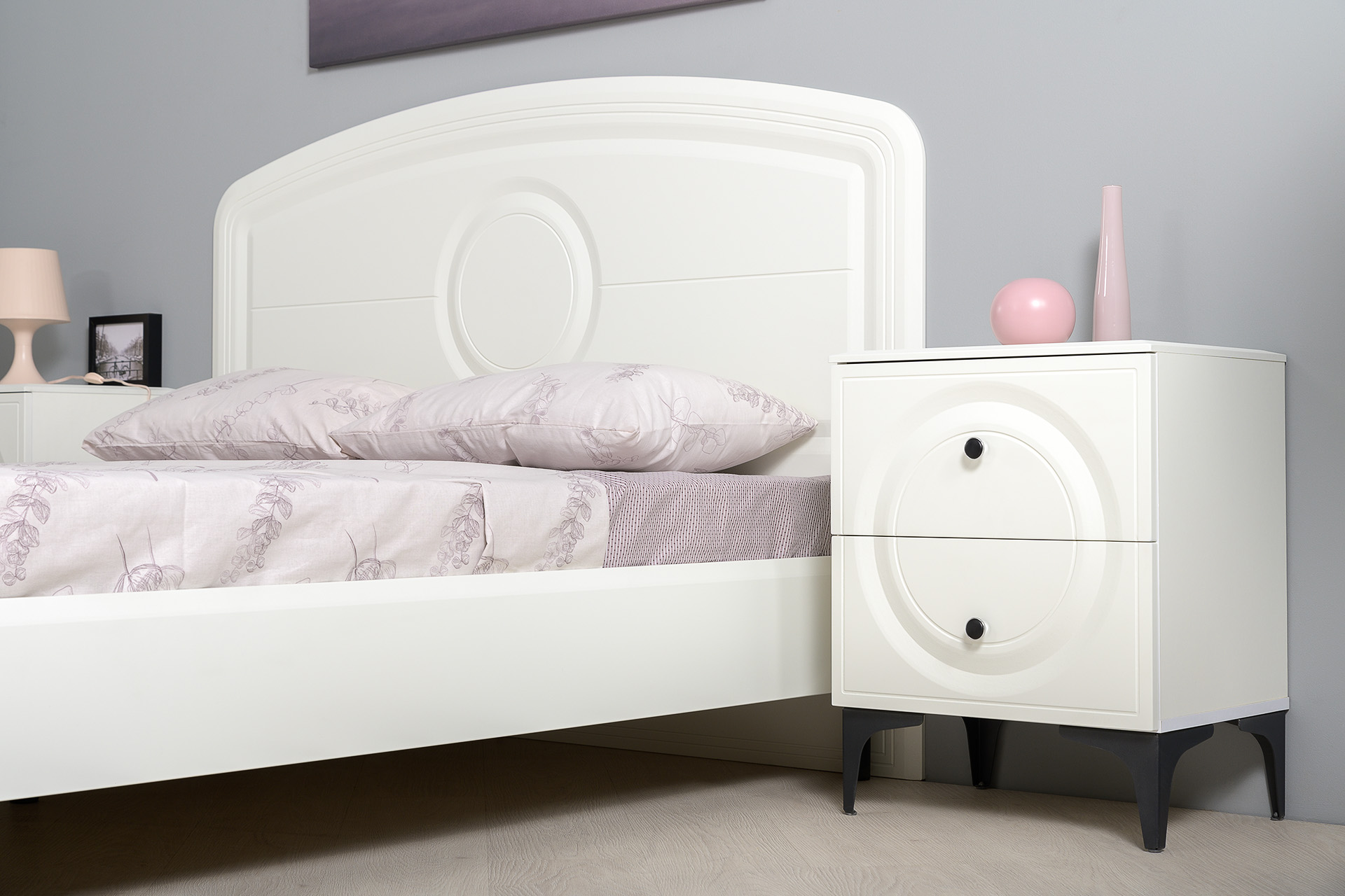 Основным декоративным элементом коллекции является круг. Явно представленный фрезеровкой по фасадам тумбы, комода, в изголовье кровати и ручках-кнопках.