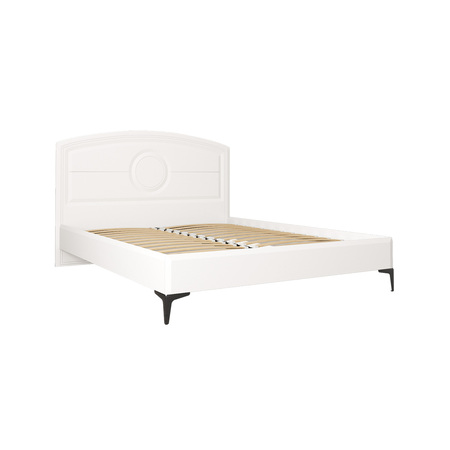 Кровать установлена на высокие ножки, что делает конструкцию лёгкой и воздушной, изголовье кровати декорировано пышным мягким элементом. Матрас укладывается на ортопедическое основание с гнутоклееными ламелями.