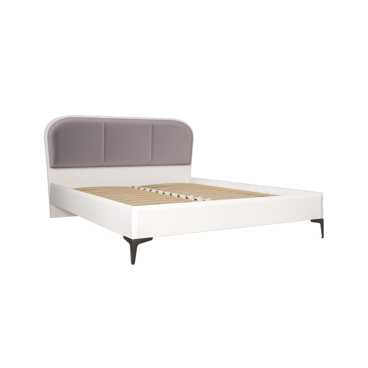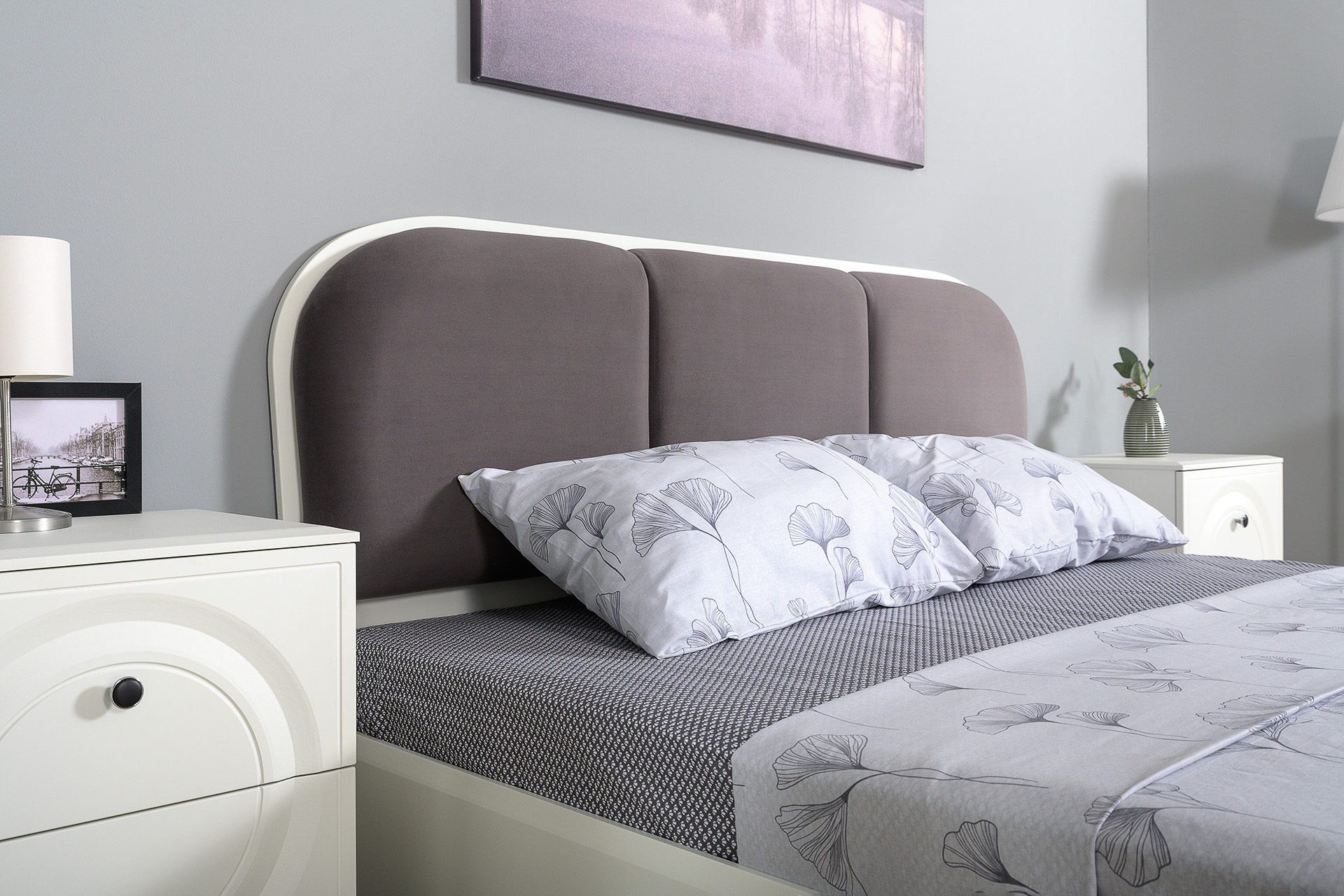 Кровать установлена на высокие ножки, что делает конструкцию лёгкой и воздушной, изголовье кровати декорировано пышным мягким элементом. Матрас укладывается на ортопедическое основание с гнутоклееными ламелями.