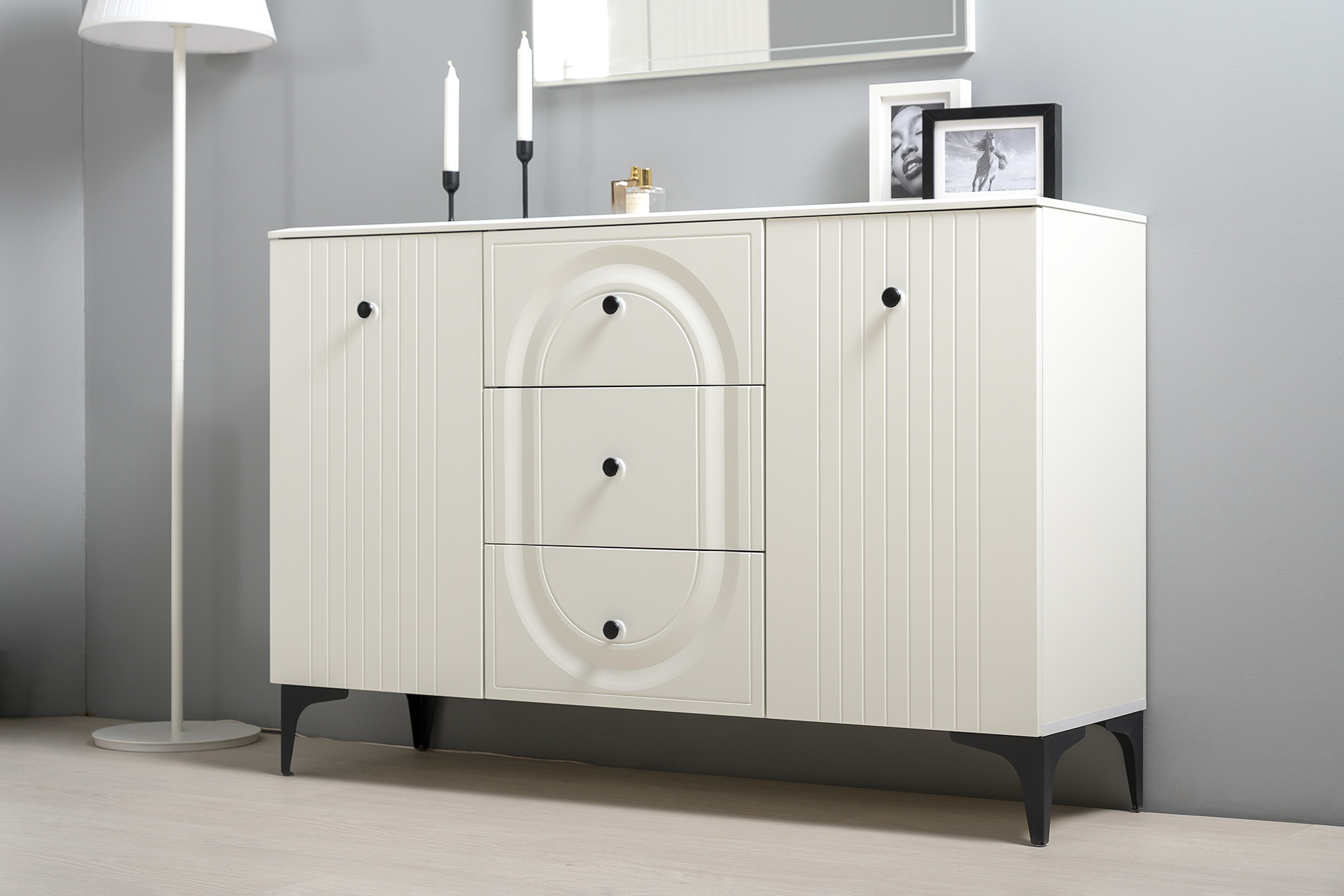 Вся лицевая фурнитура металлическая, графичное и стильное сочетание черного и хромированных деталей эффектно расставляет акценты на мебели.
