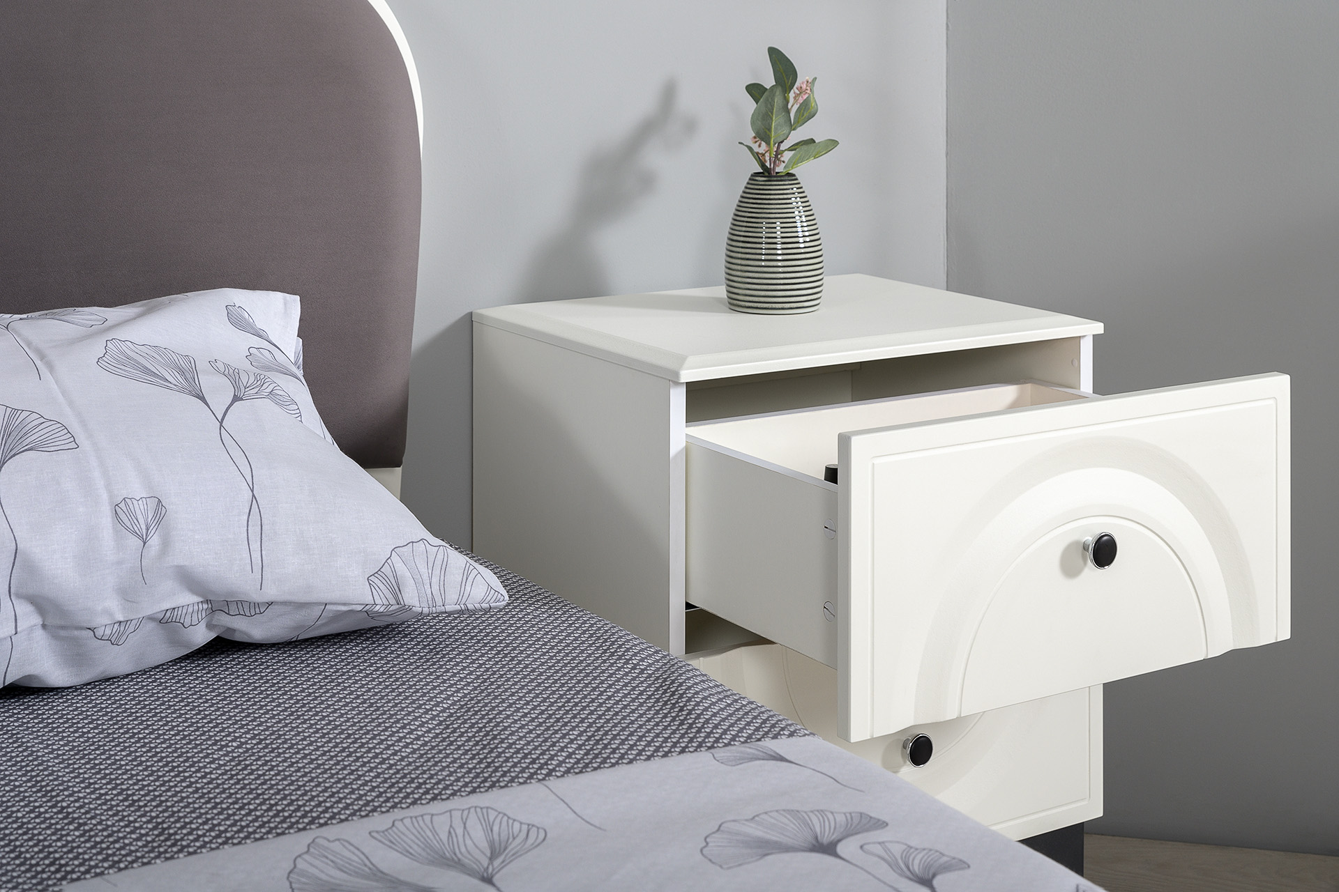Основным декоративным элементом коллекции является круг. Явно представленный фрезеровкой по фасадам тумбы, комода, в изголовье кровати и ручках-кнопках.