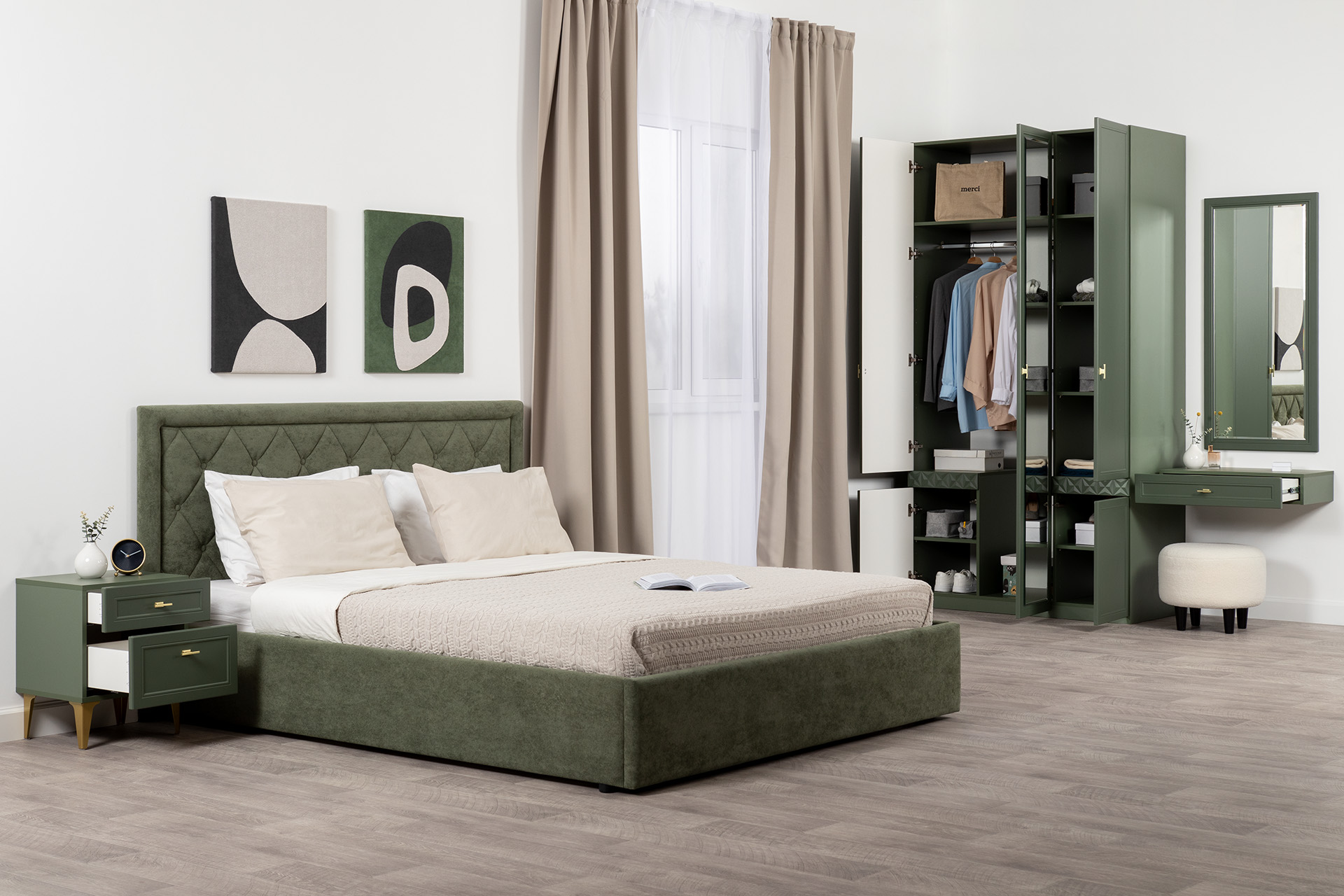 Спальня Дакота композиция 1 меренга, белый, с кроватью Ингрид/Ingrid 1600 велюр ультра смог/ultra smoke, пуф Альба 450 велюр ультра смог/ultra smoke