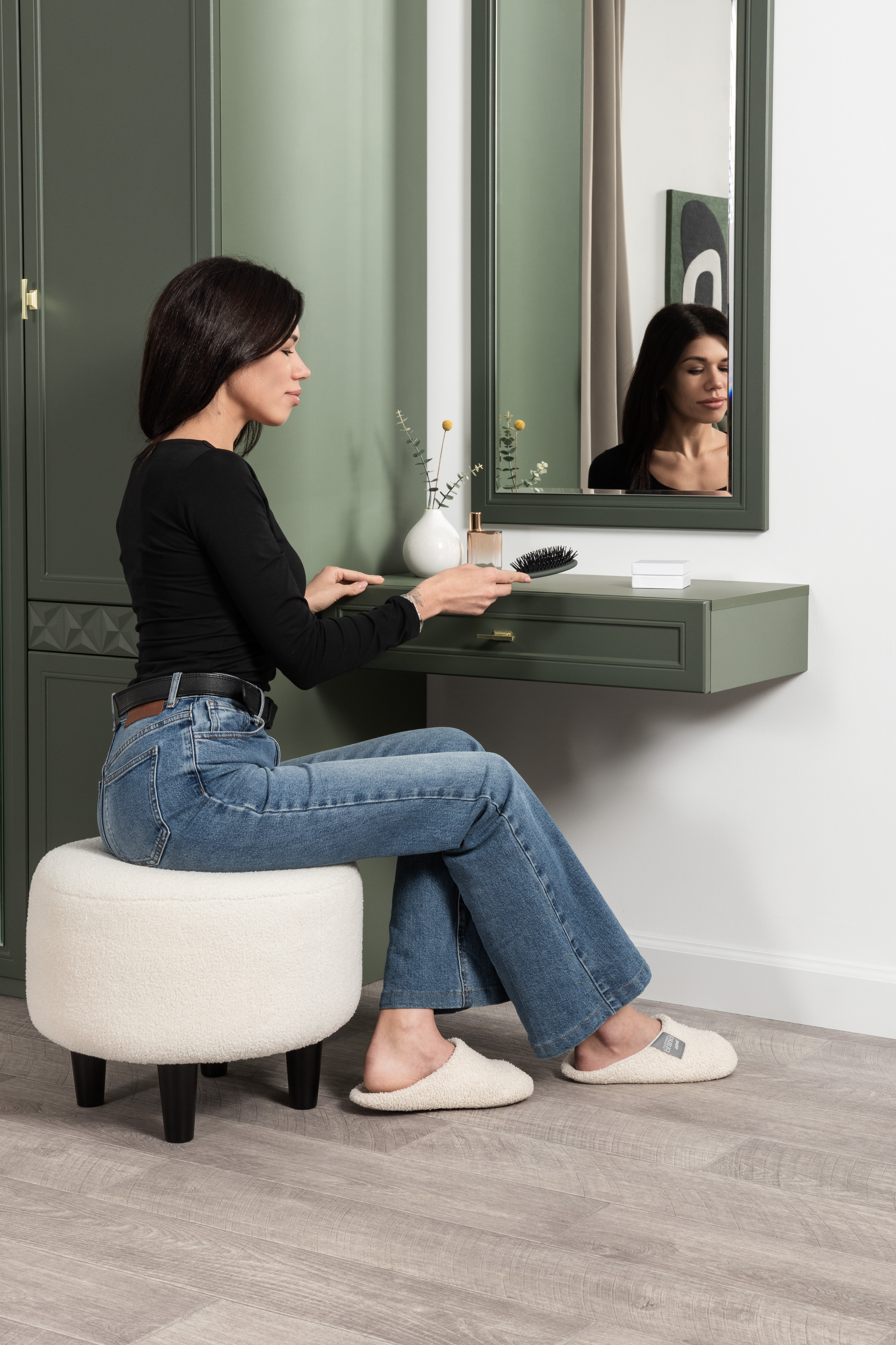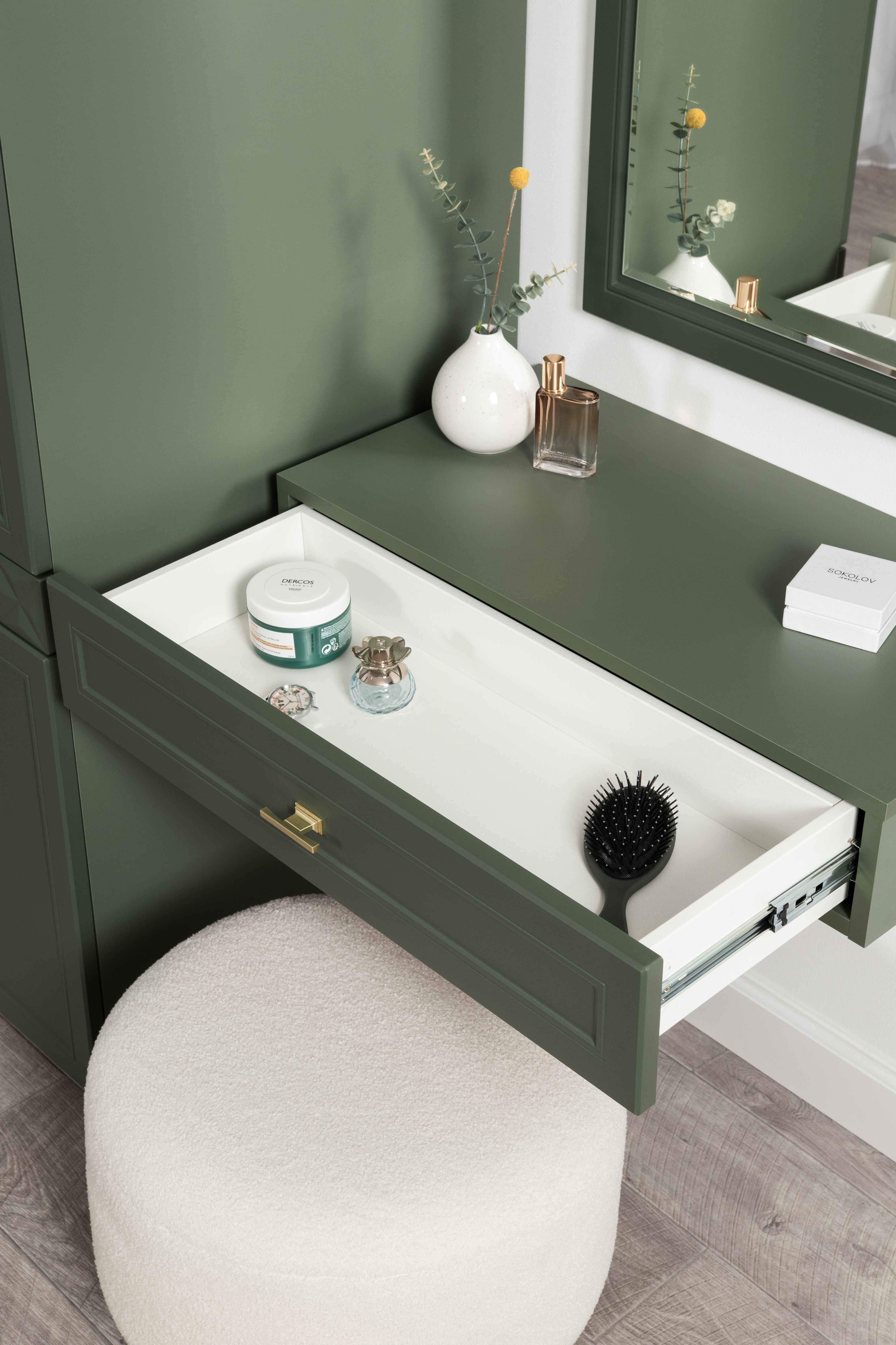 Комод Марион 16.256 дымчатый зеленый K521, олива шагрень AG 1050 ПВХ, белый PE шагрень