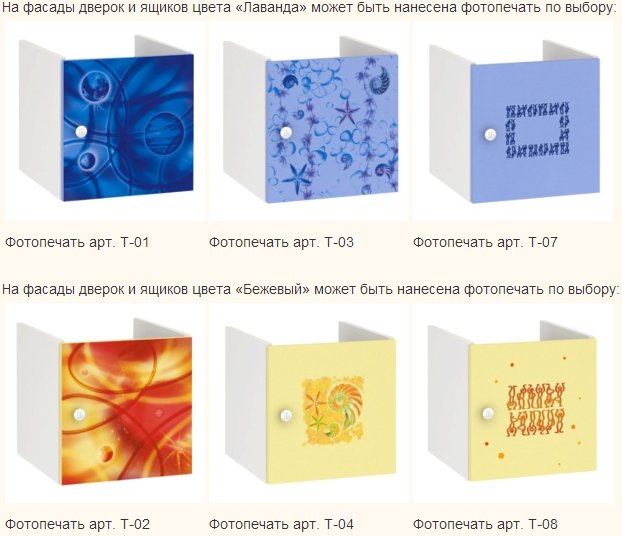 На фасады дверок и ящиков цвета «Лаванда» наносится изображение по выбору: арт. Т-07.