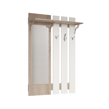 Планки для навешивания вешалки на стену в комплекте, открытая полка для шапок и аксессуаров, три декоративных пластиковых кронштейна поддерживающих полку для шапок и аксессуаров, двойные боковые крючки и тройной центральный позволят разместить больше одежды, задняя сетенка сохранит настенное покрытие, зеркало с еврообработкой по периметру, кромка ПВХ 0,4 мм, пластиковые крючки.