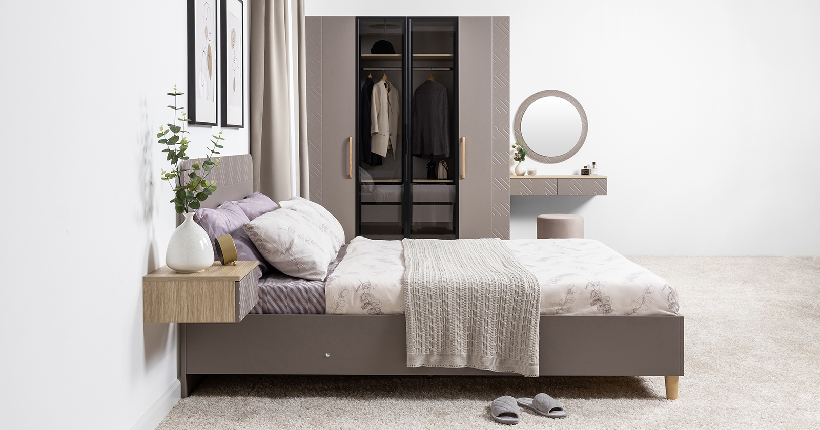 Подвесные консоли и велюровый пуф в тон фасадов дополняют сдержанный и благородный облик спальни Амьен.